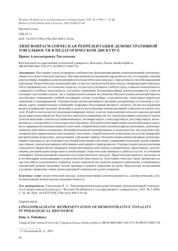 Настоящая статья посвящена особенностям функционирования коммуникативной демонстративности в педагогическом дискурсе. Научная новизна исследования определяется тем, что впервые описана дискурсивная специфика демонстративности в педагогическом дискурсе, определены ее способы выражения и функции. Педагогическое взаимодействие с классом строится на балансе между эмоциональной самоподачей и сдержанностью, что позволяет педагогу создать продуктивную учебную среду, повысить вовлеченность учащихся в учебную деятельность, улучшить понимание. Коммуникативная демонстративность учителя оказывает как положительное, так и отрицательное влияние на учеников. Положительная демонстративность способствует повышению учебной мотивации, создает атмосферу сотрудничества, стимулируя творческое мышление и самовыражение. Отрицательная демонстративность вызывает раздражение и утомление у учеников, утрату доверительных отношений, подрывает безусловный авторитет педагога. Целью исследования является выявление ведущих функций и средств актуализации демонстративной тональности в речи учителя. В работе используется междисциплинарный подход и метод психолингвистического анализа речевой продукции коммуникантов. В результате анализа устанавливается, что демонстративная тональность в речи учителя выполняет контактоустанавливающую, мотивирующую, стимулирующую, регулирующую, кооперативную, суппортивную и консолирующую функции. Положительная нарративная демонстративная тональность выражается положительными эпитетами, гиперболическими тропами и фразеологизмами, демонстративными действиями кооперации, биографическими реминисценциями, я-модальностью, мы-модальностью, эмоционально окрашенными констативами, глаголами с гиперболической семантикой, антитезой, инверсией, риторическими вопросами, дискурсивами в функции эмфазы. Положительная манипулятивная демонстративная тональность актуализируется гиперболическими глаголами, сравнением-аллюзией, реквестивами, квестивами, демонстративными действиями консоляции и перформансом. Отрицательная демонстративная тональность оформляется говорящим демонстративными действиями-устрашениями, директивами, экспозитивами, риторическими вопросами и комиссивами. Теоретическая значимость работы состоит в уточнении специфики демонстративной тональности в педагогическом дискурсе. Практическая ценность заключается в оптимизации коммуникации в педагогической деятельности, получении учителем таких преимуществ, как способность вдохновлять учащихся, делать занятия более увлекательными и значимыми, устанавливать адекватный уровень ожидания, четкие границы и правила поведения на уроке. Перспективу исследования составляет выявление типов демонстративной тональности в речи учащихся.