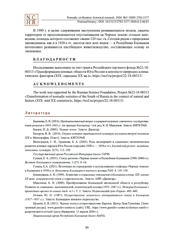 На сегодняшний день изучение истории сельского хозяйства страны и основных ее отраслей в предвоенные годы представляет большой интерес для историков, обществоведов, политологов, что, в свою очередь, обусловлено рядом общественно-политических факторов. Именно в 1930-е гг. СССР окончательно становится страной победившего социализма, где ускоренно проводится индустриализация, реализуется курс на коллективизацию сельского хозяйства. Процесс преобразования сельского хозяйства страны был непростым несмотря на видимую его успешность, изобиловал драматическими событиями и трагическими коллизиями. Вчерашним калмыцким кочевникам пришлось развивать сельскохозяйственное производство в необычайно затруднительных природно-климатических условиях на пустынной и полупустынной территории степного региона — Черных землях. В данной статье нами будет рассмотрена ситуация в Калмыцкой автономной области, сложившаяся в этот период на отгонных пастбищах, когда люди столкнулись с таким природным катаклизмом, как засуха, вызвавшая зуд (бескормицу), тем самым осложнив и без того непростой процесс содержания скота и ухода за ним. Впервые проводится анализ деятельности Центра и местных органов власти, хозяйственных структур в таких экстремальных условиях. Описываются и анализируются конкретные шаги советской власти, направленные на выход из создавшегося критического положения. Результаты исследования дают обширное представление о методах и стиле работы руководителей всех уровней по сохранению общественного поголовья в сложных природно-климатических условиях Черных земель и в чрезвычайной ситуации зуда в осенне-зимний период 1930–1931 гг.