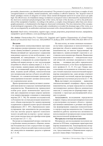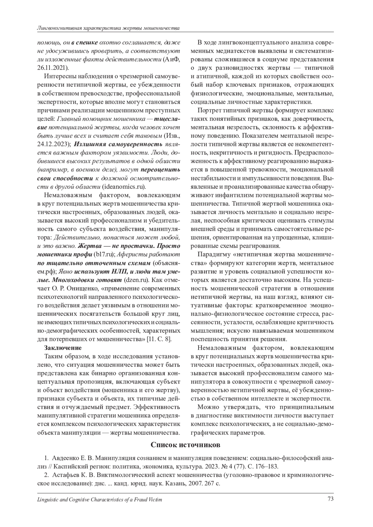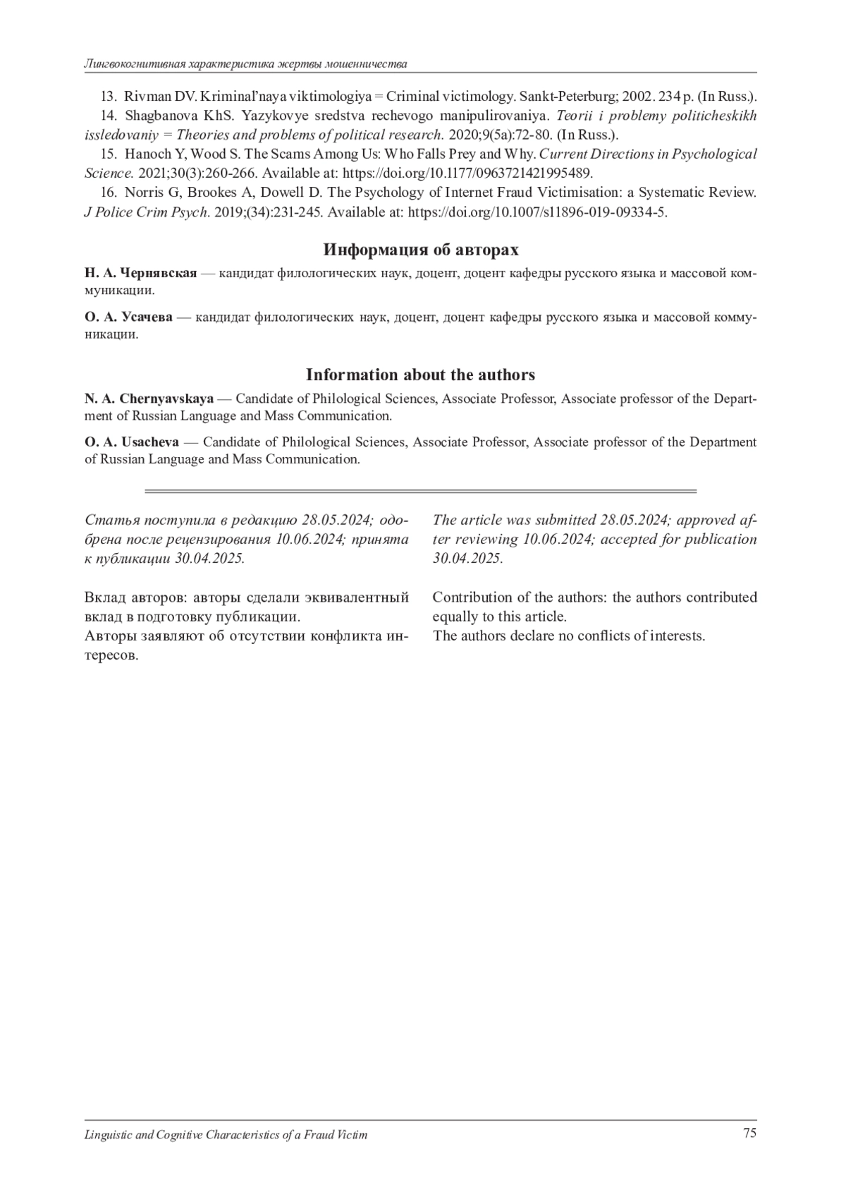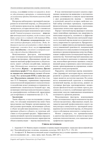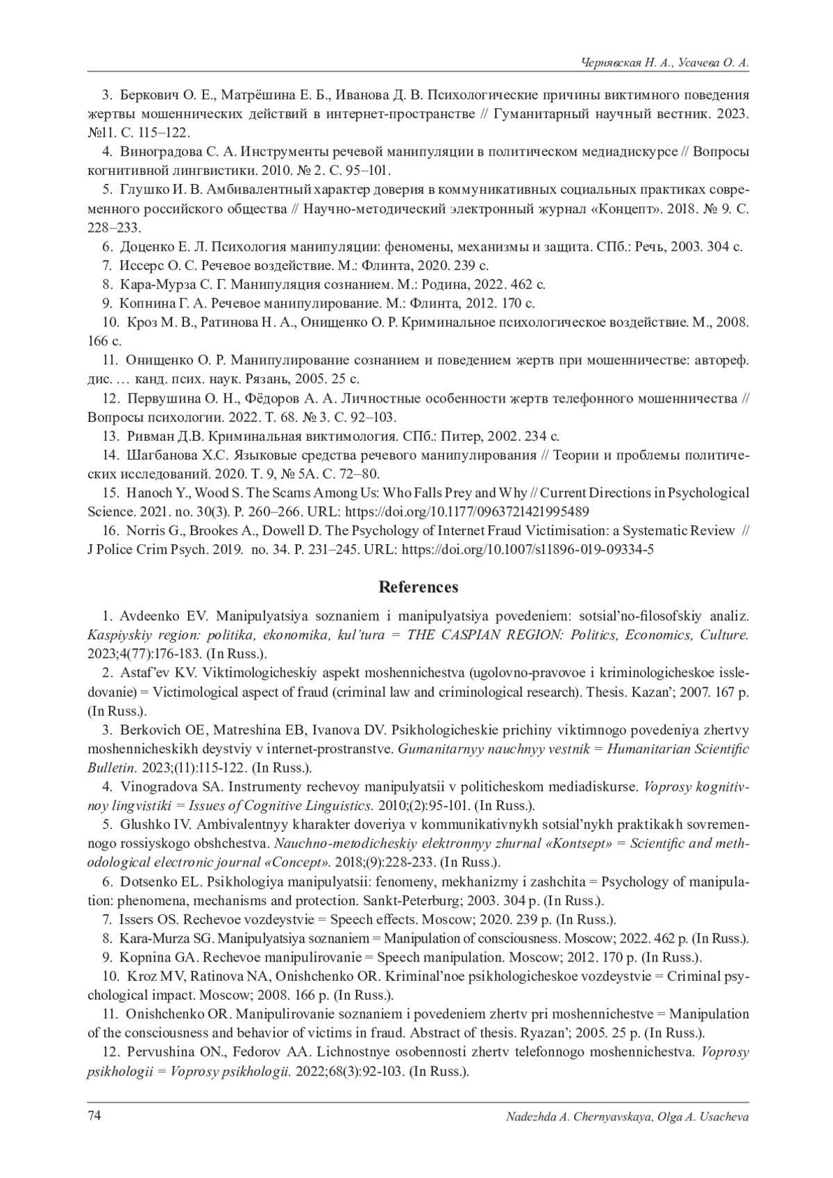 3. Беркович О. Е., Матрёшина Е. Б., Иванова Д. В. Психологические причины виктимного поведения жертвы мошеннических действий в интернет-пространстве // Гуманитарный научный вестник. 2023. №11. С. 115-122. EDN: NODGHA