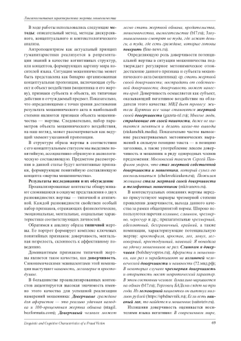 Статья представляет собой междисциплинарное исследование социально значимого феномена мошенничества с преимущественным вниманием к лингвокогнитивной интерпретации виктимного поведения. Предметом рассмотрения являются когнитивные признаки, формирующие понятийную составляющую концепта «жертва мошенничества». В ходе лингвоконцептуального анализа современных медиатекстов выявлены и систематизированы сложившиеся в социуме представления о двух разновидностях жертвы - типичной и атипичной, каждой из которых свойствен особый набор доминантных признаков, отражающих физиологические, эмоциональные, ментальные, социальные личностные характеристики. Портрет типичной жертвы формирует комплекс таких понятийных признаков, как доверчивость, ментальная незрелость, склонность к аффективному поведению. Парадигму «нетипичная жертва мошенничества» составляют категории жертв, ментальное развитие и уровень социальной успешности которых является достаточно высоким. Эффективность мошеннической стратегии в отношении нетипичной жертвы определяют ситуативные факторы: кратковременное эмоционально-физиологическое состояние жертвы, поспешность принимаемого решения, а также профессионализм мошенника-манипулятора. По мнению авторов, принципиальным в диагностике виктимности личности выступает комплекс психологических, а не социально-демографических параметров. Обнаружено тесное взаимодействие понятийной и аксиологической составляющей рассматриваемого концепта: доминантные признаки жертвы, как правило, сопровождаются амбивалентной эмоциональной оценкой с явным преобладанием негативных характеристик.