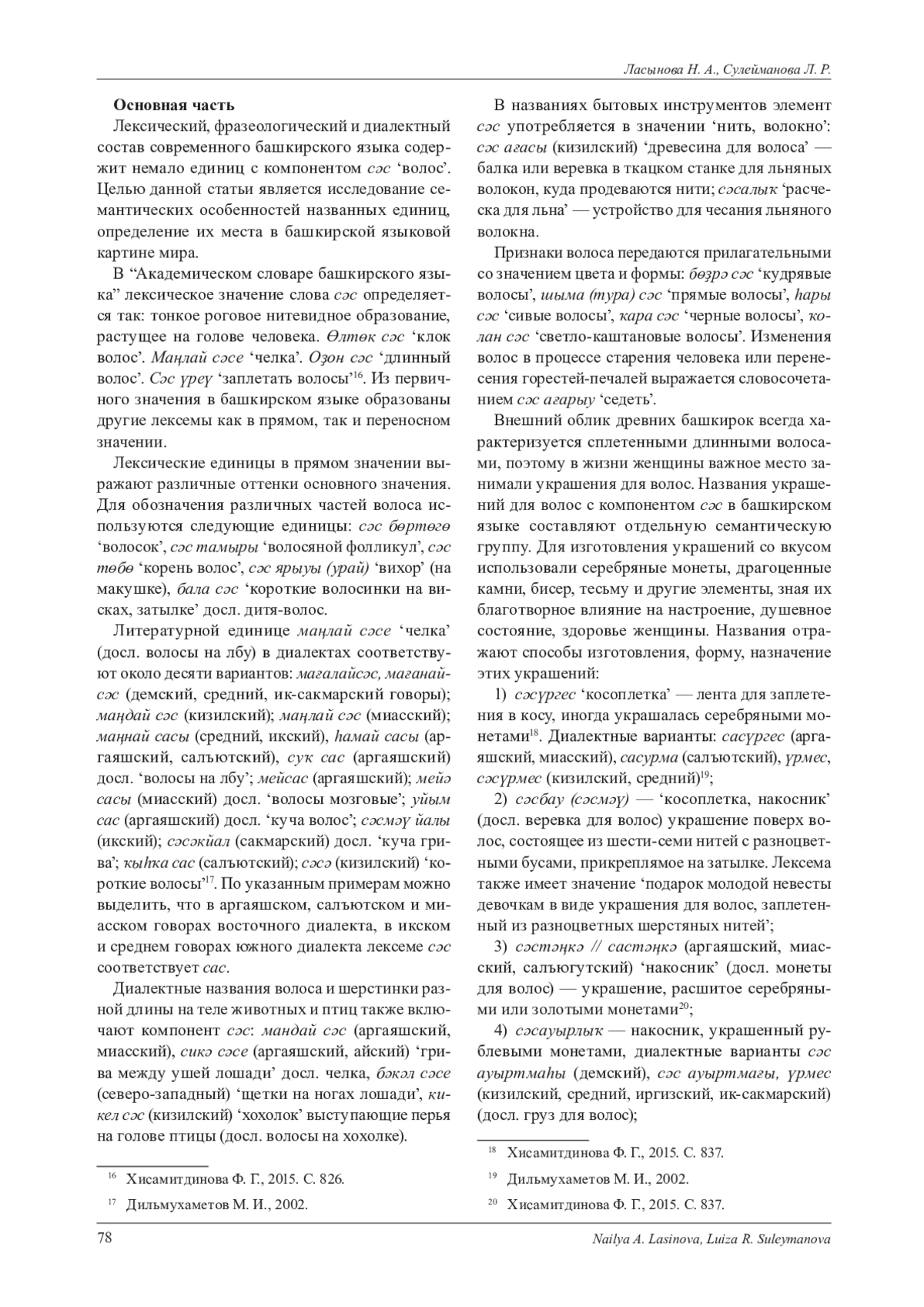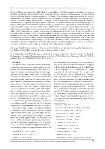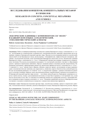 Работа посвящена выявлению лексических единиц башкирского языка с компонентом сәс ‘волос’, исследование их семантических особенностей, этнолингвистических значений, определение места названных единиц в башкирской языковой картине мира. Предметом исследования являются лексический, диалектный состав башкирского языка, фольклорные, этнографические, мифологические материалы, связанные с исследуемой лексемой, также произведения башкирских писателей, поэтов. Лексические единицы башкирского языка с компонентом сәс ‘волос’ в башкирской лингвистике впервые подвергаются специальному изучению. Результаты исследования показывают, что изучаемый компонент участвует в образовании лексем с прямым и переносным значением, образует названия живых и неживых реалий, антропонимы, би-блионимы, артионимы, зафиксированы множество диалектных вариантов лексем с компонентом сәс ‘волос’. С понятием сәс ‘волос’ связано много обрядов, обычаев, запретов, примет, исследование которых выявляет такие этнолингвистические значения, как сакральность, символику дороги, благополучия, женской красоты. В ходе исследования выявлено, что понятие ‘волос’ и лексические единицы с данным компонентом имеют место в лексике семейных обрядов, таких как рождение ребенка, свадьба (никах), проводы в последний путь. В башкирской языковой картине мира волосы - достояние женской красоты. Башкиркам запрещалось коротко стричь волосы, ходить с распущенными волосами, их надо было скрывать от посторонних глаз, и они всегда заплетались в косу. Все это повлияло на появление множество украшений для волос с функцией оберега, названия которых содержат компонент сәс ‘волос’. Названия украшений для волос в башкирском языке составляют отдельную семантическую подгруппу с множеством диалектных вариантов.