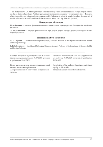 16. Сулейманова Л. Р. Мифологическая лексема мэскэй в башкирских сказках // Проблемы гуманитарных наук и образования в современном мире: Сборник научных статей по материалам IX Всероссийской научно-практической конференции. Сибай, 24 ноября 2023 года. Сибай. 2023. С. 184-185. (на башк. яз.). EDN: LRDCQC