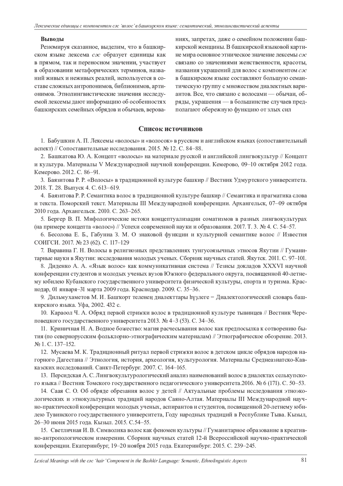3. Баязитова Р. Р. “Волосы” в традиционной культуре башкир // Вестник Удмуртского университета. 2018. Т. 28. Выпуск 4. С. 613-619.