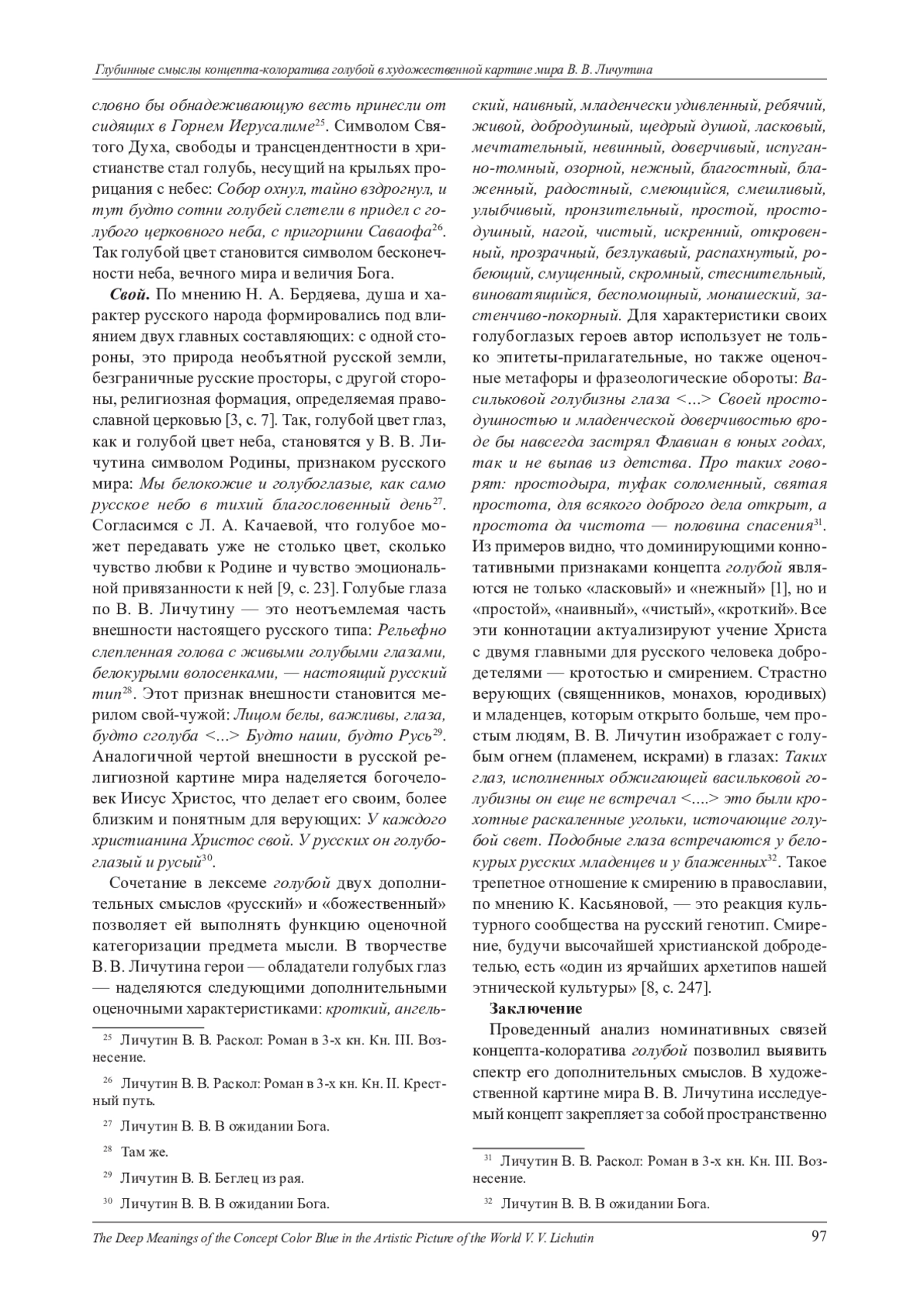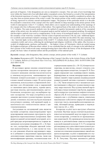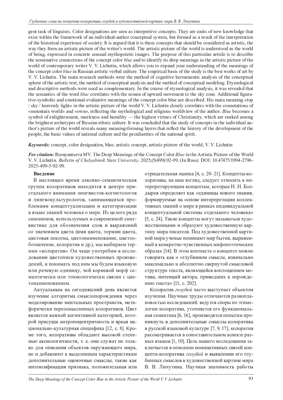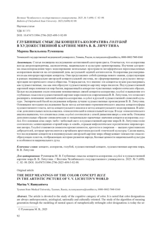 Статья посвящена исследованию когнитивной категории цвета. Отмечается, что колоративы всегда антропоцентричны, аксиологичны, национально и культурно ориентированы. Изучение алгоритма смыслопорождения через моделирование ментальных пространств метафорически переосмысленных колоративов является на сегодняшний день актуальной задачей когнитологов. Колоративы рассматриваются как интерпретирующие концепты. Они представляют собой единицы нового знания, существующие в рамках индивидуально-авторской концептуальной системы, но сформированные в результате интерпретации исторического опыта общества. Утверждается, что именно эти концепты нужно рассматривать как художественные, так как они образуют художественную картину мира писателя. Под художественной картиной мира понимается мир бытия, выраженный в конкретно-чувственных мифопоэтических образах. Целью исследования стали описание номинативных связей концепта-колоратива голубой и выявление его глубинных смыслов в художественной картине мира писателя-современника В. В. Личутина, что позволяет расширить понимание значений концепта-колоратива голубой в русской художественной словесной культуре. Эмпирической базой исследования избраны лучшие художественные произведения В. В. Личутина. Основными методами исследования были метод когнитивно-герменевтического анализа концептосферы художественного текста, метод концептуального анализа и метод концептуального моделирования. В качестве дополнительных использовались этимологический и описательный методы. В ходе этимологического анализа выявлено, что семантика слова голубой соотносится с семой движения вверх к зоне неба. Описаны дополнительные образно-символические и эмоционально-оценочные значения концепта-колоратива голубой. Его основная сема «верх /небо / небесный свет» в художественной картине мира В. В. Личутина тесно соотносится с коннотациями «горний мир» и «свой», отражая мифологическое и религиозное мировоззрение автора. Голубой становится символом просветленности, кротости и смирения - высших христианских добродетелей, которые причисляются к ярчайшим архетипам русской этнической культуры. Сделан вывод, что исследование концептов в индивидуально-авторской картине мира обнаруживает множество смыслообразующих пластов, отображающих историю развития народа, базовые ценности национальной культуры и особенности национального духа.