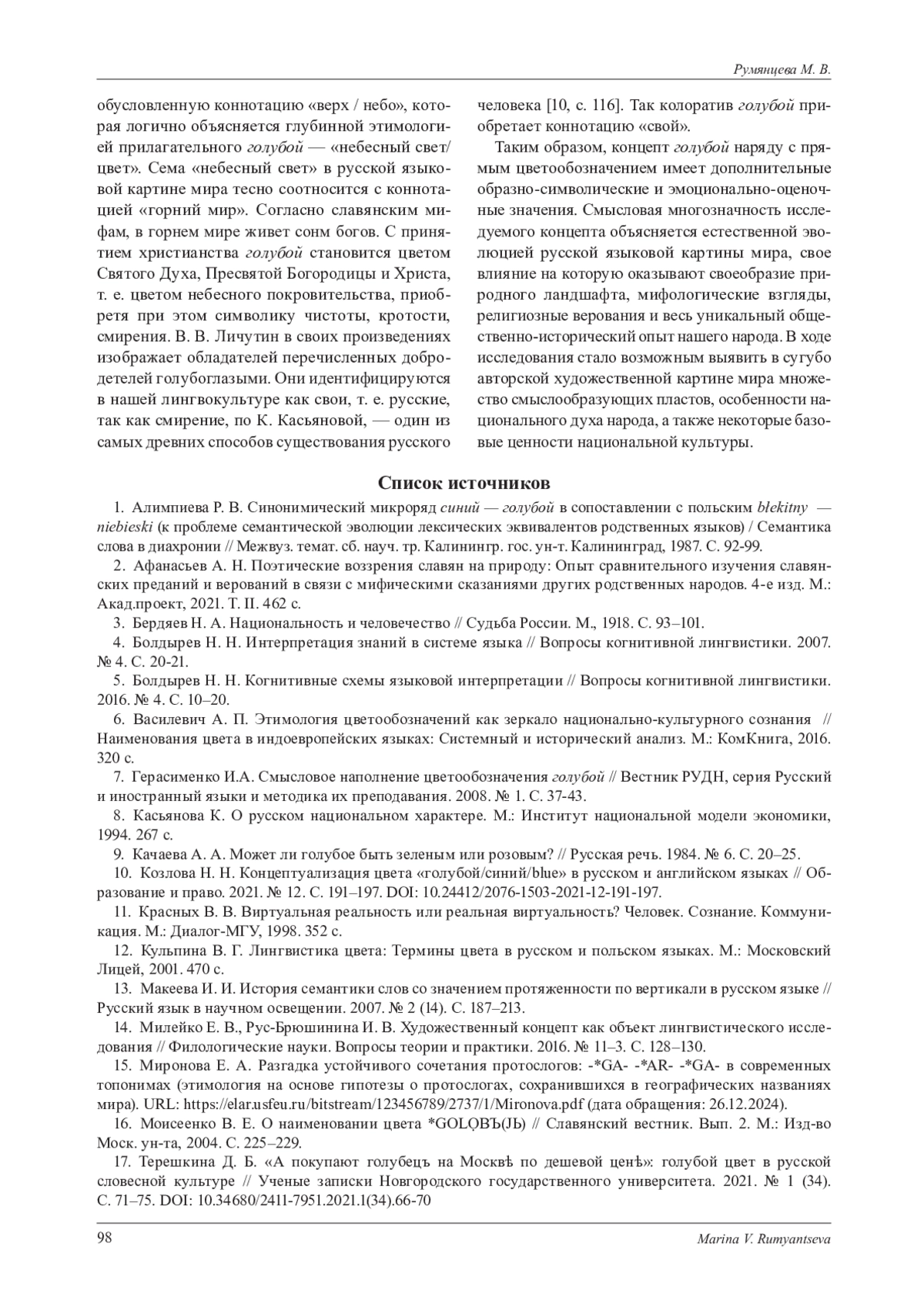 17. Терешкина Д. Б. “А покупают голубецъ на МосквЪ по дешевой ценЪ”: голубой цвет в русской словесной культуре // Ученые записки Новгородского государственного университета. 2021. № 1 (34). С. 71-75. DOI: 10.34680/2411-7951.2021.1(34).66-70 EDN: WNYYEG