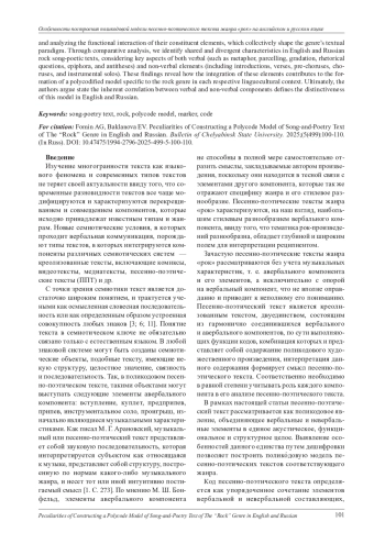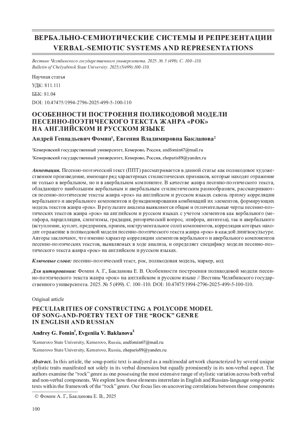Песенно-поэтический текст (ППТ) рассматривается в данной статье как поликодовое художественное произведение, имеющее ряд характерных стилистических признаков, которые находят отражение не только в вербальном, но и в авербальном компоненте. В качестве жанра песенно-поэтического текста, обладающего наибольшим вербальным и авербальным стилистическим разнообразием, рассматриваются песенно-поэтические тексты жанра «рок» на английском и русском языках сквозь призму корреляции вербального и авербального компонентов и функционирования комбинаций их элементов, формирующих модель текстов жанра «рок». В результате анализа выявляются общие и отличительные черты песенно-поэтических текстов жанра «рок» на английском и русском языках с учетом элементов как вербального (метафора, парцелляция, сленгизмы, градация, риторический вопрос, эпифора, антитеза), так и авербального (вступление, куплет, предприпев, припев, инструментальное соло) компонентов, корреляция которых находит отражение в поликодовой модели песенно-поэтического текста жанра «рок» в каждой лингвокультуре. Авторы заключают, что именно характер корреляции элементов вербального и авербального компонентов песенно-поэтических текстов, выявляемых в ходе анализа, и определяет специфику модели песенно-поэтического текста жанра «рок» на английском и русском языках.