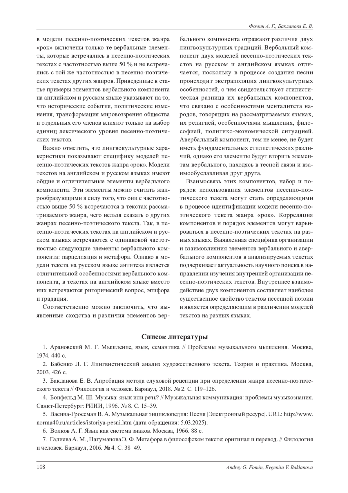 3. Бакланова Е. В. Апробация метода слуховой рецепции при определении жанра песенно-поэтического текста // Филология и человек. Барнаул, 2018. № 2. С. 119-126.