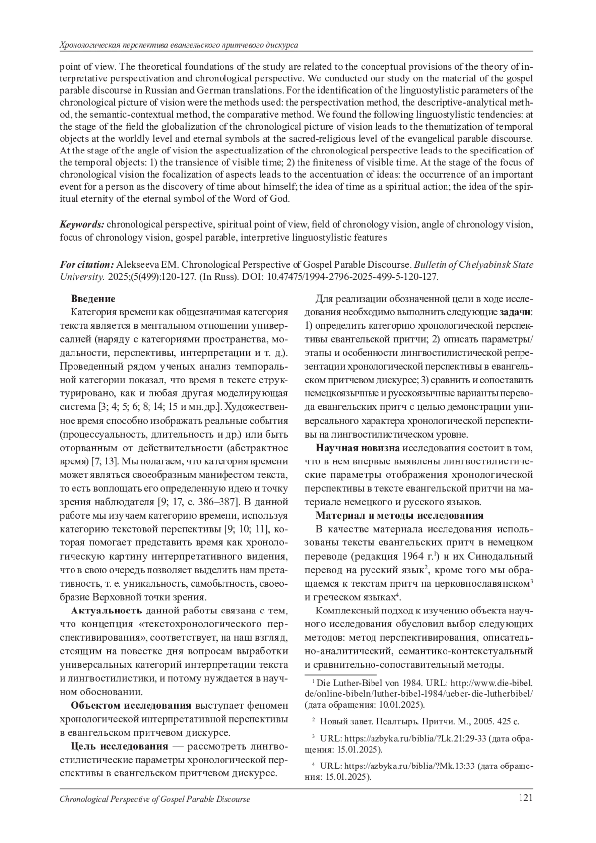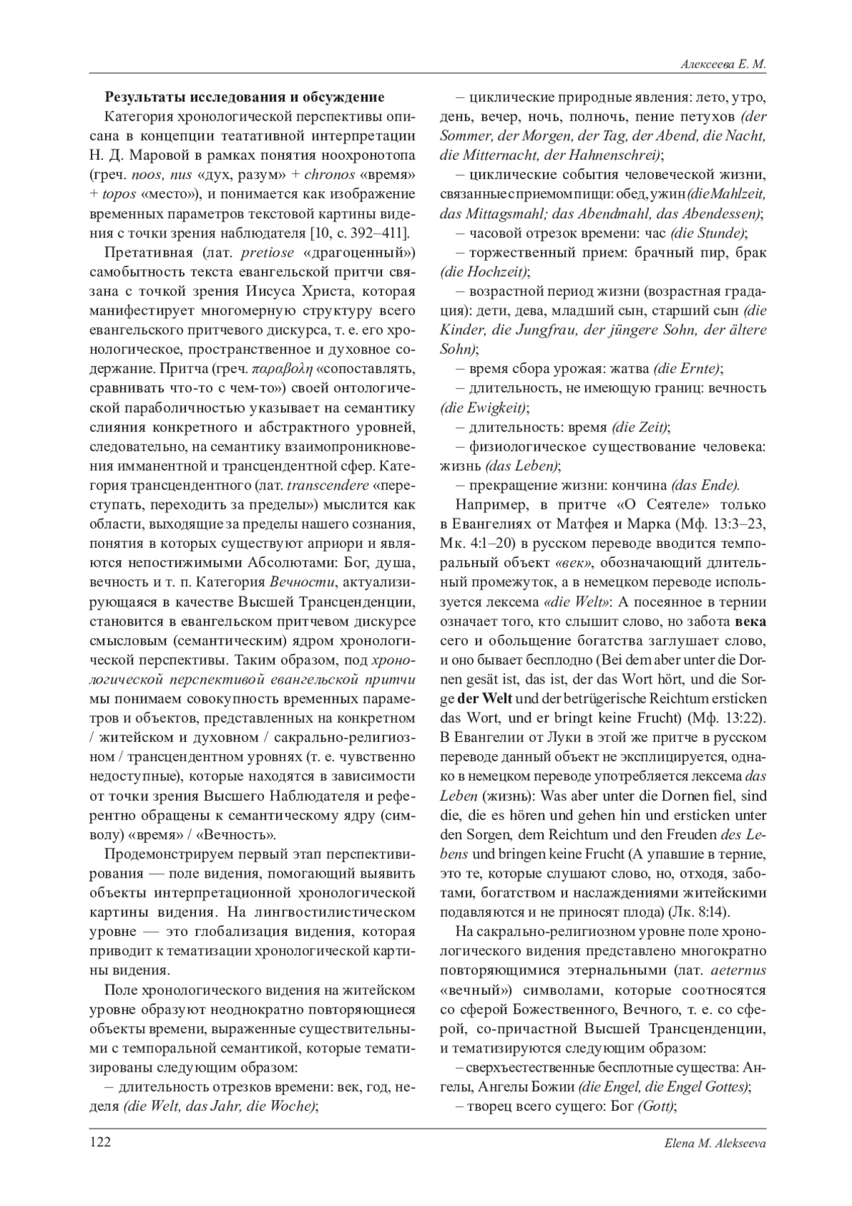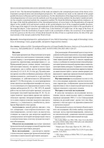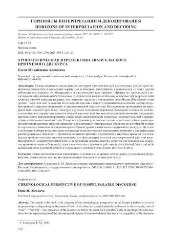 Статья посвящена исследованию категории хронологической перспективы, под которой понимается совокупность временных параметров и объектов, находящиеся в зависимости от точки зрения наблюдателя и референтно обращенные к семантическому ядру «время» / «Вечность». Актуальность исследования обусловлена необходимостью изучения лингвостилистических особенностей репрезентации хронологической картины видения, что позволяет выделить претативное своеобразие Верховной точки зрения. Теоретические основания исследования связаны с концептуальными положениями теории интерпретативного перспективирования и хронологической перспективы. Исследование проводилось на материале евангельского притчевого дискурса в русском и немецком переводах. Выявление и описание лингвостилистических параметров хронологической картины видения предполагало использование следующих методов: метод перспективирования, описательно-аналитический, семантико-контекстуальный и сравнительно-сопоставительный методы. В ходе исследования установлено, что на этапе поля глобализация хронологической картины видения приводит к тематизации темпоральных объектов на житейском уровне и этернальных символов на сакрально-религиозном уровне евангельского притчевого дискурса. На этапе угла видения обнаружено, что аспектуализация хронологической перспективы приводит к спецификации рассматриваемых объектов: 1) бренность видимого времени; 2) конечность видимого времени. На этапе фокуса хронологического видения выявлено, что фокализация аспектов рассматриваемой картины видения приводит к акцентуализации идей: о наступлении некоего важного события для человека как открытие времени о самом себе (καιρός); идея о времени как о духовном действии (nicht schlafend, beten und nicht nachlassen); идея духовной вечности этернального символа Слово Божие (das Wort Gottes).