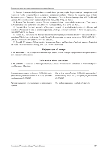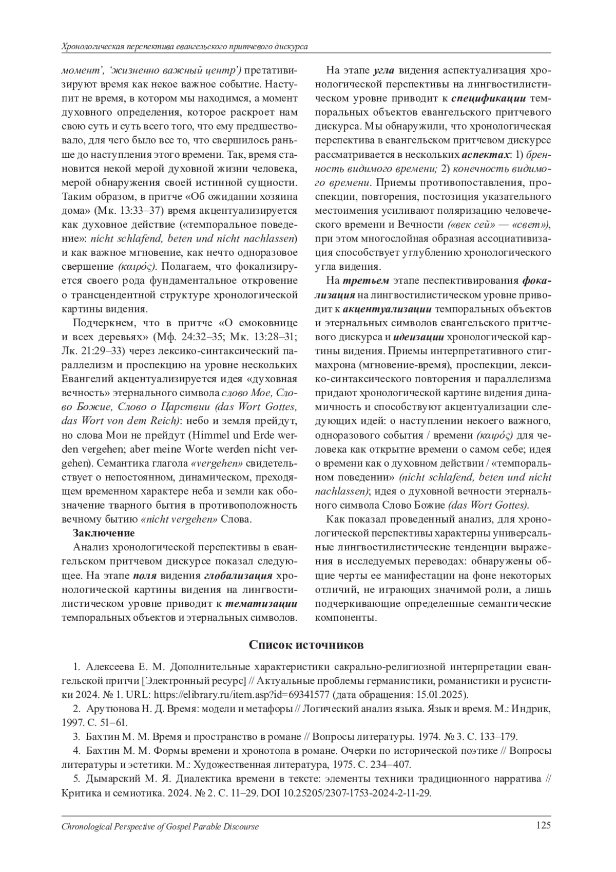1. Алексеева Е. М. Дополнительные характеристики сакрально-религиозной интерпретации евангельской притчи [Электронный ресурс] // Актуальные проблемы германистики, романистики и русистики 2024. № 1. URL: item.asp?id=69341577 (дата обращения: 15.01.2025). EDN: VFSSMC