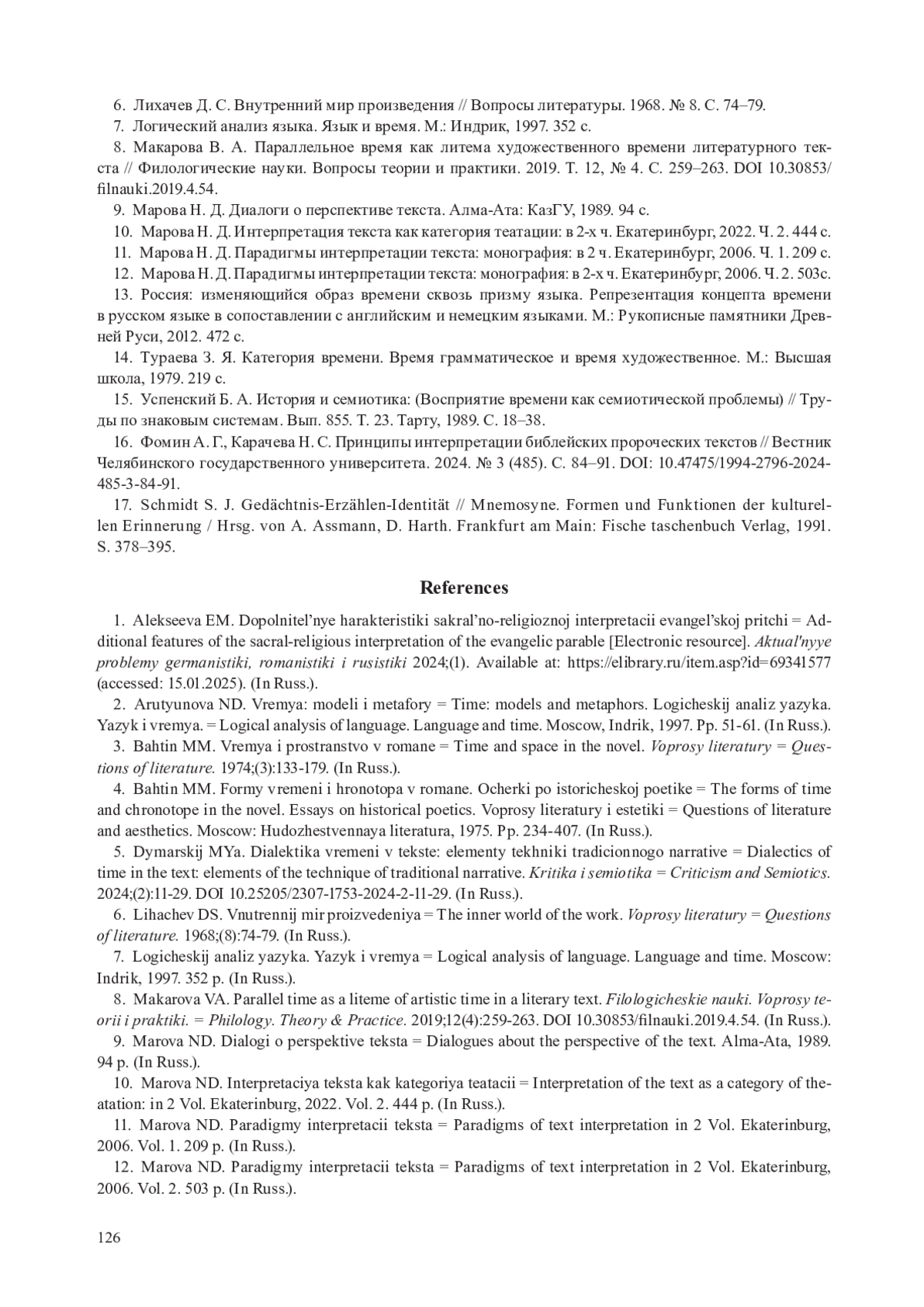 8. Макарова В. А. Параллельное время как литема художественного времени литературного текста 〃 Филологические науки. Вопросы теории и практики. 2019. Т. 12, № 4. С. 259-263. 10.30853/ filnauki.2019.4.54. DOI: 10.30853/filnauki.2019.4.54 EDN: UIDQBO