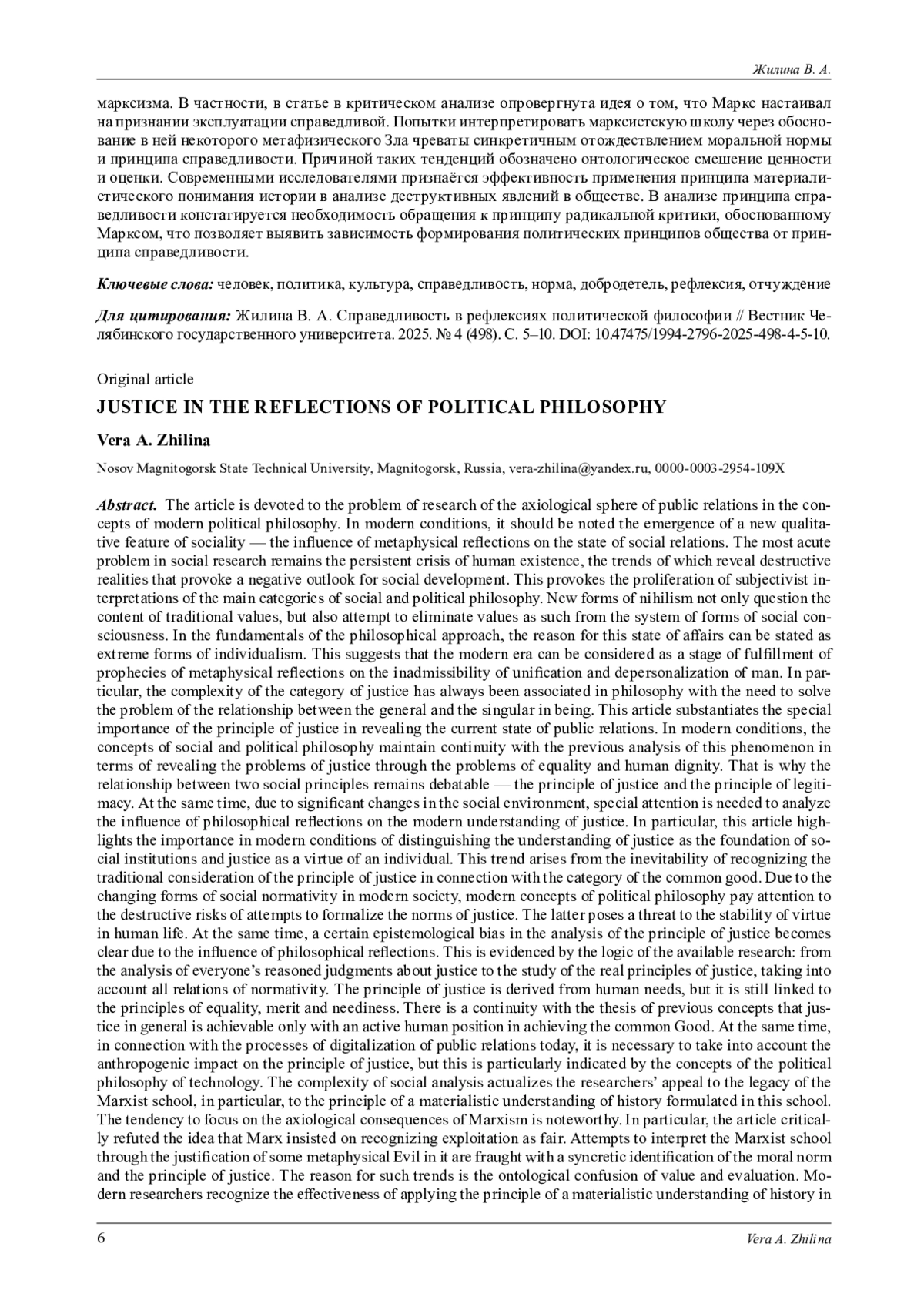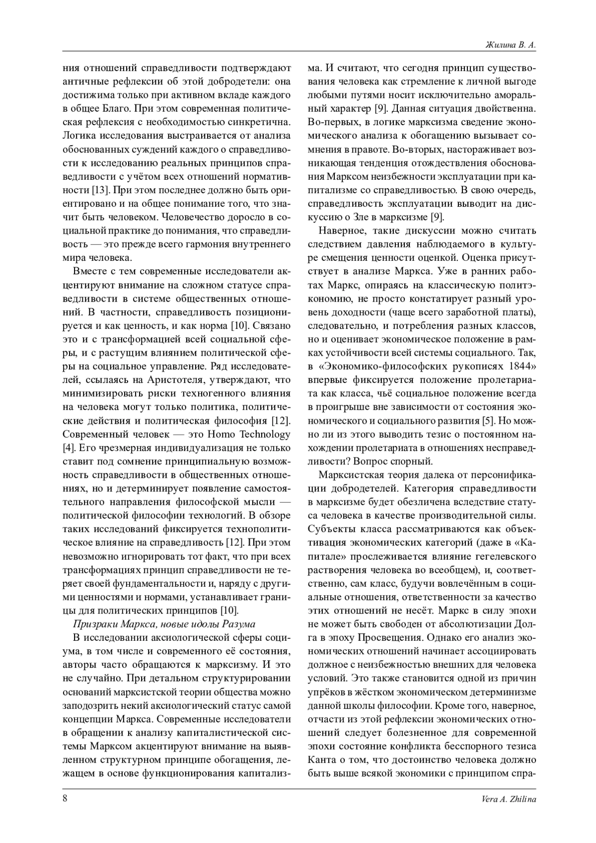 Статья посвящена проблеме исследований аксиологической сферы общественных отношений в концепциях современной политической философии. В современных условиях следует отметить появление новой качественной черты социальности - влияние метафизических рефлексий на состояние общественных отношений. Наиболее острой проблемой в социальных исследованиях остаётся устойчивый кризис существования человечества, тенденции которого обнаруживают деструктивные реалии, провоцирующие негативный прогноз социального развития. Это провоцирует разрастание субъективистских интерпретаций основных категорий социальной и политической философии. Новые формы нигилизма не просто ставят под сомнение содержание традиционных ценностей, но и предпринимают попытку элиминации ценности как таковой из системы форм общественного сознания. В основах философского подхода причиной такого положения дел можно констатировать крайние формы индивидуализма. Это позволяет предположить, что современная эпоха может рассматриваться как этап воплощения в жизнь пророчеств метафизических рефлексий по поводу недопустимости унификации и обезличивания человека. В частности, сложность категории «справедливость» фактически всегда в философии ассоциировалась с необходимостью решения проблемы соотношения общего и единичного в бытии. В данной статье обоснована особая значимость принципа справедливости в раскрытии актуального состояния общественных отношений. В современных условиях концепции социальной и политической философии сохраняется преемственность с предшествующим анализом данного феномена в аспекте раскрытия проблем справедливости через проблемы равенства и достоинства человека. Именно поэтому дискуссионным остаётся соотношение двух социальных принципов - принципа справедливости и принципа легитимности. Одновременно вследствие существенного изменения социальной среды необходимо специальное обращение к анализу влияния философских рефлексий на современное понимание справедливости. В частности, в данной статье особо рассмотрена значимость в современных условиях разграничения понимания справедливости как основания институтов социума и справедливости как добродетели отдельного человека. Данная тенденция складывается из неизбежности признания традиционного рассмотрения принципа справедливости в связи с категорией всеобщего Блага. Вследствие изменения форм социальной нормативности в современном обществе современные концепции политической философии обращают внимание на деструктивные риски попыток формализации норм справедливости. Последнее создаёт угрозу устойчивости добродетели в жизни человека. Одновременно становится понятным некоторый гносеологический уклон анализа принципа справедливости вследствие влияния философских рефлексий. Свидетельством этому выступает логика имеющихся исследований: от анализа обоснованных суждений каждого о справедливости к исследованию реальных принципов справедливости с учётом всех отношений нормативности. Принцип справедливости выводится из потребности человека, но и по-прежнему связан с принципами равенства, заслуг и нуждаемости. Обнаруживается преемственность с тезисом предшествующих концепций о том, что справедливость в целом достижима только при активной позиции