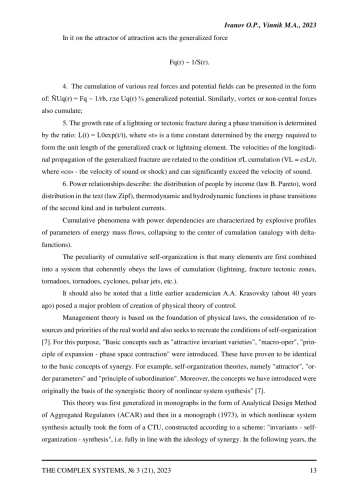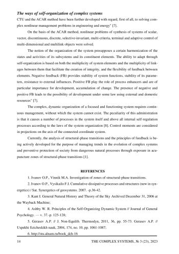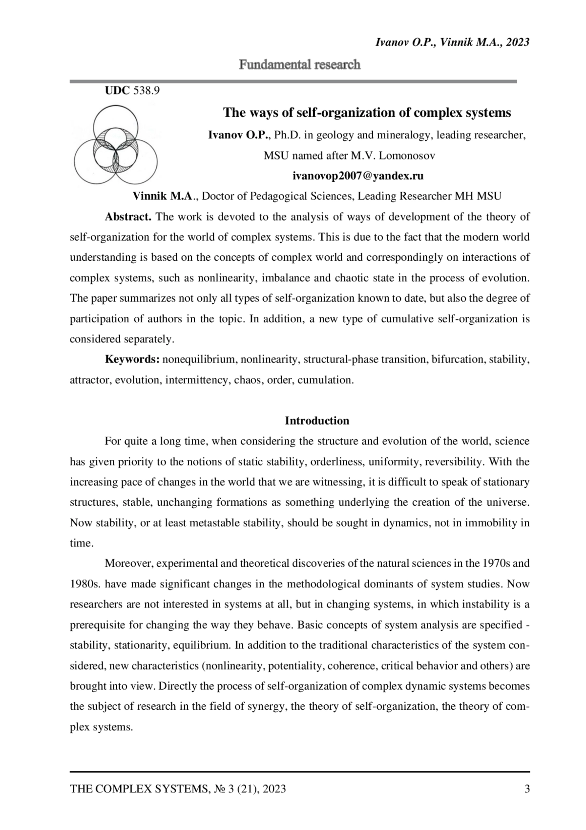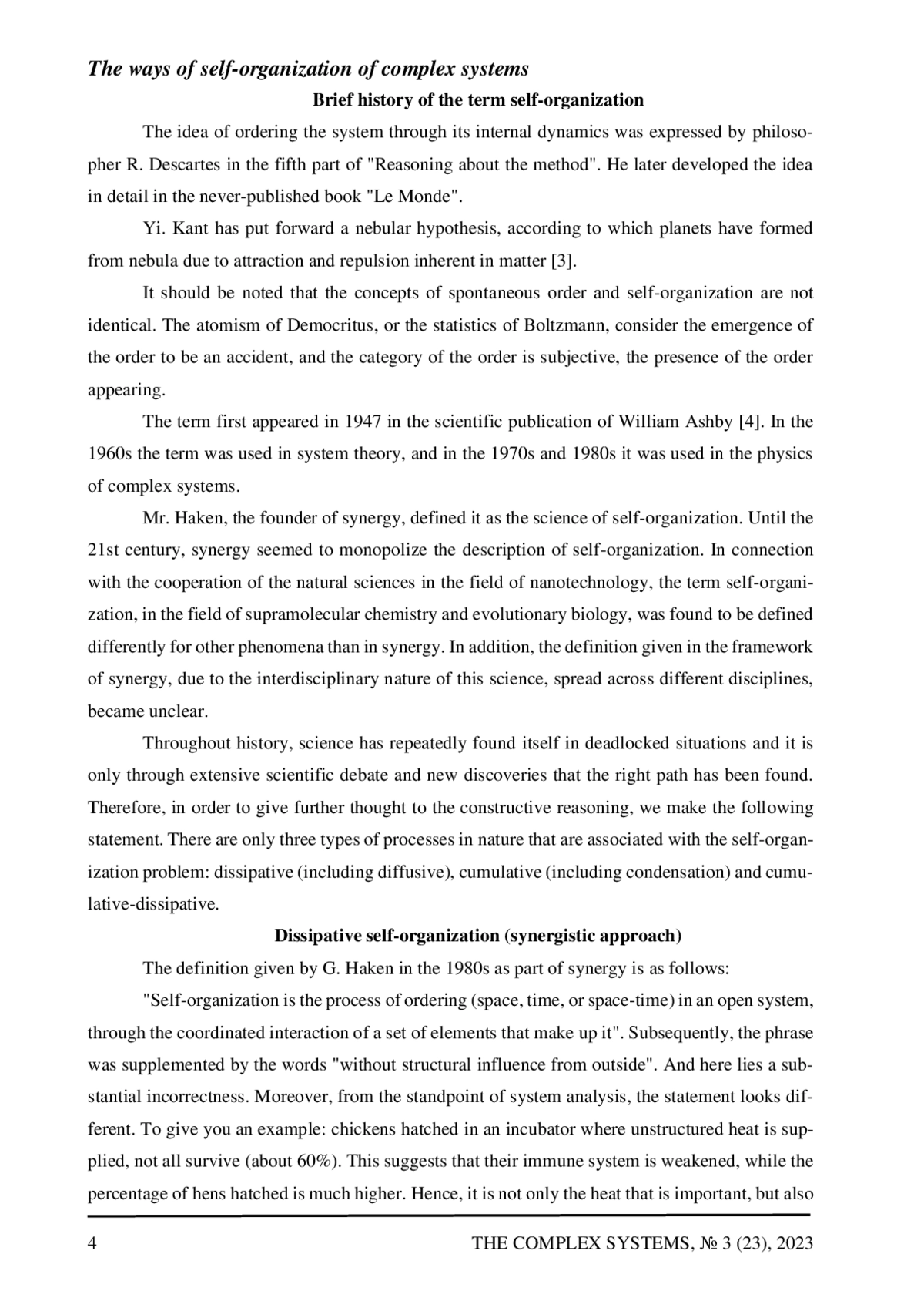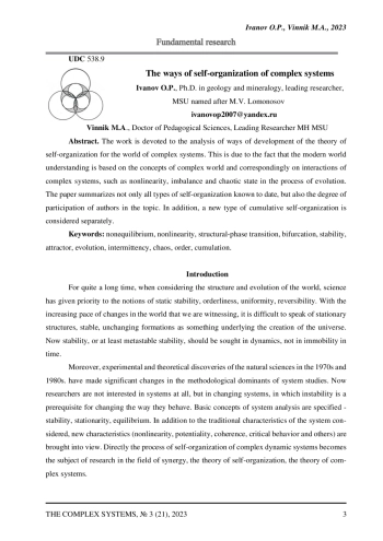 The work is devoted to the analysis of ways of development of the theory of self-organization for the world of complex systems. This is due to the fact that the modern world understanding is based on the concepts of complex world and correspondingly on interactions of complex systems, such as nonlinearity, imbalance and chaotic state in the process of evolution. The paper summarizes not only all types of self-organization known to date, but also the degree of participation of authors in the topic. In addition, a new type of cumulative self-organization is considered separately.