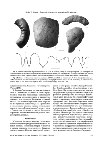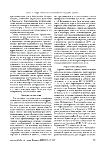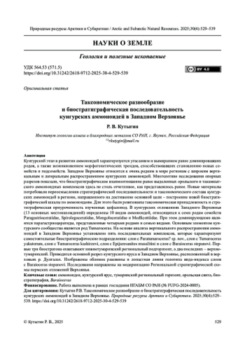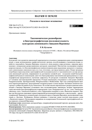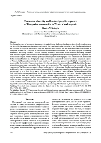 Кунгурский этап в развитии аммоноидей характеризуется угасанием и вымиранием ранее доминировавших родов, а также возникновением морфогенетических трендов, способствовавших становлению новых семейств и подсемейств. Западное Верхоянье относится к очень редким в мире регионам с широким вертикальным и латеральным распространением кунгурских аммоноидей. Многолетние исследования опорных разрезов показали, что биостратиграфическое взаимоотношение ранее выделенных орольского и такамкытского аммоноидных комплексов здесь не столь отчетливое, как представлялось ранее. Новые материалы потребовали переосмысления стратиграфической последовательности и таксономического состава кунгурских аммоноидей в регионе, направленного на достижение основной цели – построение новой биостратиграфической шкалы по аммоноидеям. Для этого были ревизованы таксономическая принадлежность и стратиграфическая приуроченность изученных цефалопод. В кунгурских отложениях Западного Верхоянья (13 основных местонахождений) определены 10 видов аммоноидей, относящихся к семи родам семейств Paragastrioceratidae, Spirolegoceratidae, Mongoloceratidae и Medlicottiidae. При этом доминирующими являются парагастриоцератиды, представленные четырьмя родами и семью видами. Основным элементом кунгурского сообщества является род Tumaroceras. На основе анализа вертикального распространения аммоноидей в Западном Верхоянье установлено пять последовательных комплексов, которые характеризуют самостоятельные биостратиграфические подразделения: слои с Paratumaroceras? sp. nov., слои с Tumaroceras yakutorum, слои с Tumaroceras kashirzevi, слои с Epijuresanites musalitini и слои с Baraioceras stepanovi. Первые три биостратона охватывают нижнетумаринский региональный подгоризонт, а два последних – верхнетумаринский. Приводится основной разрез кунгурского яруса в Западном Верхоянье, расположенный в верховьях р. Дулгалах. Изображены обломок раковины и лопастная линия голотипа вида-индекса слоев с Baraioceras stepanovi. Исследования направлены на модернизацию Региональной стратиграфической схемы пермских отложений Верхоянья.