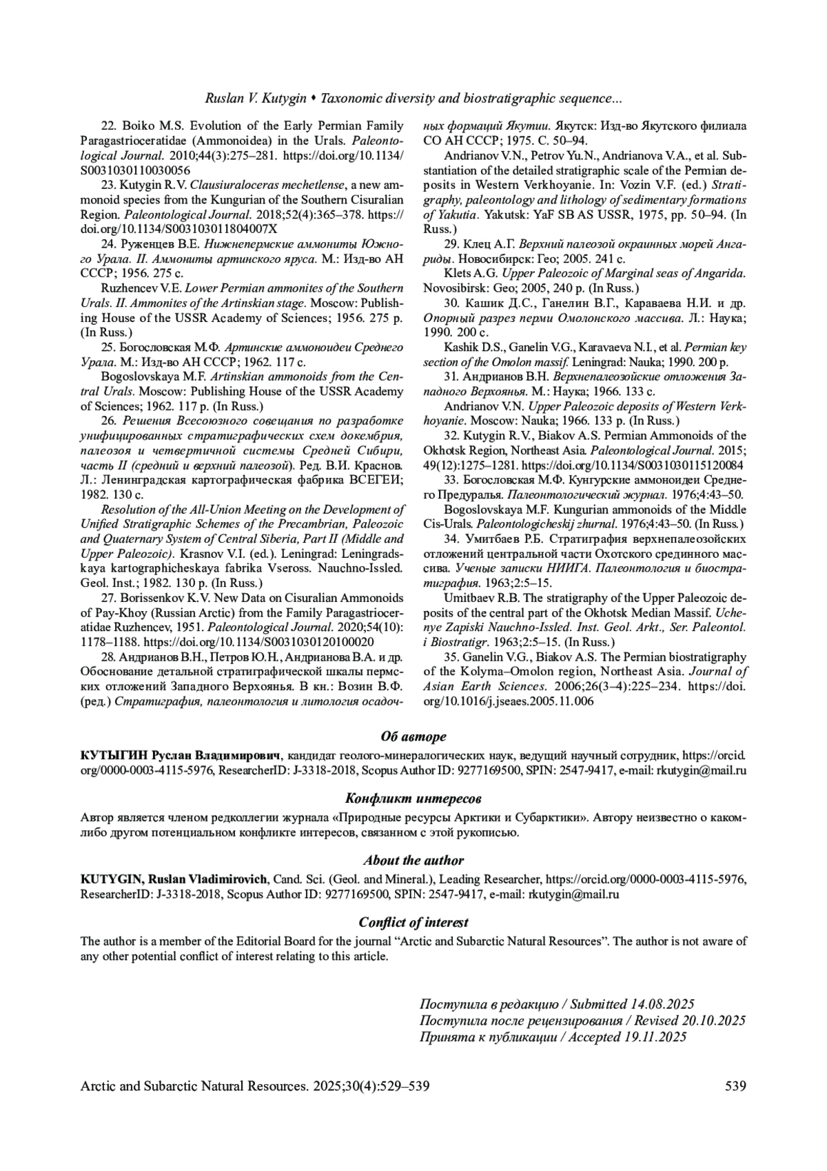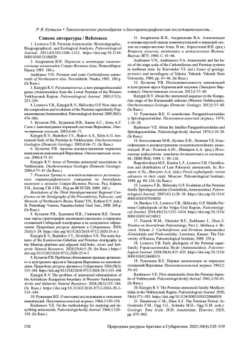 5. Кутыгин Р.В., Будников И.В., Бяков А.С., Клец А.Г. Слои с аммоноидеями пермской системы Верхоянья. Отечественная геология. 2002;4:66-71.