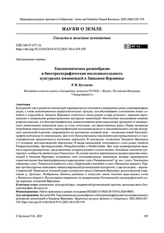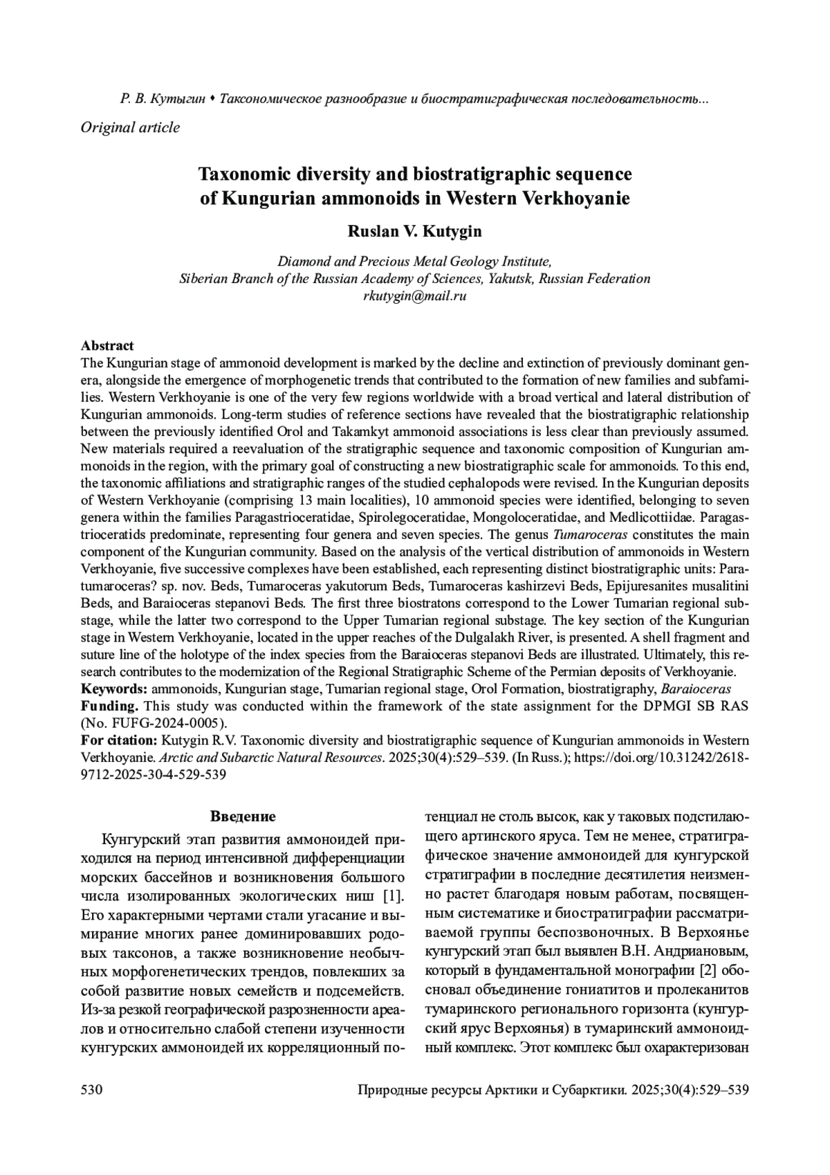 20. Kutygin R.V. The Permian ammonoid family Medlicottiidae in the Verkhoyansk Region. Paleontological Journal. 2020; 54(6):571-583. DOI: 10.1134/S0031030120060039