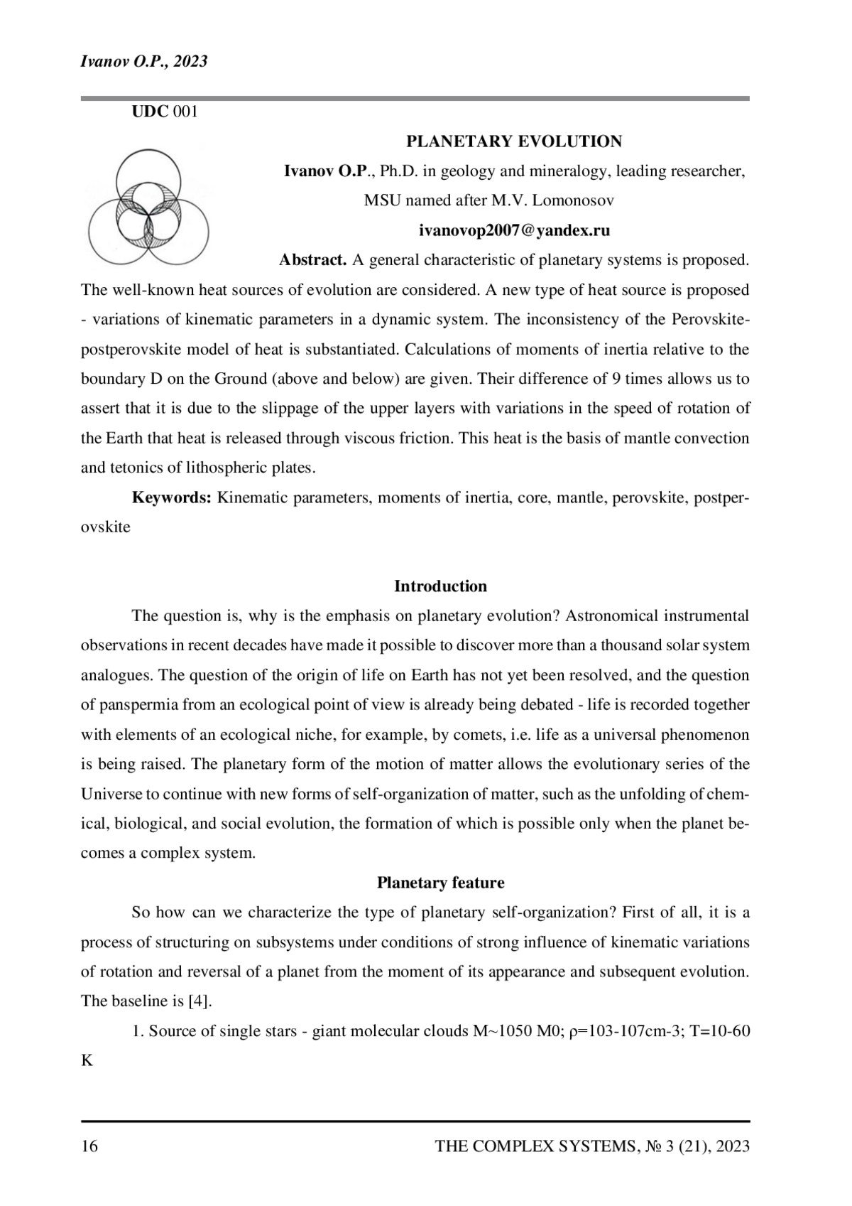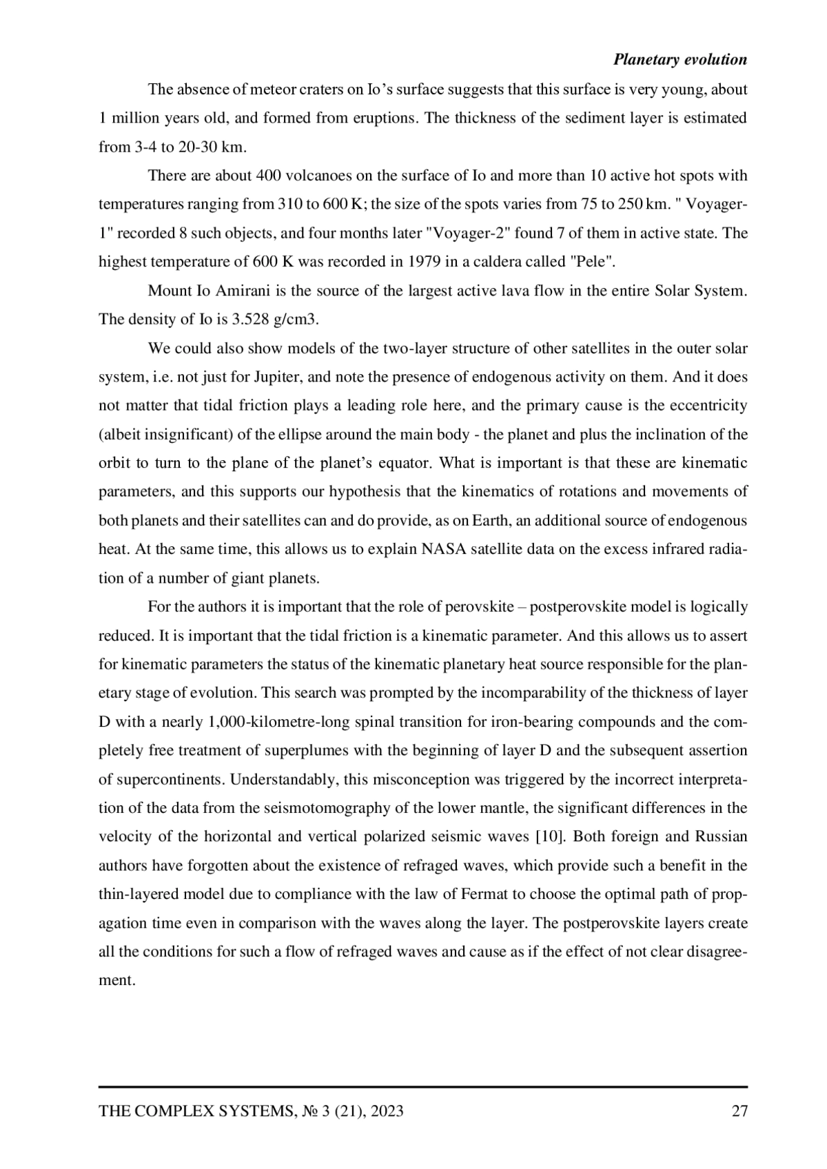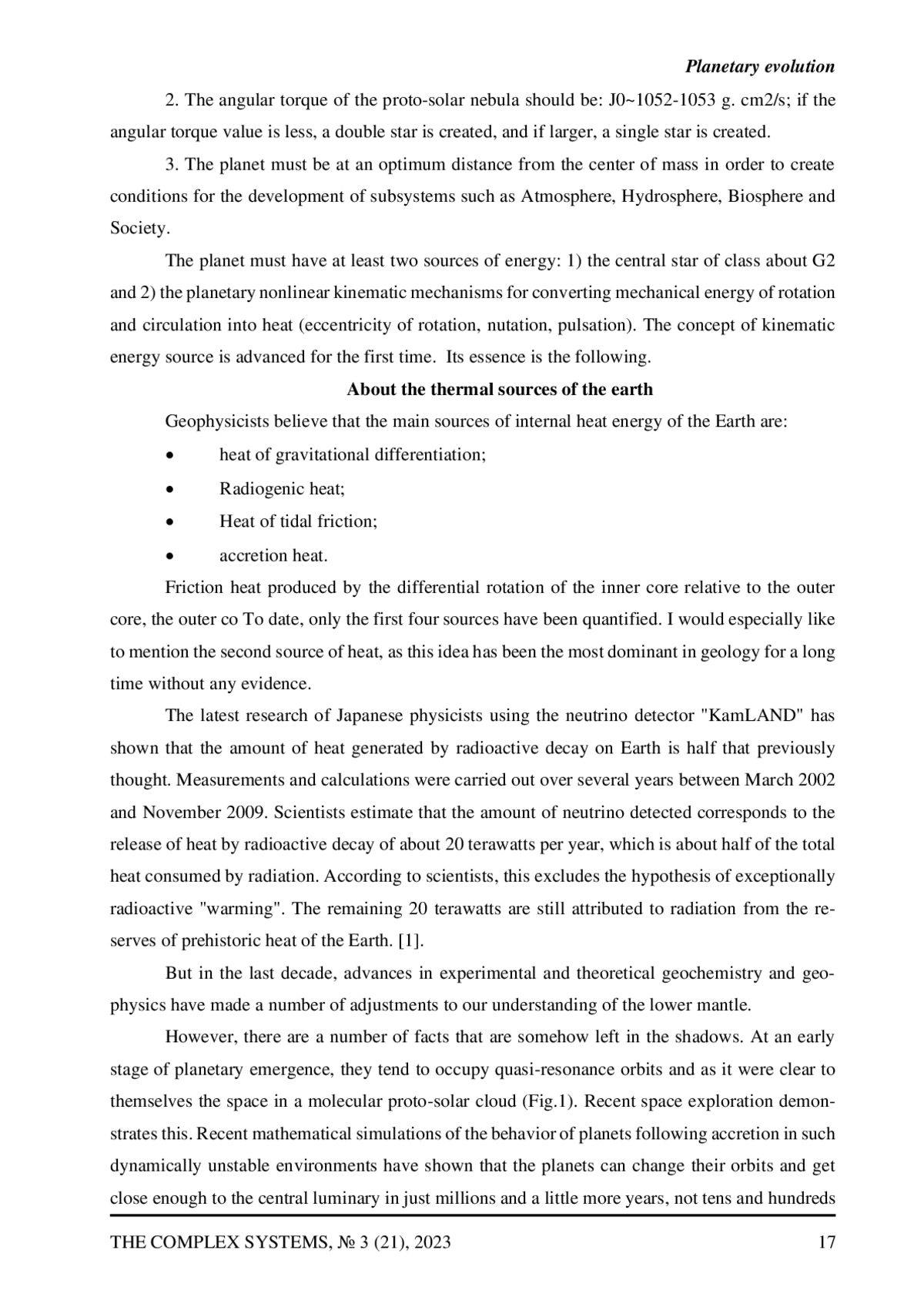 A general characteristic of planetary systems is proposed. The well-known heat sources of evolution are considered. A new type of heat source is proposed - variations of kinematic parameters in a dynamic system. The inconsistency of the Perovskitepostperovskite model of heat is substantiated. Calculations of moments of inertia relative to the boundary D on the Ground (above and below) are given. Their difference of 9 times allows us to assert that it is due to the slippage of the upper layers with variations in the speed of rotation of the Earth that heat is released through viscous friction. This heat is the basis of mantle convection and tetonics of lithospheric plates.