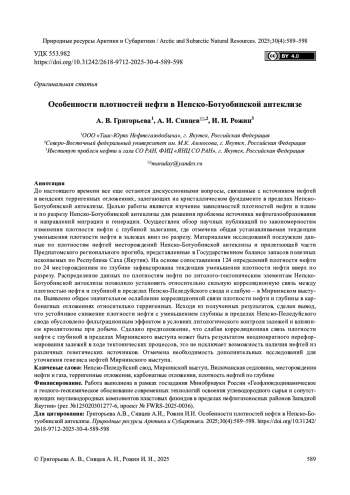 До настоящего времени все еще остаются дискуссионными вопросы, связанные с источником нефтей в вендских терригенных отложениях, залегающих на кристаллическом фундаменте в пределах НепскоБотуобинской антеклизы. Целью работы является изучение зависимостей плотностей нефти в плане и по разрезу Непско-Ботуобинской антеклизы для решения проблемы источника нефтегазообразования и направлений миграции и генерации. Осуществлен обзор научных публикаций по закономерностям изменения плотности нефти с глубиной залегания, где отмечена общая устанавливаемая тенденция уменьшения плотности нефти в залежах вниз по разрезу. Материалами исследований послужили данные по плотностям нефтей месторождений Непско-Ботуобинской антеклизы и прилегающей части Предпатомского регионального прогиба, представленные в Государственном балансе запасов полезных ископаемых по Республике Саха (Якутия). На основе сопоставления 124 определений плотности нефти по 24 месторождениям по глубине зафиксирована тенденция уменьшения плотности нефти вверх по разрезу. Распределение данных по плотностям нефти по литолого-тектоническим элементам НепскоБотуобинской антеклизы позволило установить относительно сильную корреляционную связь между плотностью нефти и глубиной в пределах Непско-Пеледуйского свода и слабую – в Мирнинском выступе. Выявлено общее значительное ослабление корреляционной связи плотности нефти и глубины в карбонатных отложениях относительно терригенных. Исходя из полученных результатов, сделан вывод, что устойчивое снижение плотности нефти с уменьшением глубины в пределах Непско-Пеледуйского свода обусловлено фильтрационным эффектом в условиях литологического контроля залежей и влиянием криолитозоны при добыче. Сделано предположение, что слабая корреляционная связь плотности нефти с глубиной в пределах Мирнинского выступа может быть результатом неоднократного переформирования залежей в ходе тектонических процессов, это не исключает возможность наличия нефтей из различных генетических источников. Отмечена необходимость дополнительных исследований для уточнения генезиса нефтей Мирнинского выступа.