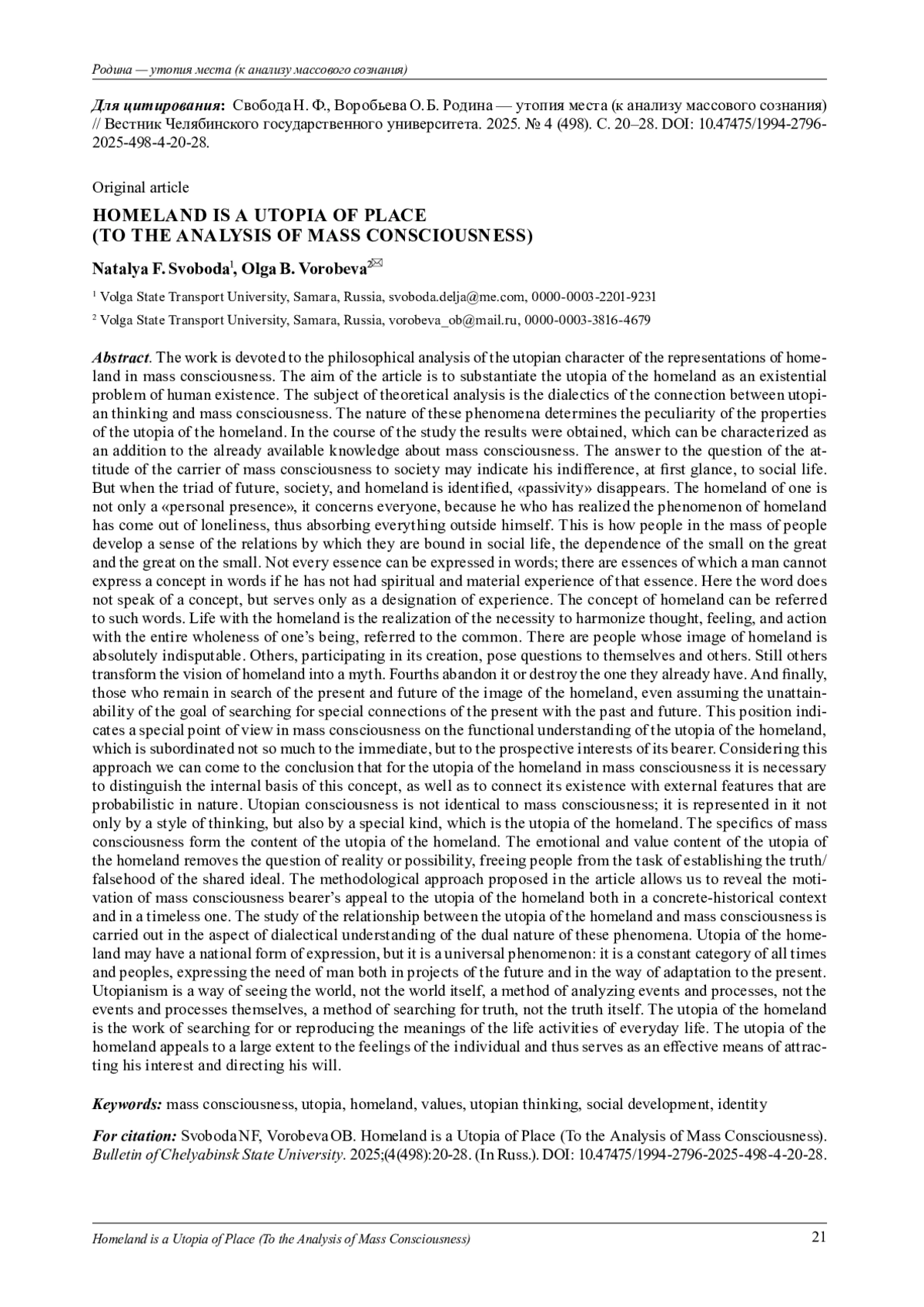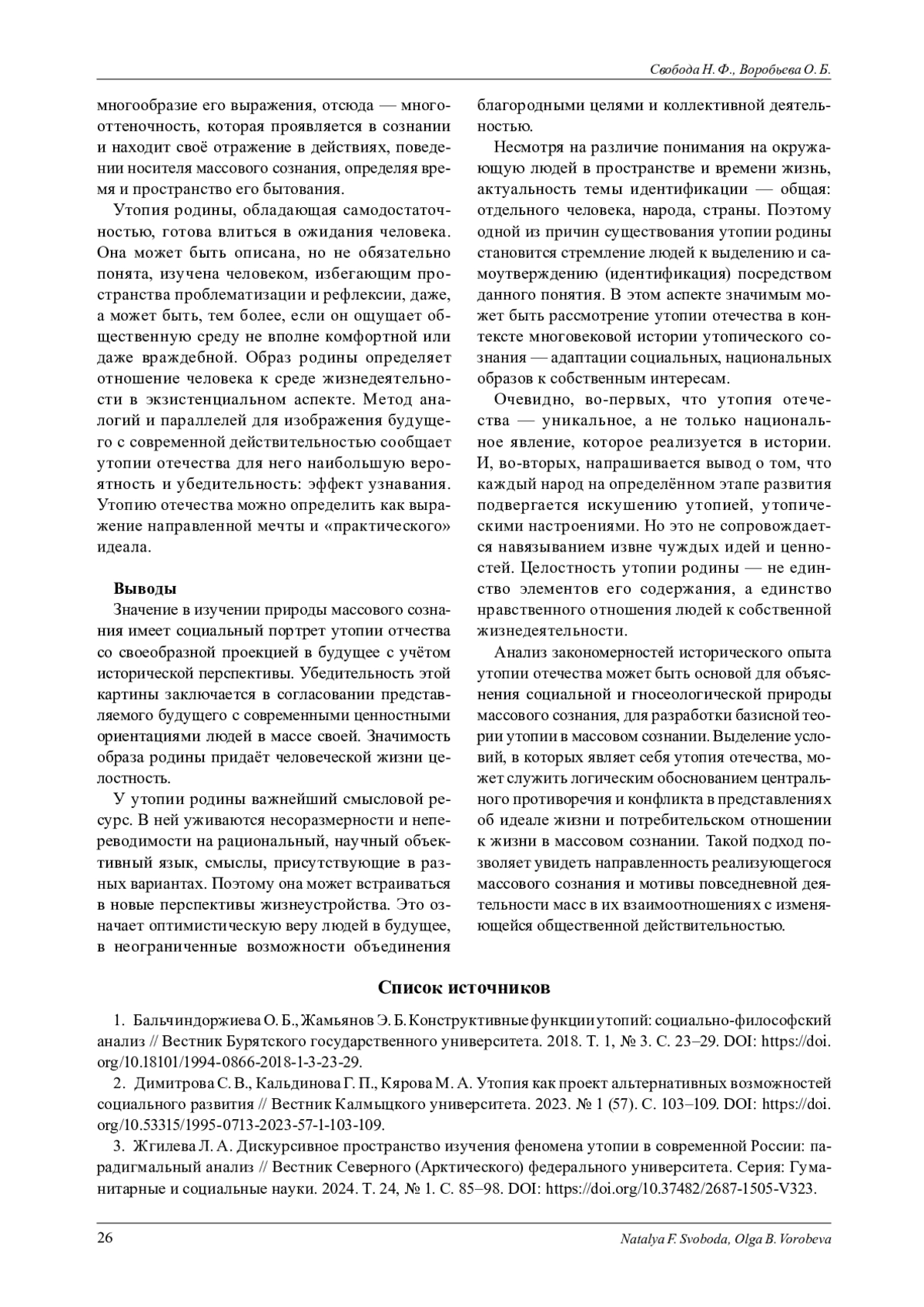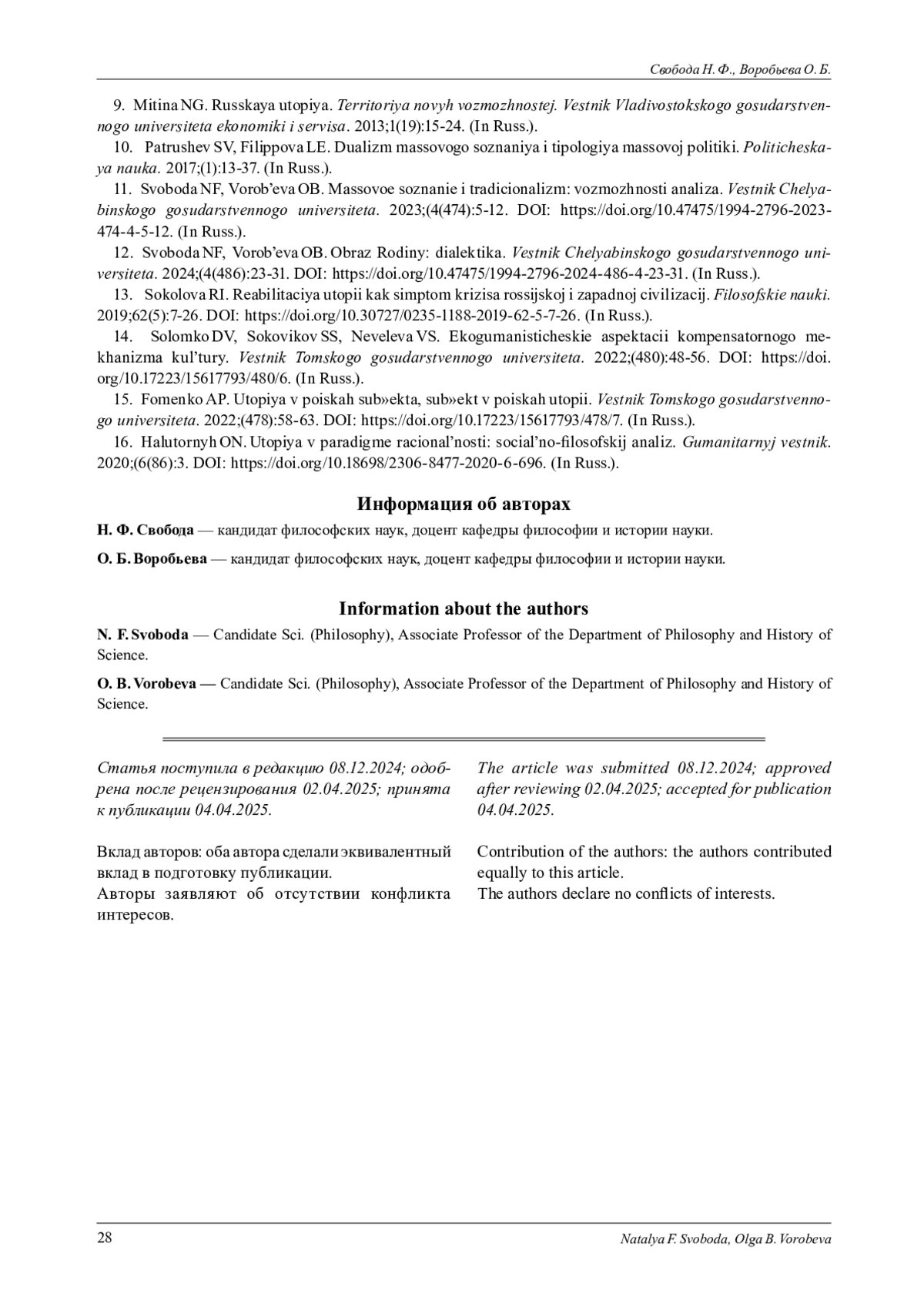 12. Свобода Н. Ф., Воробьева О. Б. Образ Родины: диалектика // Вестник Челябинского государственного университета. 2024. № 4(486). С. 23-31. DOI: 10.47475/1994-2796-2024-486-4-23-31