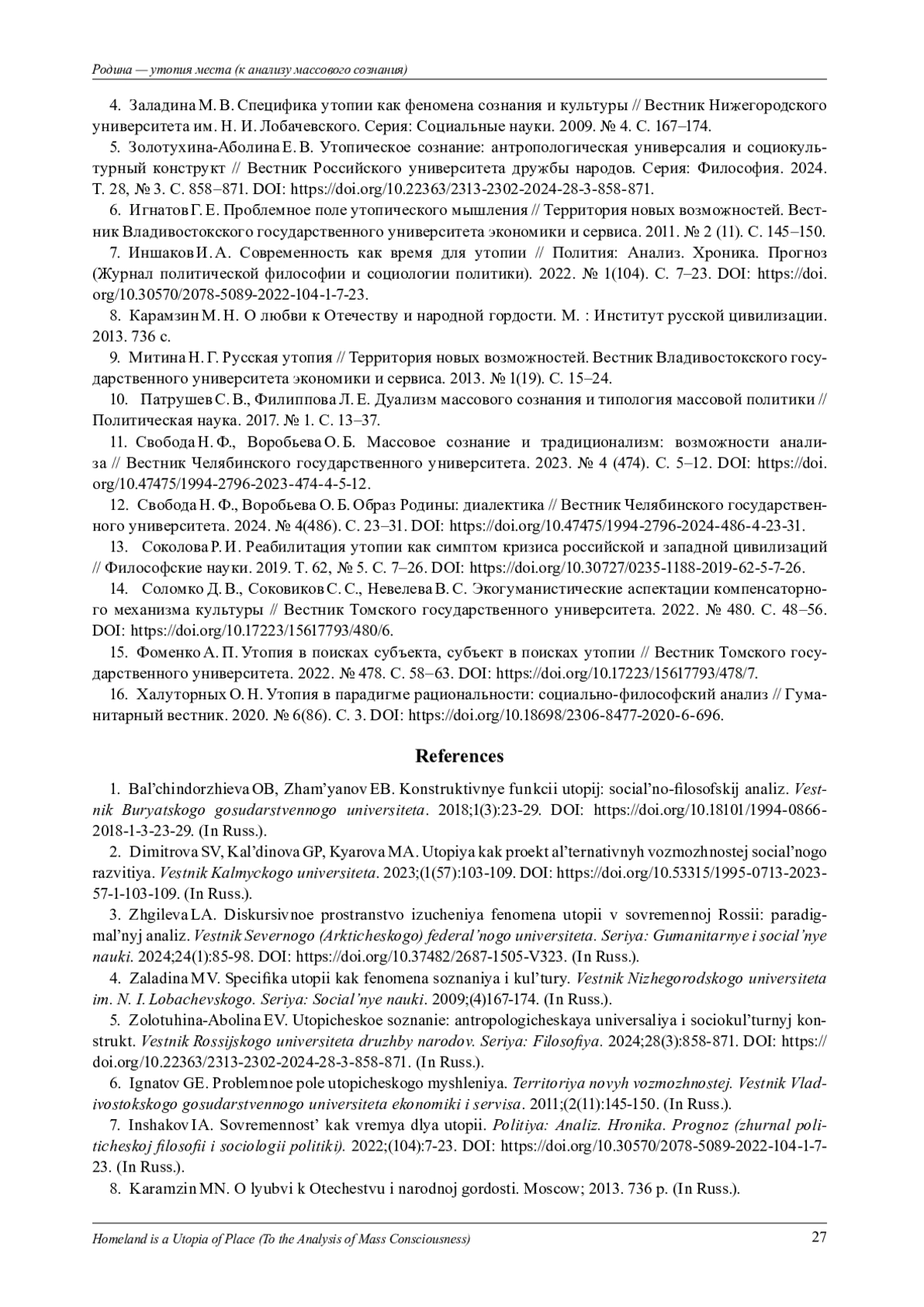 16. Халуторных О. Н. Утопия в парадигме рациональности: социально-философский анализ // Гуманитарный вестник. 2020. № 6(86). С. 3. DOI: 10.18698/2306-8477-2020-6-696