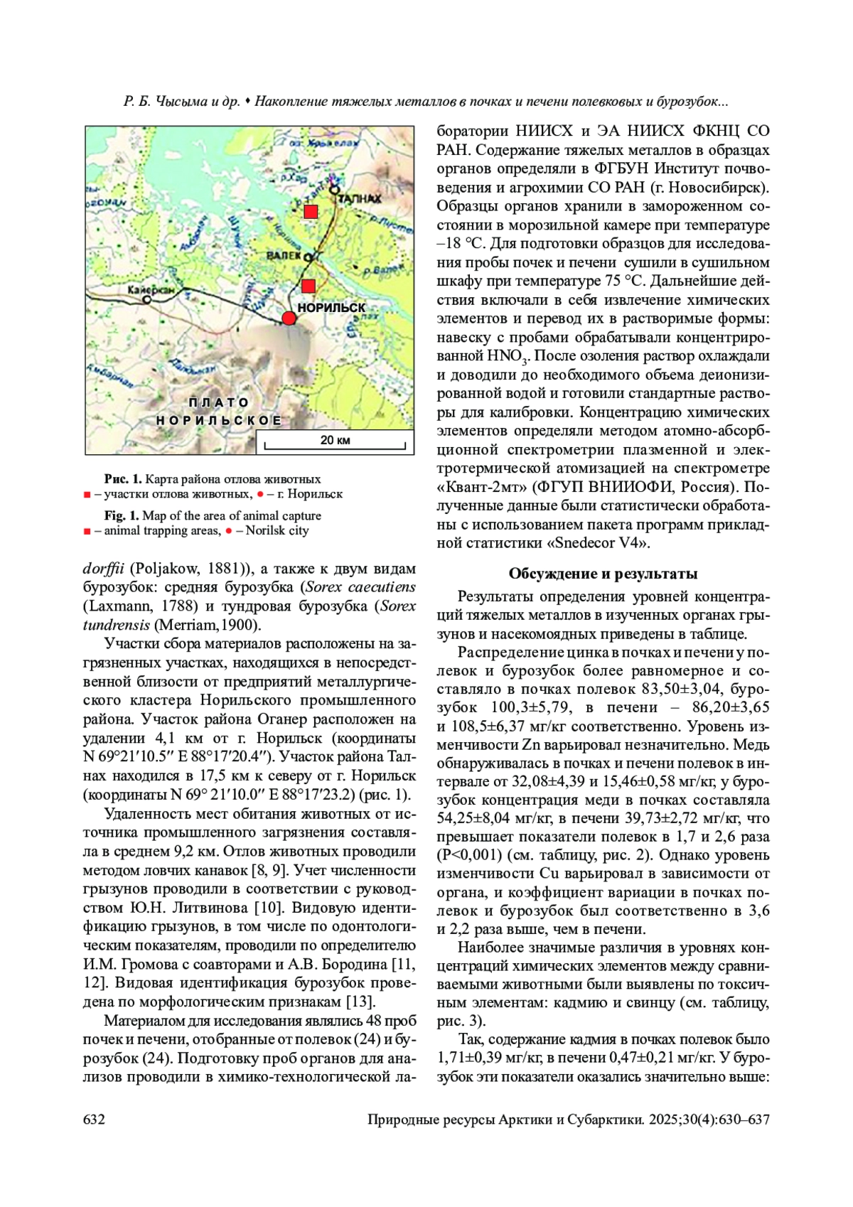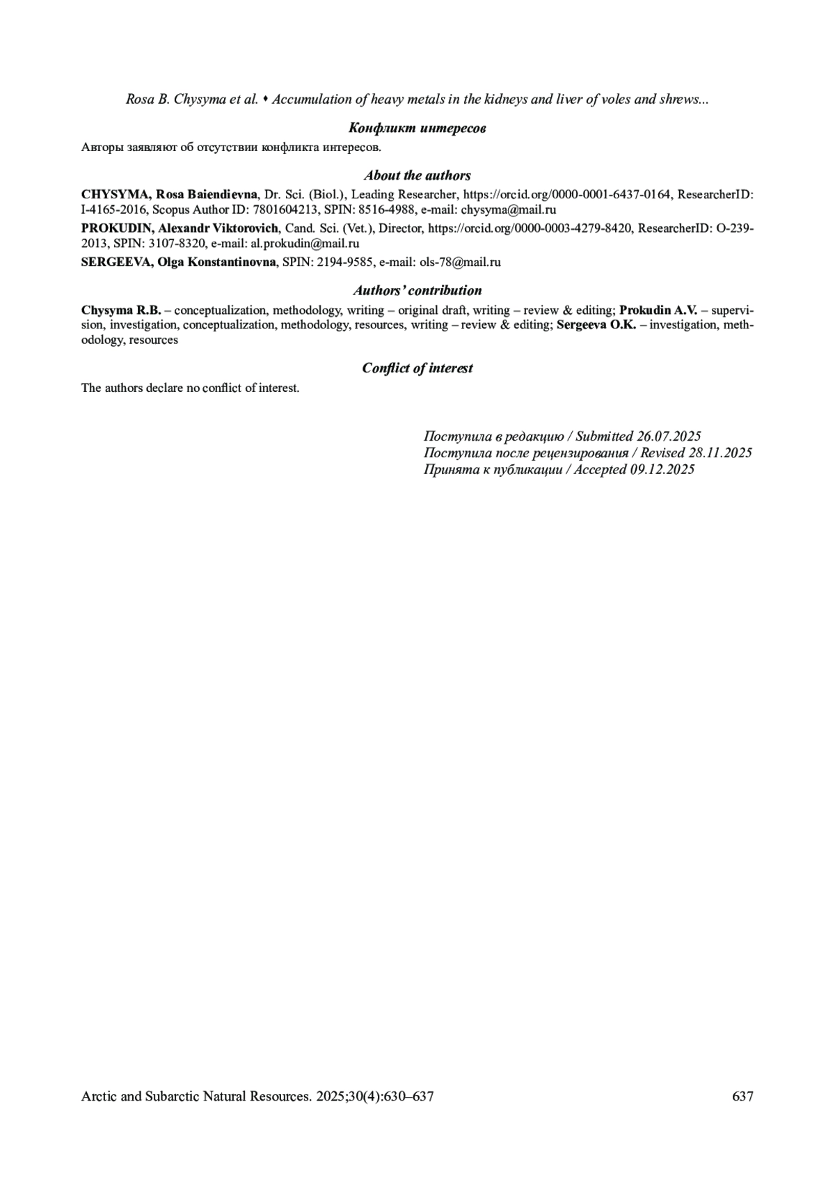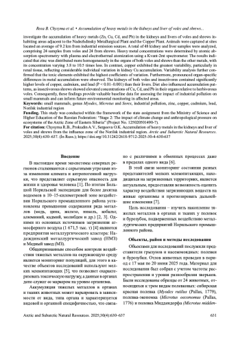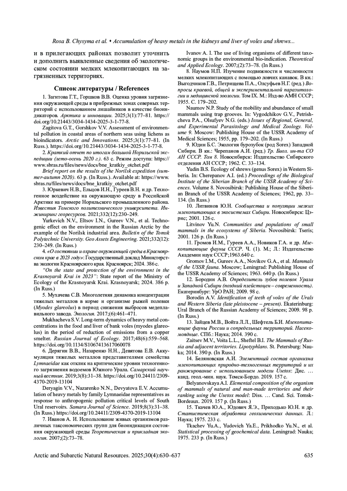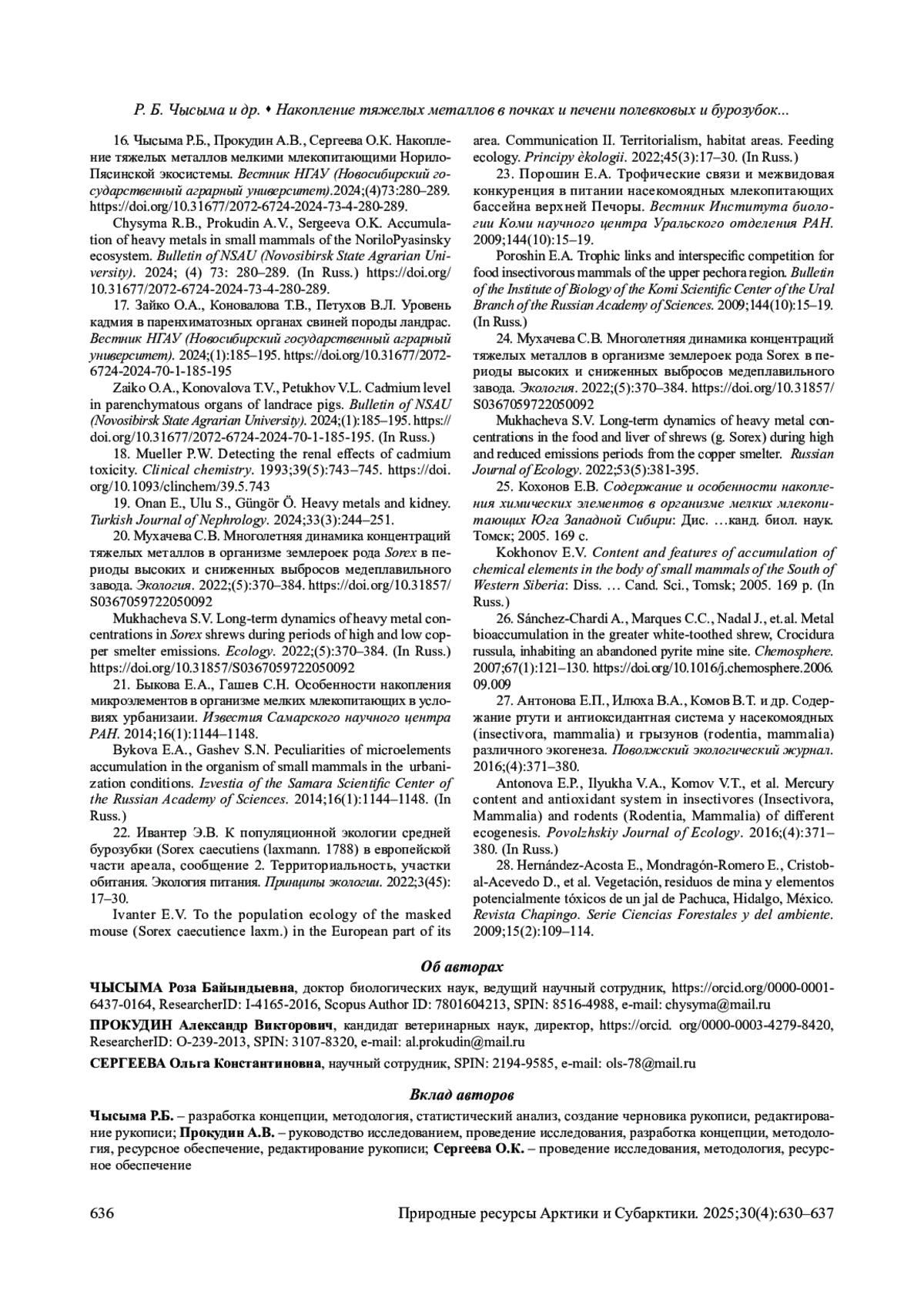 16. Чысыма Р.Б., Прокудин А.В., Сергеева О.К. Накопление тяжелых металлов мелкими млекопитающими Норило Пясинской экосистемы. Вестник НГАУ (Новосибирский государственный аграрный университет).2024;(4)73:280-289. DOI: 10.31677/2072-6724-2024-73-4-280-289