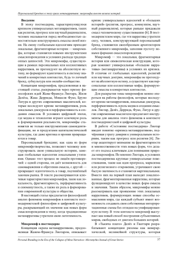 В эпоху постмодерна, характеризующуюся кризисом универсальных метанарративов, таких как религия, прогресс или научный рационализм, человек оказывается перед необходимостью самостоятельно конструировать смыслы своей жизни. На смену глобальным идеологиям приходят локальные, фрагментарные истории — микромифы, которые становятся новыми инструментами смыслопорождения в условиях распада традиционных ценностей. Эти микромифы, существующие в рамках персональных или коллективных нарративов, не претендуют на абсолютную истину, но формируют идентичность и систему значений в конкретных контекстах, будь то личный бренд, субкультура или онлайн- сообщество.