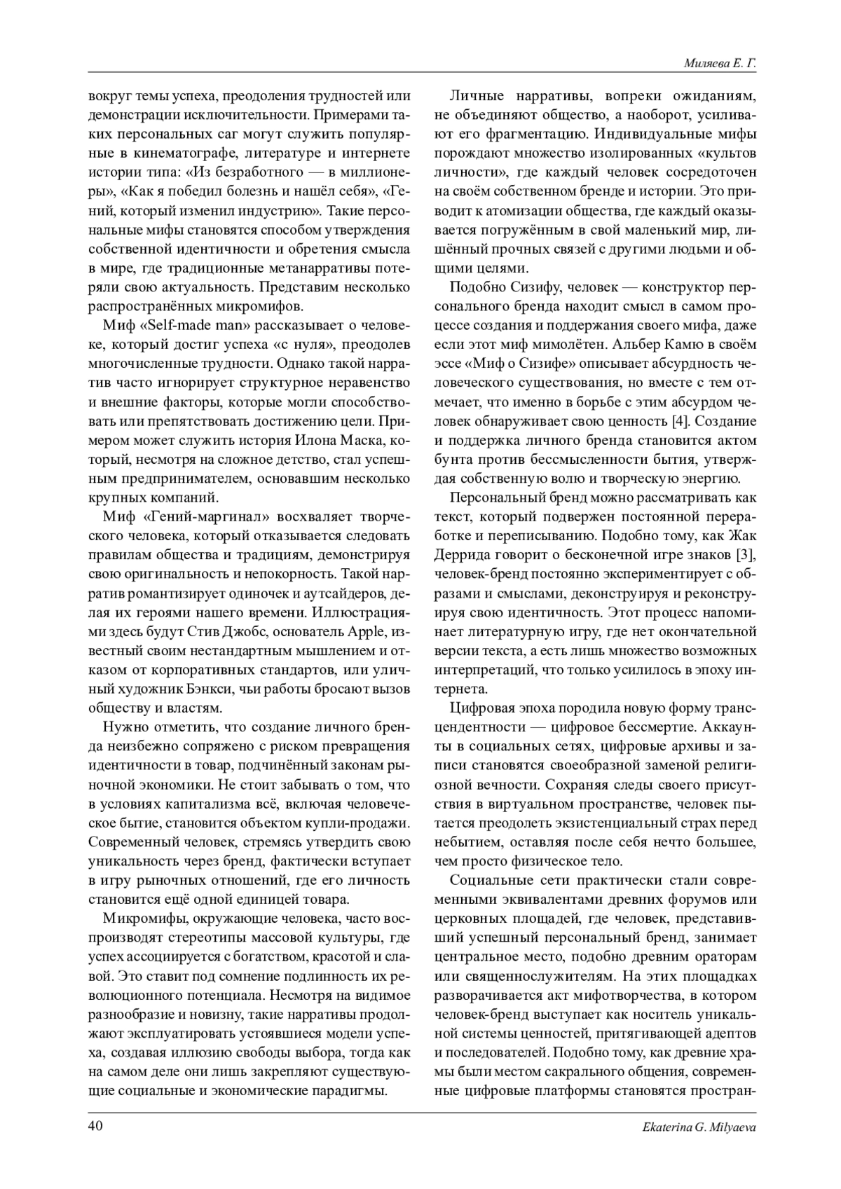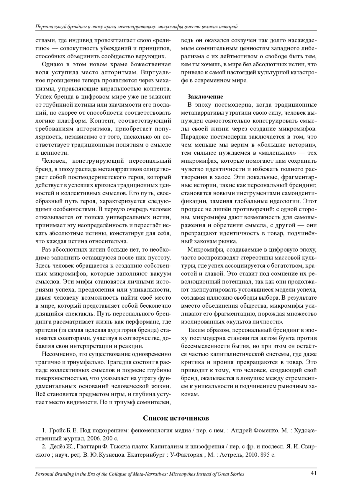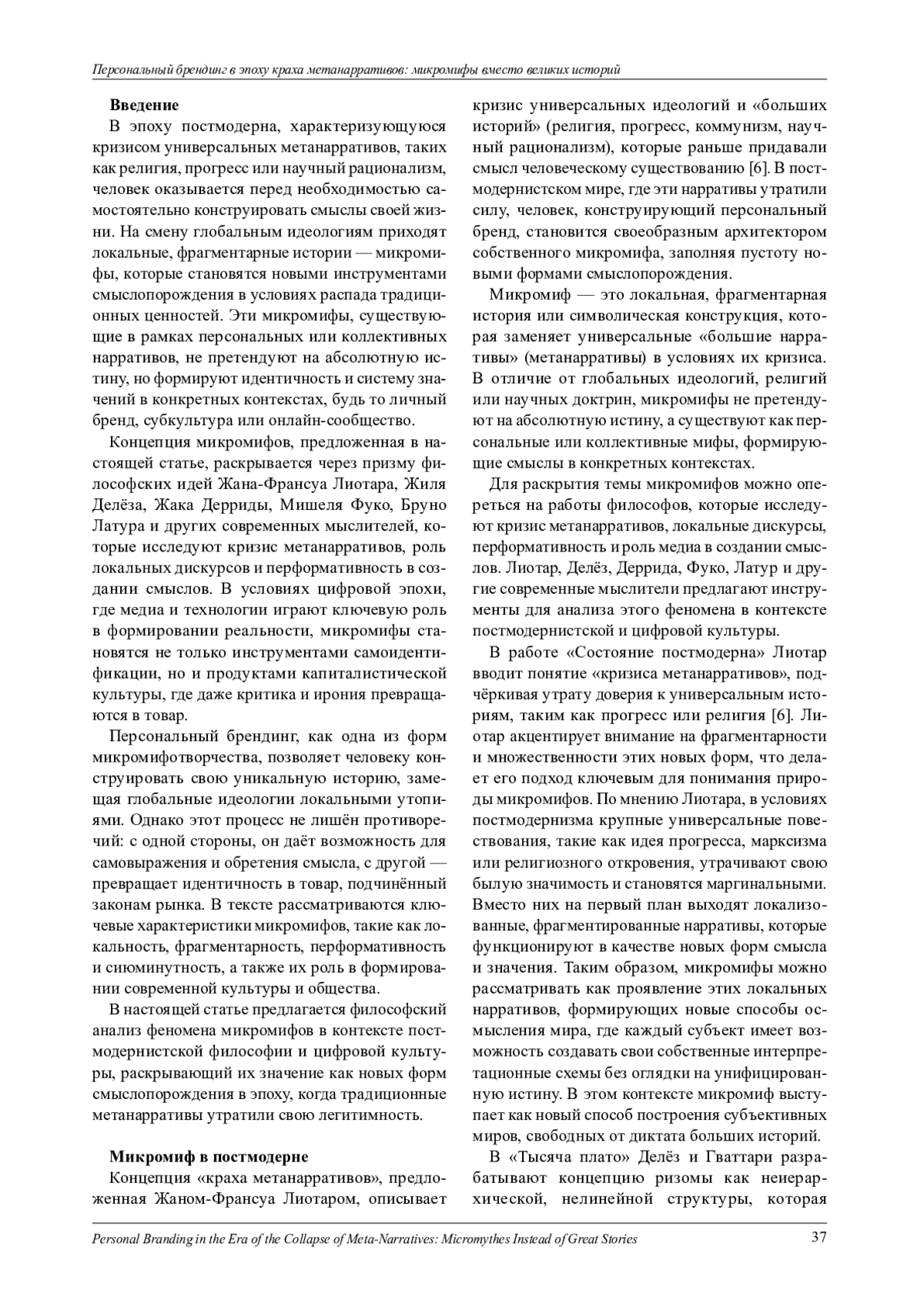 Исследован феномен персонального брендинга в контексте постмодернистской философии, где традиционные метанарративы, такие как религия, прогресс и наука, утратили свою легитимность. Рассмотрены микромифы как локальные, фрагментарные нарративы, которые заменяют глобальные идеологии и становятся инструментами самоидентификации в условиях цифровой культуры. Микромифы, создаваемые через персональный брендинг, позволяют индивиду конструировать уникальную историю, но одновременно превращают идентичность в товар, подчинённый законам рынка. В статье анализируются философские концепции Жана-Франсуа Лиотара, Жиля Делёза, Жака Дерриды, Мишеля Фуко, Бруно Латура и других мыслителей, что позволяет раскрыть роль микромифов в современной культуре и их влияние на общество. Описан кризис метанарративов, который был впервые обозначен Жаном-Франсуа Лиотаром. В эпоху постмодерна универсальные идеологии, такие как вера в прогресс, научный рационализм или религиозные доктрины, перестали быть основой для формирования смыслов. На смену им пришли локальные, фрагментарные истории - микромифы, которые становятся новыми инструментами смыслопорождения. Эти микромифы не претендуют на абсолютную истину, но формируют идентичность и систему значений в конкретных контекстах, будь то личный бренд, субкультура или онлайн-сообщество. Подчёркнуто, что микромифы обладают рядом ключевых характеристик: локальностью, фрагментарностью, перформативностью и сиюминутностью. Они функционируют в ограниченных рамках, будь то личный бренд или субкультура, и не требуют целостности или строгой логики. Микромифы существуют через постоянное повторение и воспроизводство, что делает их перформативными конструкциями. В условиях цифровой эпохи они легко адаптируются к новым трендам и быстро устаревают, что отражает временную природу современного культурного пространства. Необходимым является обращение к философским концепциям, чтобы раскрыть природу микромифов. Лиотар в своей работе «Состояние постмодерна» описывает кризис метанарративов и переход к локальным, фрагментированным нарративам. Делёз и Гваттари в «Тысяче плато» развивают идею ризомы как неиерархической структуры, которая отражает фрагментарность и множественность микромифов. Деррида в «О грамматологии» подчёркивает, что смысл всегда находится в процессе интерпретации, что особенно актуально для анализа микромифов как перформативных конструкций. Бруно Латур в рамках акторно-сетевой теории рассматривает микромифы как часть сетевых взаимодействий, где каждый актор, включая алгоритмы и платформы, участвует в их создании и распространении. Особое внимание уделяется роли персонального брендинга как одной из форм микромифотворчества. В условиях отсутствия устойчивых метанарративов человек вынужден самостоятельно конструировать свою идентичность через создание личного бренда. Этот процесс позволяет индивиду выразить свои ценности, сформулировать миссию и создать узнаваемую эстетику. Однако автор указывает на противоречия этого процесса: с одной стороны, персональный брендинг даёт возможность для самовыражения и обретения смысла, с другой - он превращает идентичность в товар, подчинённый рыночным законам. Также рассмотрены примеры популярных микромифов, таких как «Self-made man» и