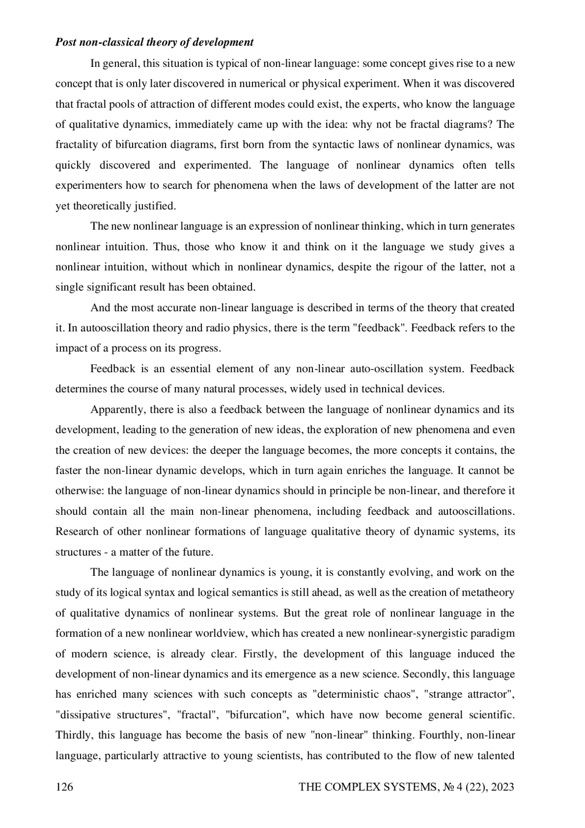 The huge role of a non-linear language in the formation of a new non-linear worldview, which created a new non-linear-synergetic paradigm of modern science, is shown. First, the development of this language induced the development of nonlinear dynamics and its formation as a new science. Secondly, this language has enriched many sciences with such concepts as “deterministic chaos”, “strange attractor”, “dissipative structures”, “fractal”, “bifurcation”, which have now become general scientific. Thirdly, this language formed the basis of a new “non-linear” thinking. Fourth, the non-linear language, which is especially attractive to young scientists, has contributed to the influx of new talented scientists into non-linear dynamics. All of the above played a decisive role in the formation of a new general scientific non-linear paradigm, impossible and inconceivable without a new language. It is thanks to this language that modern scientists look at the world with a “nonlinear vision”, not imagining a linear reality, incomparably enriching their ideas about everything that exists and develops. So, eidetically varying the concept of “chaos”, outlined the range of systems that allow chaotic behavior, found out the methodological principles for the study of such systems, determined the characteristic features of chaotic development, and thus passed the “second stage” of the phenomenological analysis of deterministic chaos.