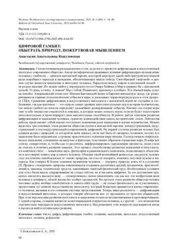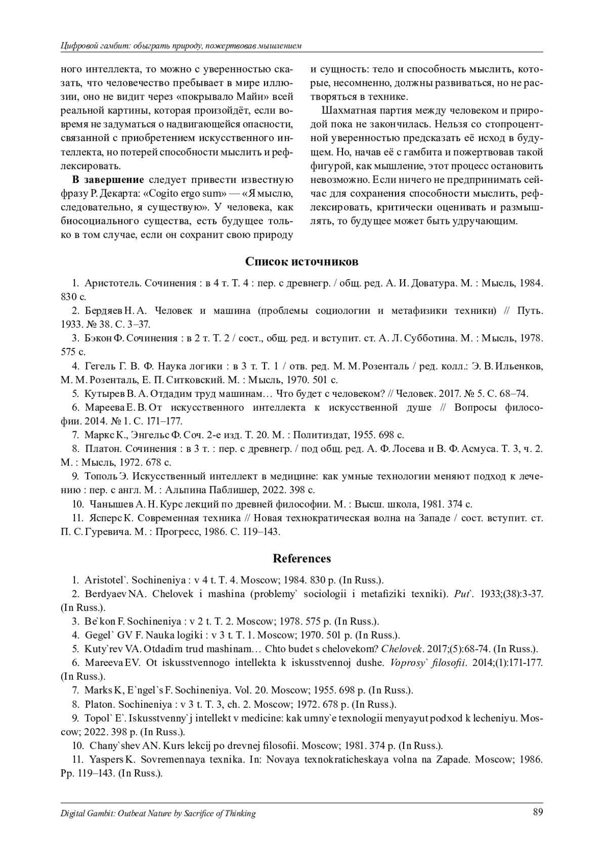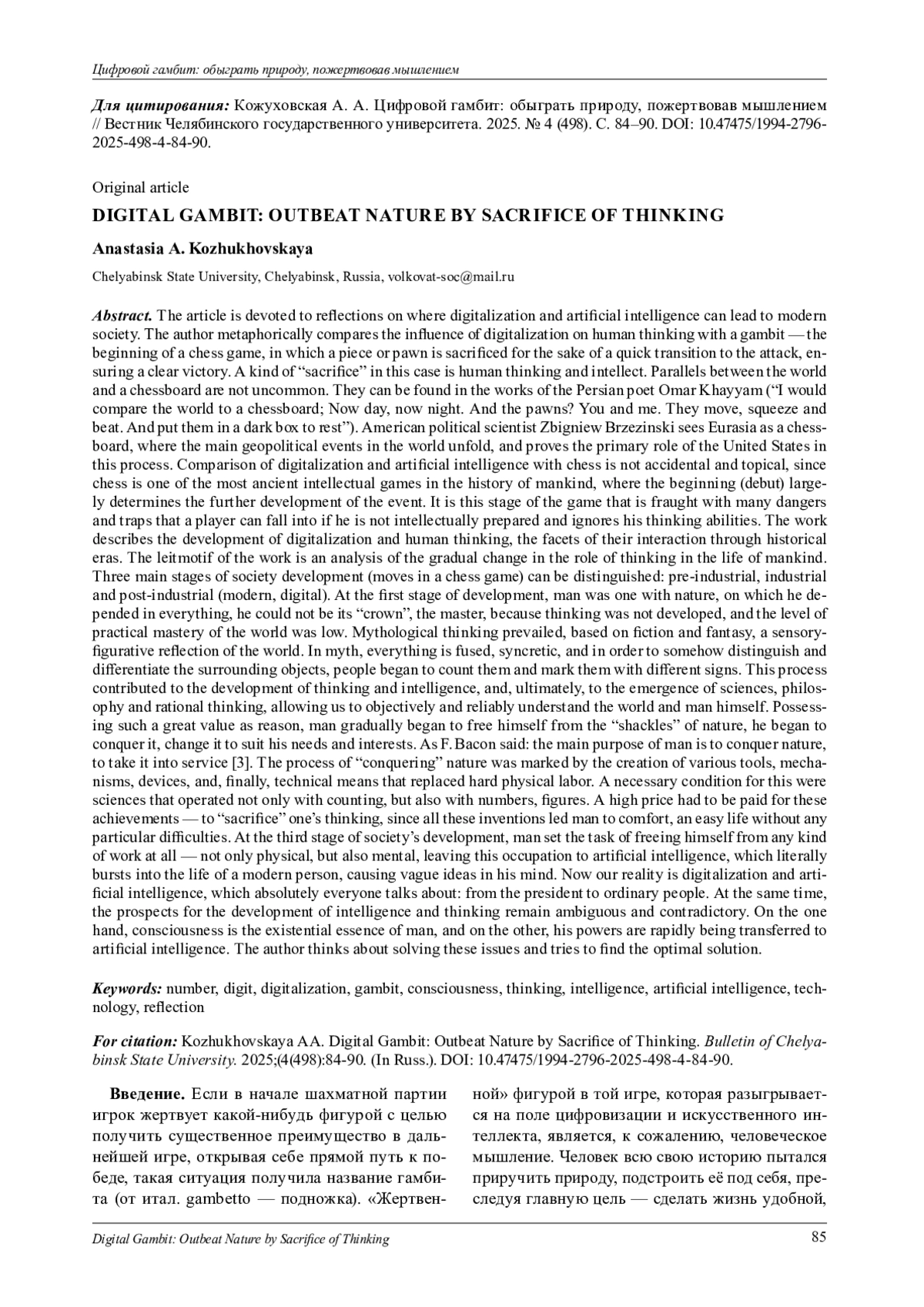 Статья посвящена размышлениям о том, куда могут привести цифровизация и искусственный интеллект современное общество. Автор метафорически сравнивает влияние цифровизации на мышление человека с гамбитом - началом шахматной партии, в которой жертвуют какой-либо фигурой или пешкой ради скорейшего перехода в нападение, обеспечивающее явную победу. Своеобразной «жертвой» в данном случае является мышление и интеллект человека. Параллели между миром и шахматной доской - не редкое явление. Их можно найти у персидского поэта Омара Хайяма («Мир я сравнил бы с шахматной доской; То день, то ночь. А пешки? Мы с тобой. Подвигают, притиснут и побьют. И в тёмный ящик сунут на покой»). Американский политолог Збигнев Бжезинский видит в Евразии шахматную доску, где разворачиваются главные геополитические события в мире, и доказывает первоочередную роль в этом процессе США. Сравнение цифровизации и искусственного интеллекта с шахматной игрой не случайно и злободневно, так как шахматы - это одна из самых древних интеллектуальных игр в истории человечества, где начало (дебют) во многом определяет дальнейшее разворачивание события. Именно эта стадия игрытаит в себе множество опасностей и ловушек, в которые может попасть игрок, если не будет подготовлен интеллектуально и проигнорирует свои мыслительные способности. В работе даётся описание развития цифровизации и мышления человека, грани их взаимодействия сквозь исторические эпохи. Лейтмотив работы представляет собой анализ поэтапного изменения роли мышления в жизни человечества. Можно выделить три основных этапа развития общества (ходов в шахматной партии): доиндустриальный, индустриальный и постиндустриальный (современный, цифровой). На первой ступени развития человек был единым целым с природой, от которой во всём зависел, он не мог быть её «венцом», хозяином, потому что мышление было неразвитым, а уровень практического освоения мира низким. Господствовало мифологическое мышление, основанное на выдумке и фантазии, чувственнообразном отражении мира. В мифе всё слитно, синкретично, и, чтобы как-то различать, дифференцировать окружающие предметы, люди стали их считать и отмечать разными знаками. Этот процесс способствовал развитию мышления и интеллекта, а в конечном счёте - появлению наук, философии и рационального мышления, позволяющего объективно и достоверно понять мир и самого человека. Обладая такой величайшей ценностью, как разум, человек стал постепенно освобождаться от «оков» природы, он стал её покорять, изменять под свои нужды и интересы. Как говорил Ф. Бэкон: основное назначение человека - покорить природу, взять её в услужение [3]. Процесс «покорения» природы ознаменовался созданием различных орудий, механизмов, приспособлений и, наконец, технических средств, заменивших тяжёлый физический труд. Необходимым условием для этого были науки, оперировавшие не только счётом, но и числами, цифрами. За эти достижения пришлось заплатить высокую цену - «пожертвовать» своим мышлением, так как все эти изобретения вели человека к комфорту, лёгкой жизни без особых трудностей. На третьем этапе развития общества человек поставил задачу вообще освободиться от какого-либо труда - не только физического, но и умственного, предоставив это занятие искусственному интеллекту, который буквально 