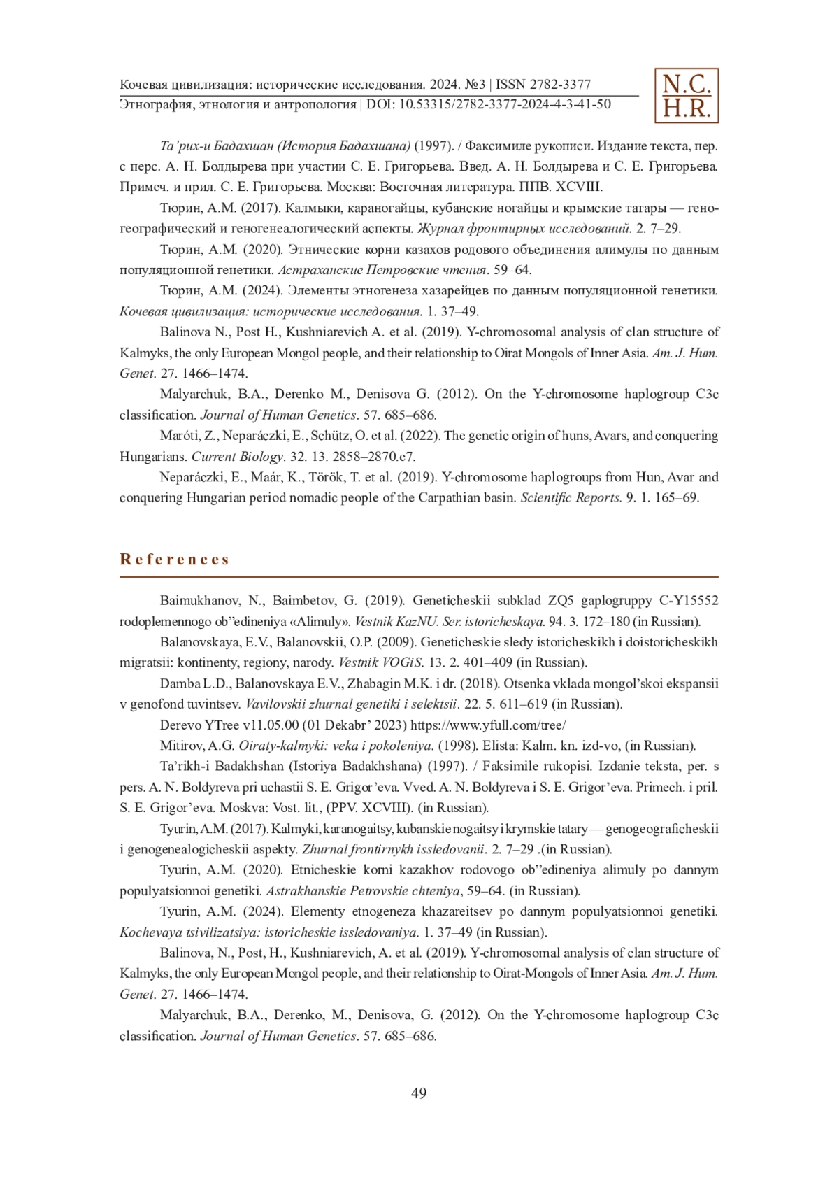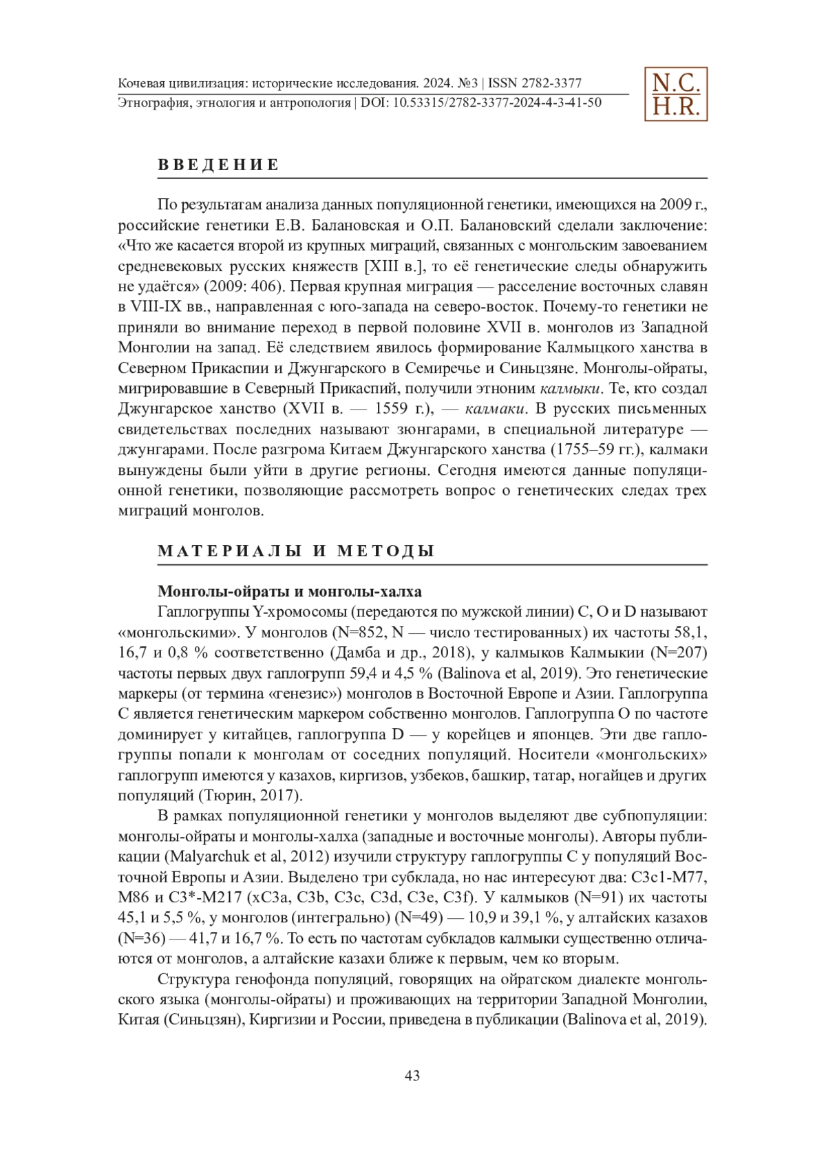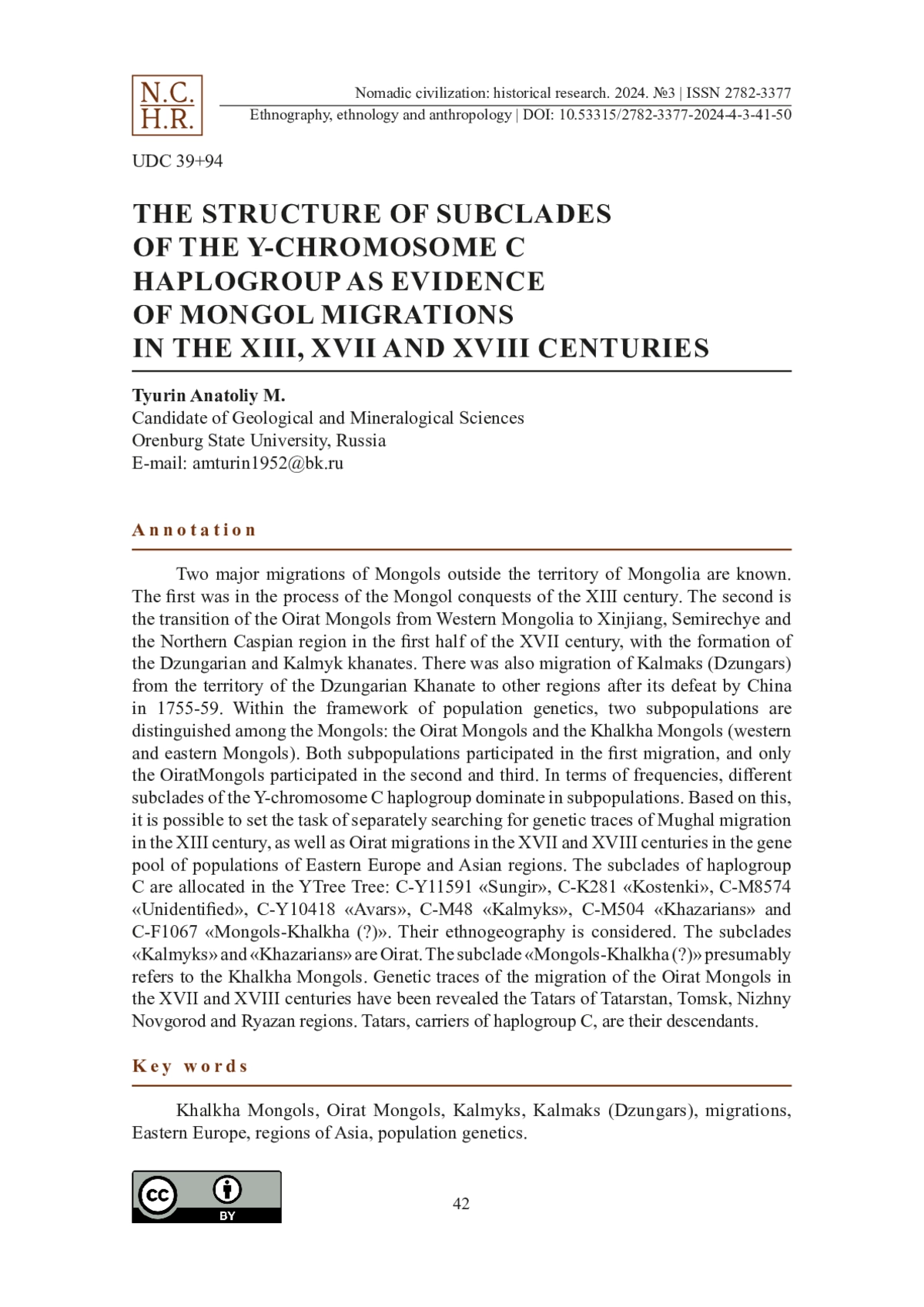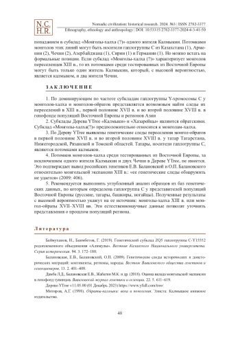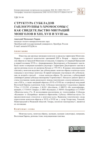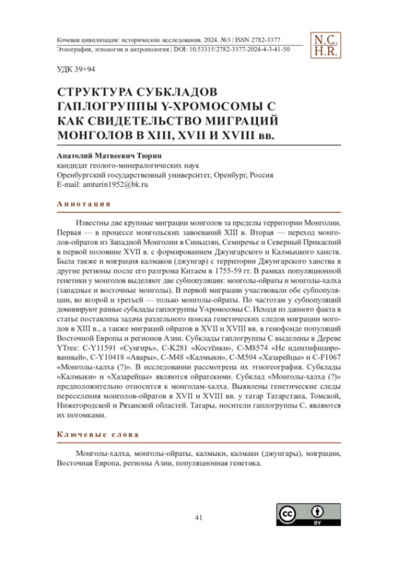 Известны две крупные миграции монголов за пределы территории Монголии. Первая — в процессе монгольских завоеваний XIII в. Вторая — переход монголов-ойратов из Западной Монголии в Синьцзян, Семиречье и Северный Прикаспий в первой половине XVII в. с формированием Джунгарского и Калмыцкого ханств. Была также и миграция калмаков (джунгар) с территории Джунгарского ханства в другие регионы после его разгрома Китаем в 1755-59 гг. В рамках популяционной генетики у монголов выделяют две субпопуляции: монголы-ойраты и монголы-халха (западные и восточные монголы). В первой миграции участвовали обе субпопуляции, во второй и третьей — только монголы-ойраты. По частотам у субпопуляций доминируют разные субклады гаплогруппы Y-хромосомы С. Исходя из данного факта в статье поставлена задача раздельного поиска генетических следов миграции моголов в XIII в., а также миграций ойратов в XVII и XVIII вв. в генофонде популяций Восточной Европы и регионов Азии. Субклады гаплогруппы C выделены в Дереве YTree: C-Y11591 «Сунгирь», C-K281 «Костёнки», C-M8574 «Не идентифицированный», C-Y10418 «Авары», C-M48 «Калмыки», C-M504 «Хазарейцы» и C-F1067 «Монголы-халха (?)». В исследовании рассмотрена их этногеография. Субклады «Калмыки» и «Хазарейцы» являются ойратскими. Субклад «Монголы-халха (?)» предположительно относится к монголам-халха. Выявлены генетические следы переселения монголов-ойратов в XVII и XVIII вв. у татар Татарстана, Томской, Нижегородской и Рязанской областей. Татары, носители гаплогруппы C, являются их потомками.