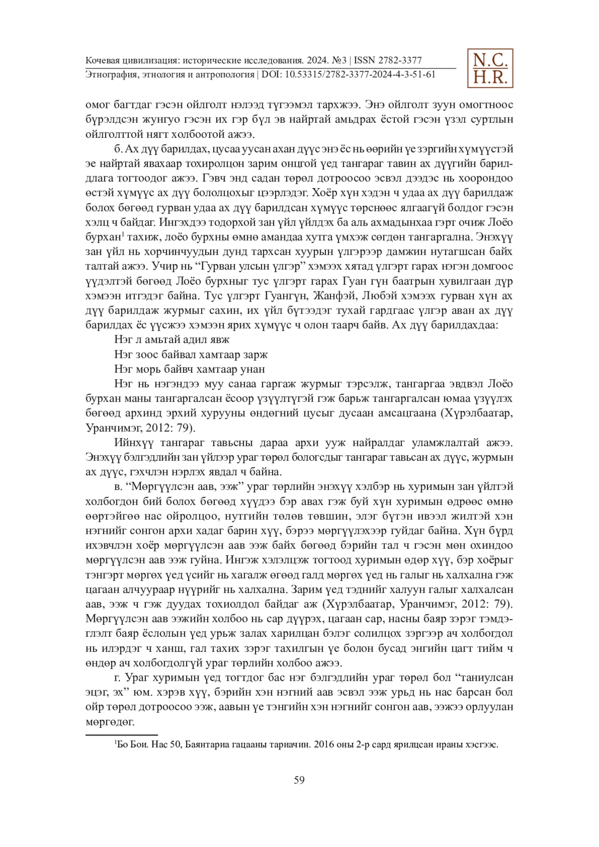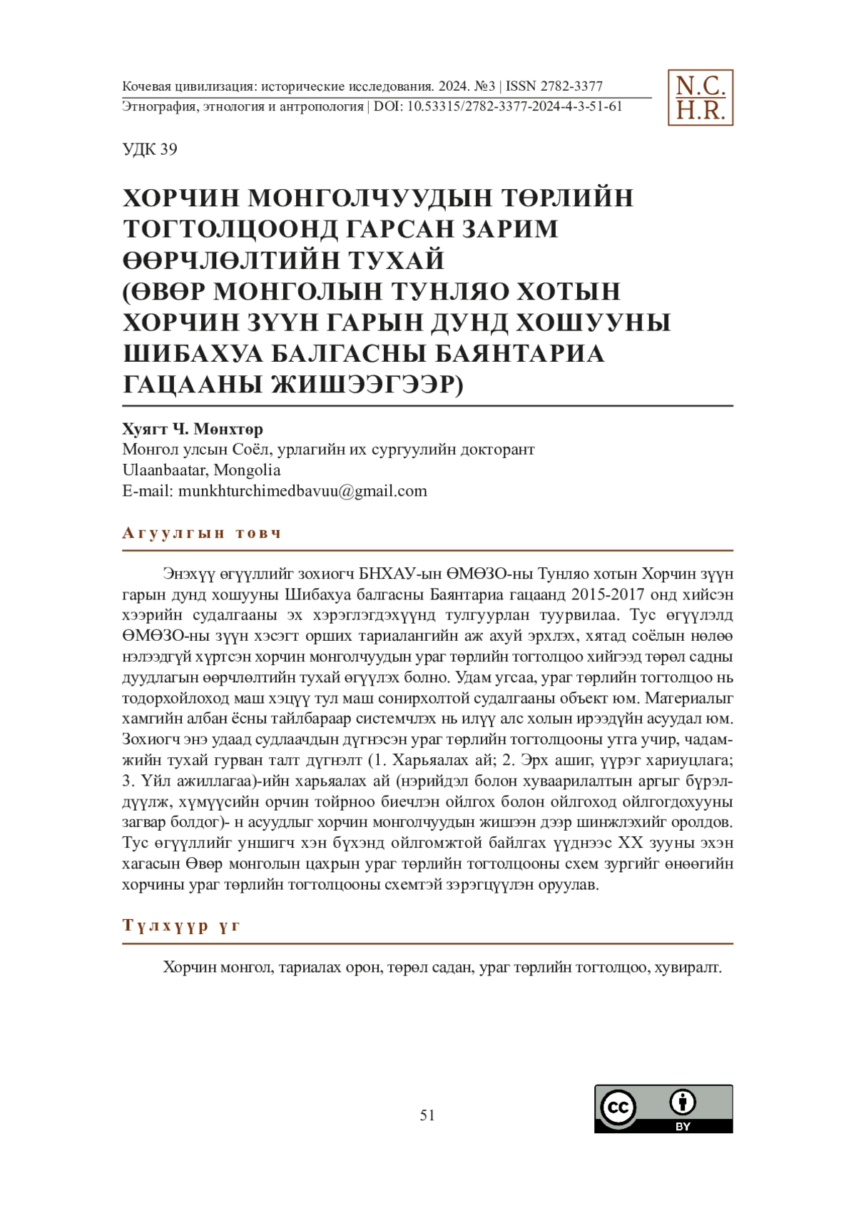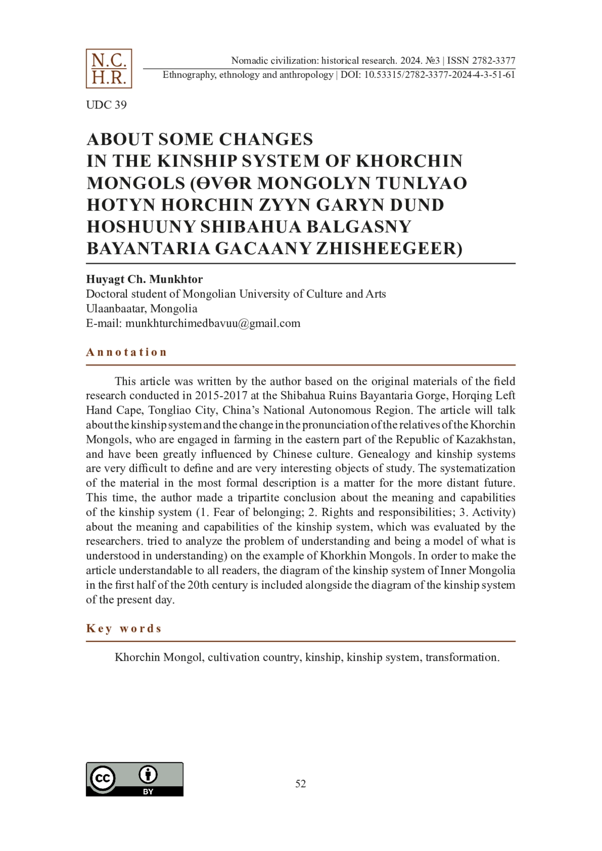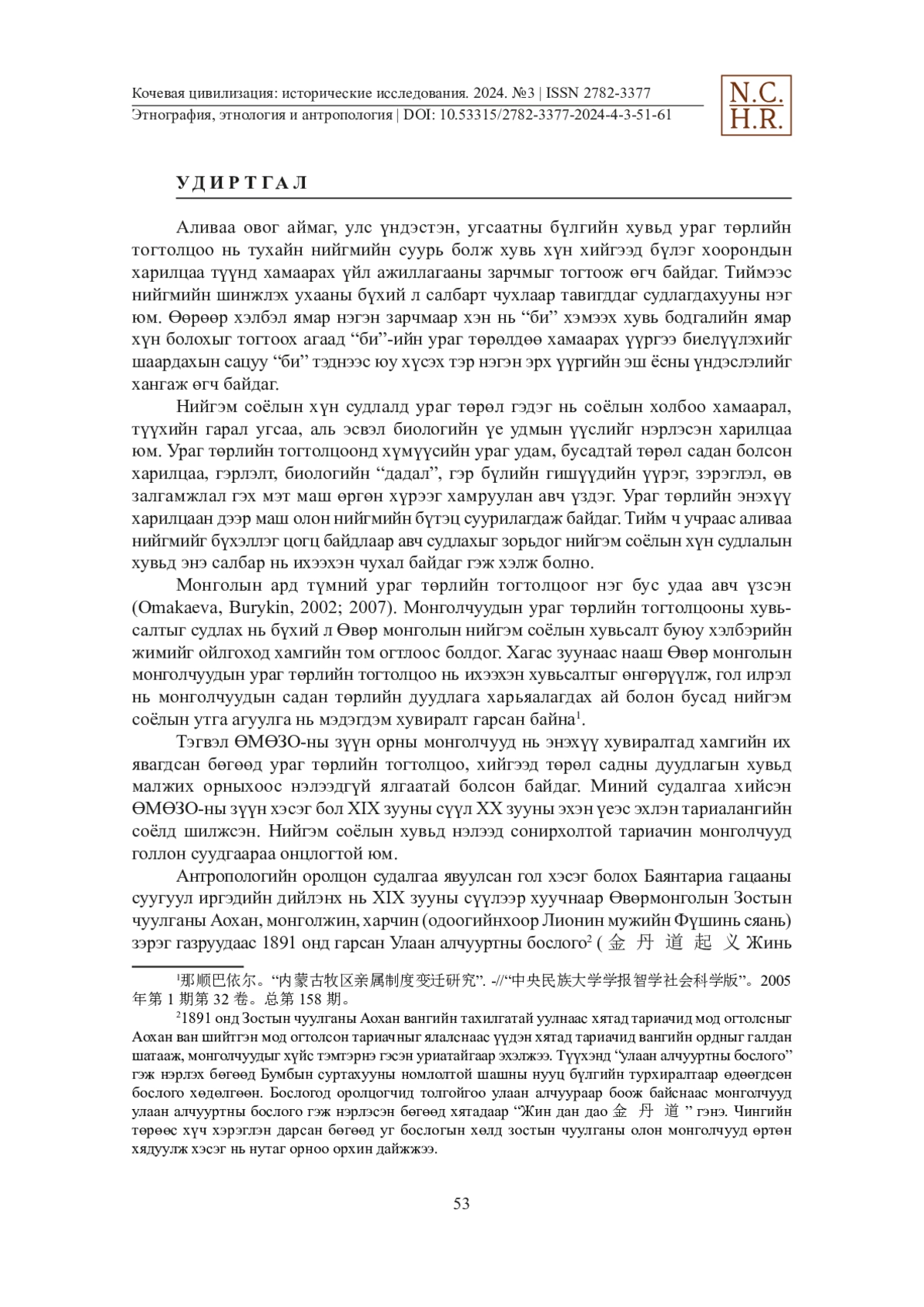 Энэхүү өгүүллийг зохиогч БНХАУ-ын ӨМӨЗО-ны Тунляо хотын Хорчин зүүн гарын дунд хошууны Шибахуа балгасны Баянтариа гацаанд 2015-2017 онд хийсэн хээрийн судалгааны эх хэрэглэгдэхүүнд тулгуурлан туурвилаа. Тус өгүүлэлд ӨМӨЗО-ны зүүн хэсэгт орших тариалангийн аж ахуй эрхлэх, хятад соёлын нөлөө нэлээдгүй хүртсэн хорчин монголчуудын ураг төрлийн тогтолцоо хийгээд төрөл садны дуудлагын өөрчлөлтийн тухай өгүүлэх болно. Удам угсаа, ураг төрлийн тогтолцоо нь тодорхойлоход маш хэцүү тул маш сонирхолтой судалгааны объект юм. Материалыг хамгийн албан ёсны тайлбараар системчлэх нь илүү алс холын ирээдүйн асуудал юм. Зохиогч энэ удаад судлаачдын дүгнэсэн ураг төрлийн тогтолцооны утга учир, чадамжийн тухай гурван талт дүгнэлт (1. Харьяалах ай; 2. Эрх ашиг, үүрэг хариуцлага; 3. Үйл ажиллагаа)-ийн харьяалах ай (нэрийдэл болон хуваарилалтын аргыг бүрэлдүүлж, хүмүүсийн орчин тойрноо биечлэн ойлгох болон ойлгоход ойлгогдохууны загвар болдог)- н асуудлыг хорчин монголчуудын жишээн дээр шинжлэхийг оролдов. Тус өгүүллийг уншигч хэн бүхэнд ойлгомжтой байлгах үүднээс XX зууны эхэн хагасын Өвөр монголын цахрын ураг төрлийн тогтолцооны схем зургийг өнөөгийн хорчины ураг төрлийн тогтолцооны схемтэй зэрэгцүүлэн оруулав.