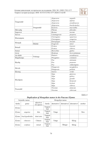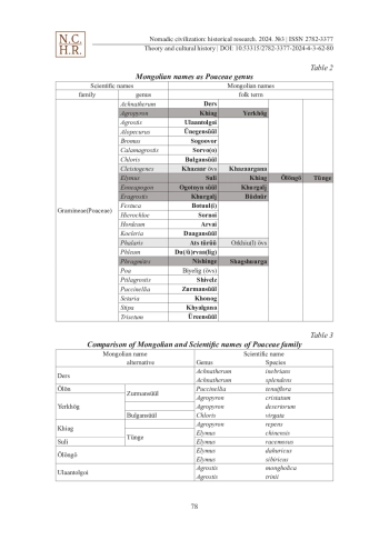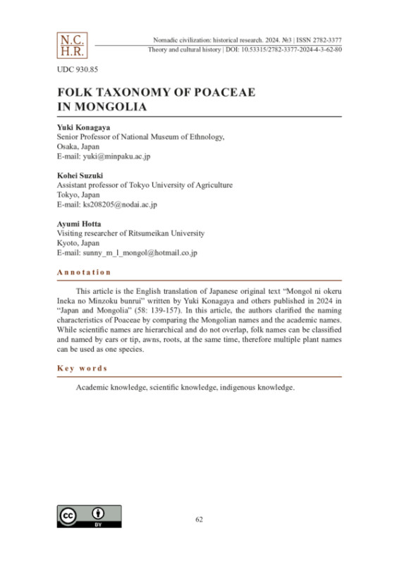 This article is the English translation of Japanese original text “Mongol ni okeru Ineka no Minzoku bunrui” written by Yuki Konagaya and others published in 2024 in “Japan and Mongolia” (58: 139-157). In this article, the authors clarified the naming characteristics of Poaceae by comparing the Mongolian names and the academic names. While scientific names are hierarchical and do not overlap, folk names can be classified and named by ears or tip, awns, roots, at the same time, therefore multiple plant names can be used as one species.