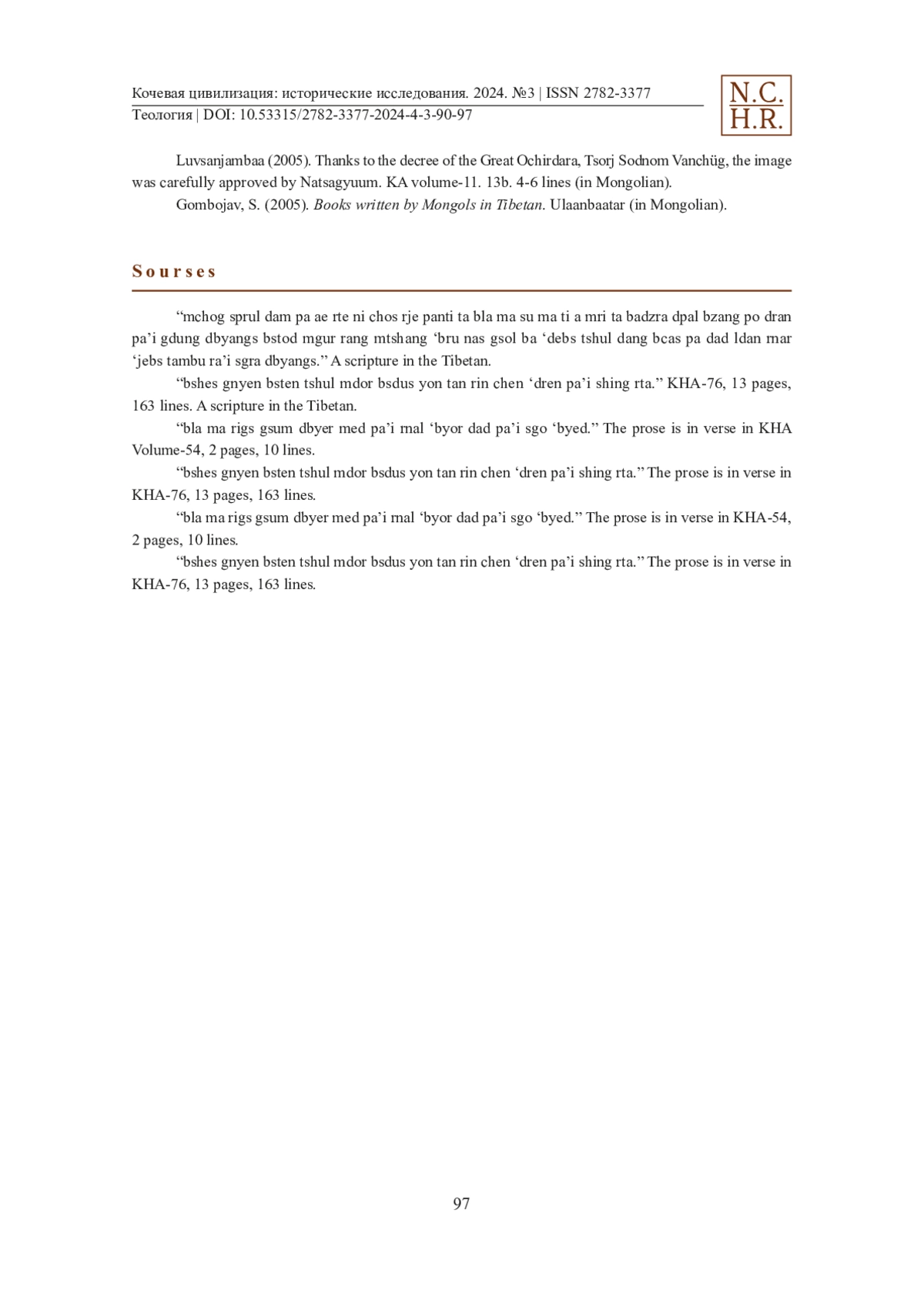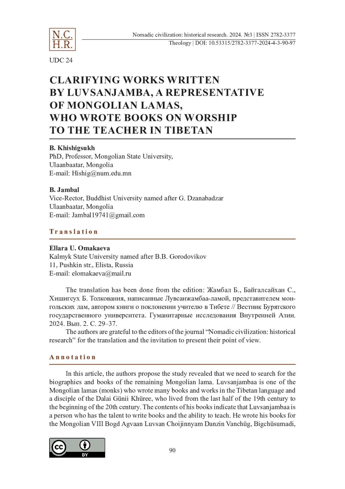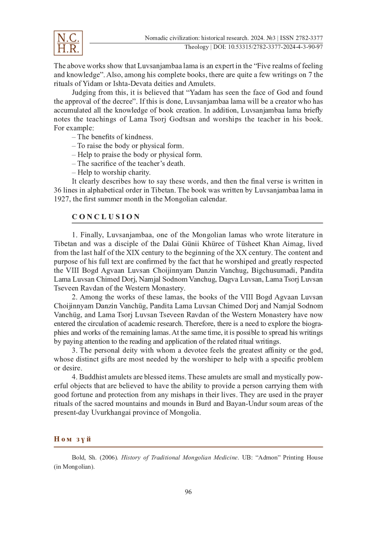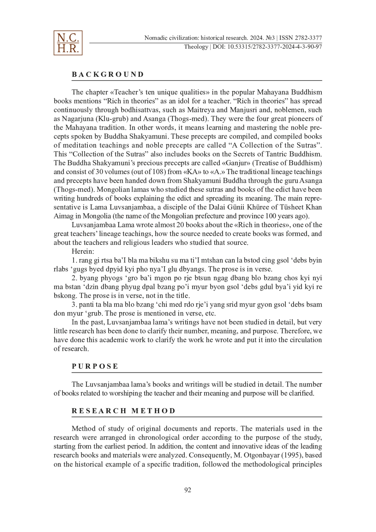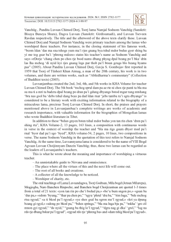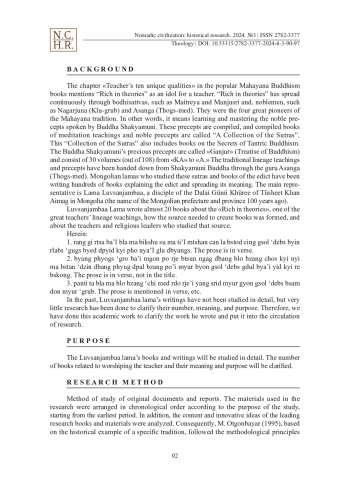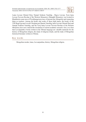 In this article, the authors propose the study revealed that we need to search for the biographies and books of the remaining Mongolian lama. Luvsanjambaa is one of the Mongolian lamas (monks) who wrote many books and works in the Tibetan language and a disciple of the Dalai Günii Khüree, who lived from the last half of the 19th century to the beginning of the 20th century. The contents of his books indicate that Luvsanjambaa is a person who has the talent to write books and the ability to teach. He wrote his books for the Mongolian VIII Bogd Agvaan Luvsan Choijinnyam Danzin Vanchüg, Bigchüsumadi, Lama Luvsan Chimed Dorj, Namjal Sodnom Vanchüg, Dagva Luvsan, Tsorj lama Luvsan Tseveen Ravdan of the Western Monastery (Shangkh Monastery was located in Kharkhorin soum area of Ӧverkhangai province of present-day Mongolia) and respecting them as teachers. Among the books and works of these high lamas, the books of the VIII Bogd Agvaan Luvsan Choijinnyam Danzin Vanchüg, lama Luvsan Chimed Dorj and Namjal Sodnom Vanchüg, and the Tsorj lama Luvsan Tseveen Ravdan of the Western Monastery have now entered the circulation of current academic research. Also, it is clear that Luvsanjamba’s books written in the Tibetan language are valuable materials for the history of Mongolian religion, the study of religious rituals, and the study of Mongolian historical literature written in Tibetan.