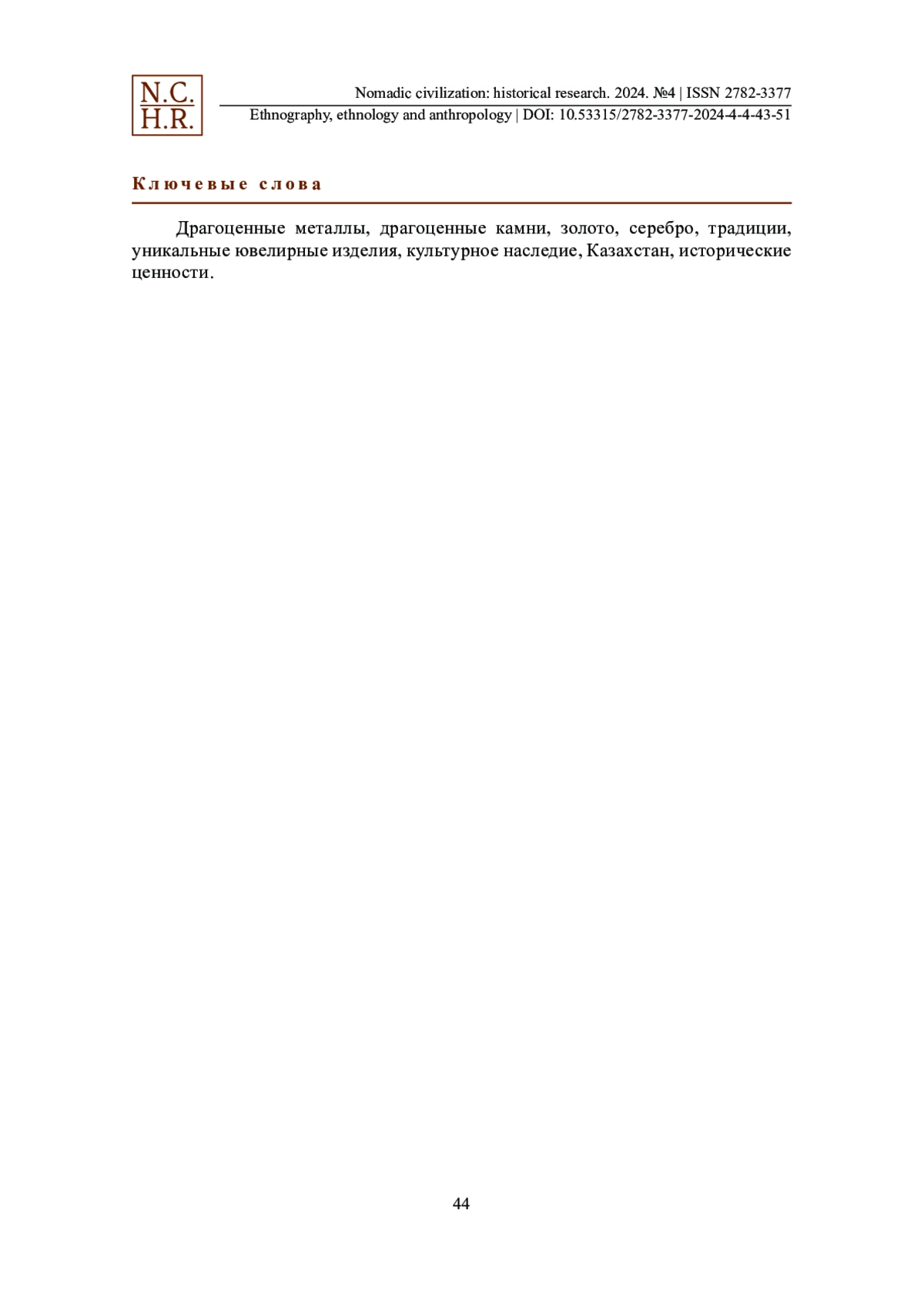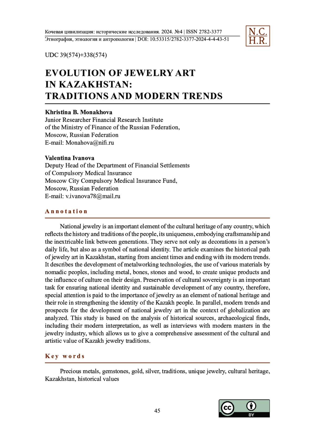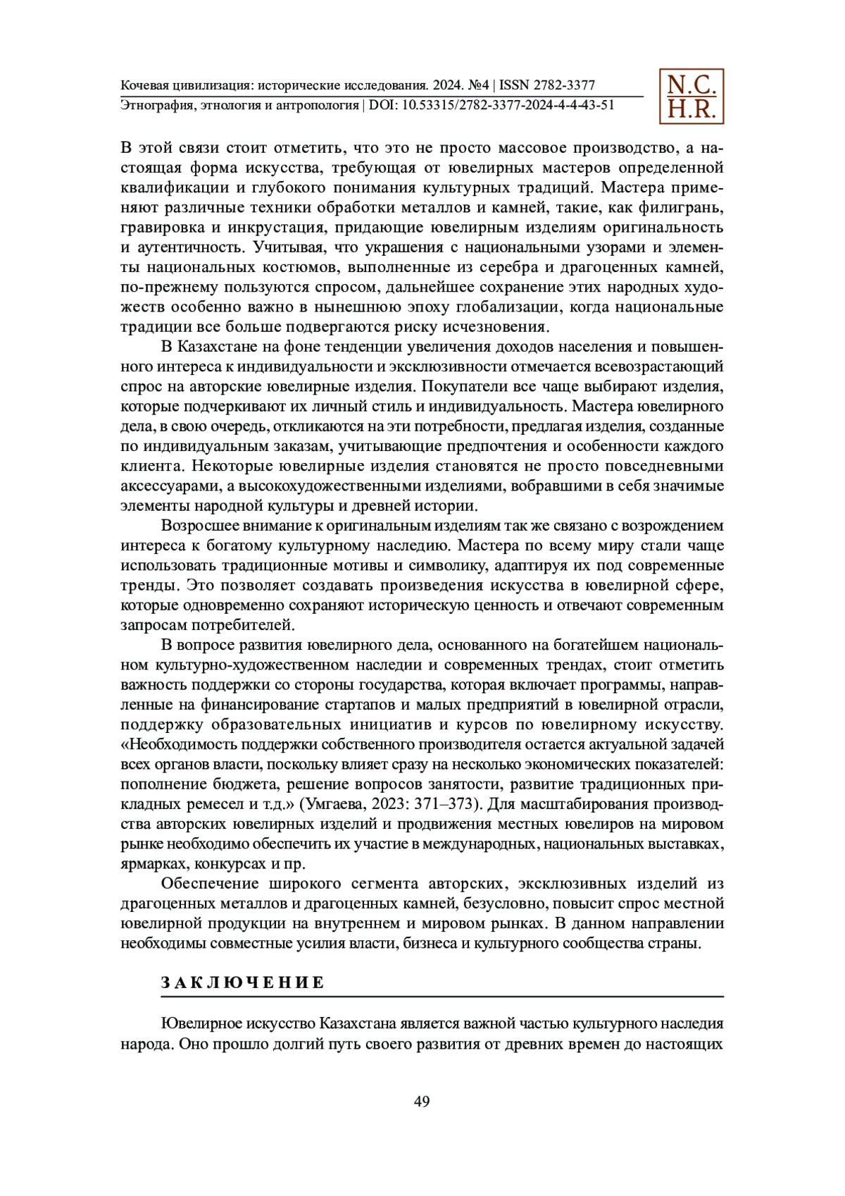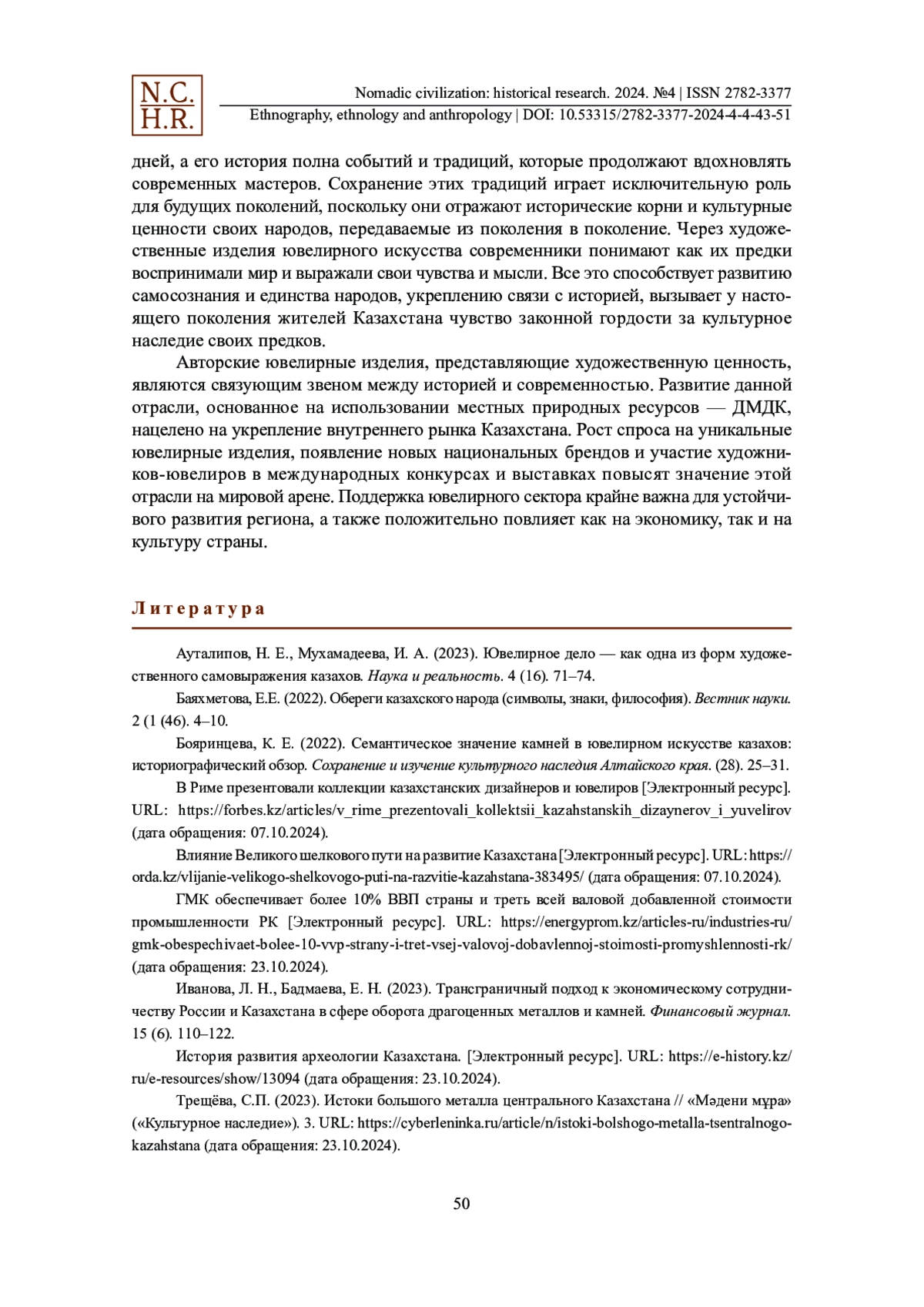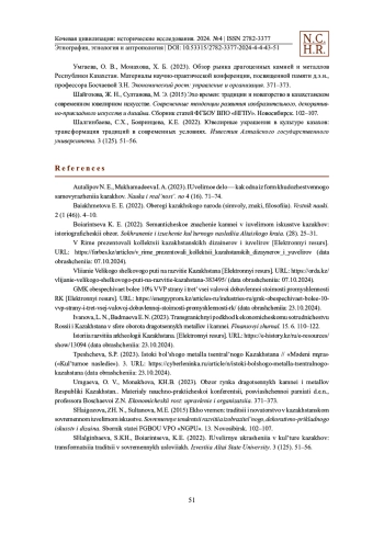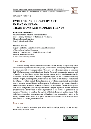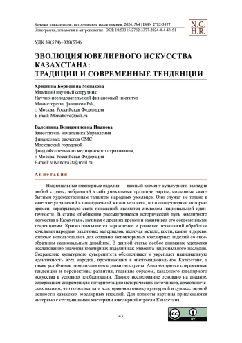 Национальные ювелирные изделия — важный элемент культурного наследия любой страны, вобравший в себя уникальные традиции народа, созданные самобытным художественным талантом народных умельцев. Они служат не только в качестве украшений в повседневной жизни человека, но и олицетворяют историю времен, неразрывную связь поколений, являются символом национальной идентичности. В статье обобщенно рассматривается исторический путь ювелирного искусства в Казахстане, начиная с древних времен и заканчивая его современными тенденциями. Кратко описывается зарождение и развитие технологий обработки кочевыми народами различных материалов, включая металл, кости, камни и дерево, которые использовались для создания неповторимых ювелирных изделий со своеобразным национальным дизайном. В данной статье особое внимание уделяется исследованию значения ювелирных изделий как элемента национального наследия. Сохранение культурного суверенитета обеспечивает и укрепляет национальную идентичность всех народов, проживающих в многонациональном Казахстане, а также устойчивое цивилизационное развитие страны. Анализируются современные тенденции и перспективы развития, главным образом, казахского ювелирного искусства в условиях глобализации. Данное исследование основано на анализе, содержащем современную интерпретацию исторических источников, археологических находок, что позволяет дать всестороннюю оценку культурной и художественной ценности казахских ювелирных изделий. Для полноты картины привлекаются интервью с сегодняшними мастерами ювелирной отрасли Казахстана.