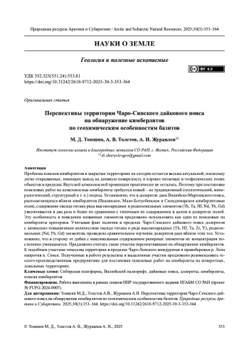 Проблема поисков кимберлитов в закрытых территориях на сегодня остается весьма актуальной, поскольку легко открываемых, имеющих выход на дневную поверхность и хорошо читаемых в геофизических полях объектов в пределах Якутской алмазоносной провинции практически не осталось. Поэтому при постановке поисковых работ на алмазоносные кимберлиты требуется новый – не традиционный (геологический, минералогический, структурный и т. п.) подход. Установлено, что в долеритах даек Вилюйско-Мархинского пояса, располагающихся вблизи кимберлитов (Накынское, Мало-Ботуобинское и Сюльдюкарское кимберлитовые поля), содержание оксида титана ряда высокозарядных и редкоземельных элементов (Th, Ta, Hf, Nd, Tb, Gd) увеличивается в два раза и более по сравнению с типичным их содержанием в целом в долеритах полей. Эту особенность в поведении названных элементов предложено использовать как один из поисковых на кимберлиты критериев. Учитывая факт наличия в пределах Чаро-Синского дайкового пояса долеритов с аномально повышенным количеством оксида титана и ряда высокозарядных (Th, Hf, Ta, Zr, Y), редкоземельных (Nd, Tb, Gd) элементов, проведено сравнительное изучение долеритов даек вблизи этих тел. Установлено, что в сторону от дайки с максимальным содержанием реперных элементов их концентрация постепенно уменьшается. Предложено считать такие участки перспективными на обнаружение кимберлитов. К подобным участкам отнесены территории в пределах Чаро-Ленского междуречья и правобережья р. Лена напротив п. Синск. Полученные в работе результаты и выделенные участки предложено рекомендовать геолого-производственным предприятиям для постановки поисковых работ на кимберлиты на конкретных, локальных территориях.