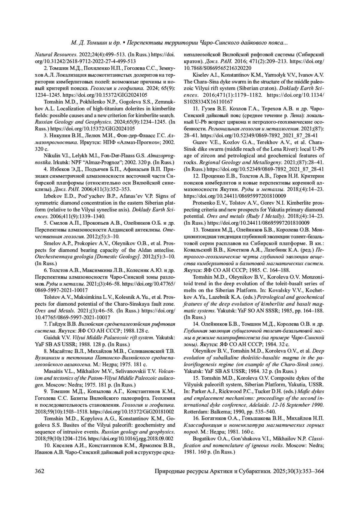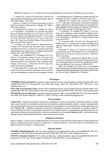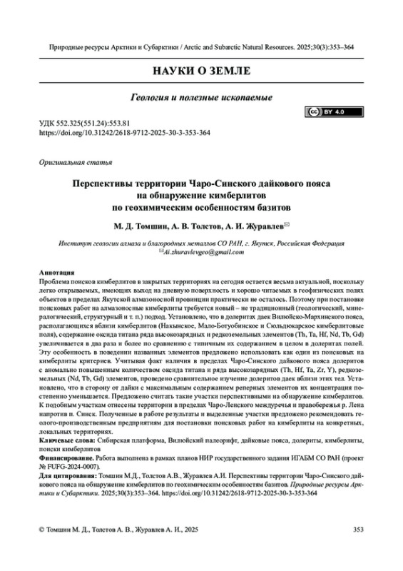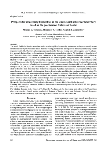 2. Томшин М.Д., Похиленко Н.П., Гоголева С.С., Земнухов А.Л. Локализация высокотитанистых долеритов на территории кимберлитовых полей: возможные причины и новый критерий поиска. Геология и геофизика. 2024; 65(9): 1234-1245. DOI: 10.15372/GIG2024105