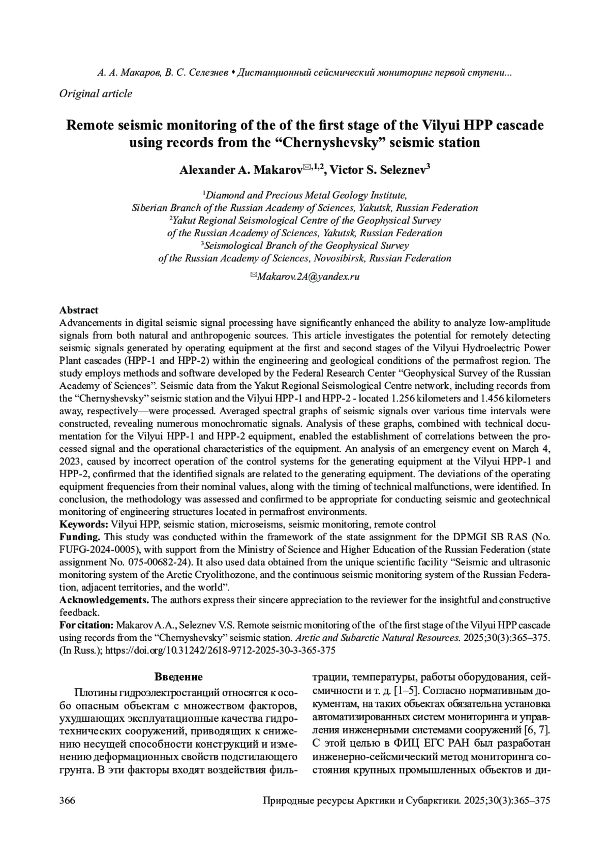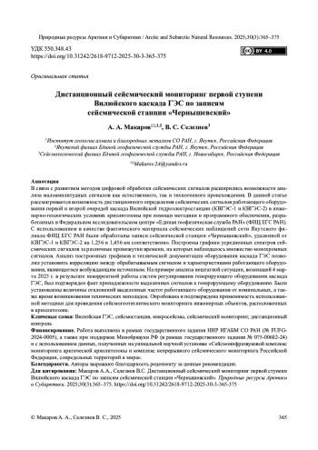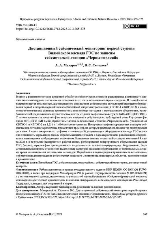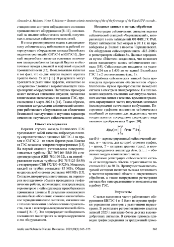 В связи с развитием методов цифровой обработки сейсмических сигналов расширились возможности анализа малоамплитудных сигналов как естественного, так и техногенного происхождения. В данной статье рассматривается возможность дистанционного определения сейсмических сигналов работающего оборудования первой и второй очередей каскада Вилюйской гидроэлектростанции (КВГЭС-1 и КВГЭС-2) в инженерно-геологических условиях криолитозоны при помощи методики и программного обеспечения, разработанных в Федеральном исследовательском центре «Единая геофизическая служба РАН» (ФИЦ ЕГС РАН). С использованием в качестве фактического материала сейсмических наблюдений сети Якутского филиала ФИЦ ЕГС РАН были обработаны записи сейсмической станции «Чернышевский», удаленной от КВГЭС-1 и КВГЭС-2 на 1,256 и 1,456 км соответственно. Построены графики усредненных спектров сейсмических сигналов за различные промежутки времени, на которых наблюдалось множество монохромных сигналов. Анализ построенных графиков и технической документации оборудования каскада ГЭС позволил установить корреляцию между обрабатываемым сигналом и характеристиками работающего оборудования, являющегося возбуждающим источником. На примере анализа нештатной ситуации, возникшей 4 марта 2023 г. в результате некорректной работы систем регулирования генерирующего оборудования каскада ГЭС, был подтвержден факт принадлежности выделенных сигналов к генерирующему оборудованию. Были установлены величины отклонений выделенных частот работающего оборудования от номинальных, а также время возникновения технических неполадок. Опробована и подтверждена применимость использованной методики для проведения сейсмогеотехнического мониторинга инженерных объектов, расположенных в криолитозоне.
