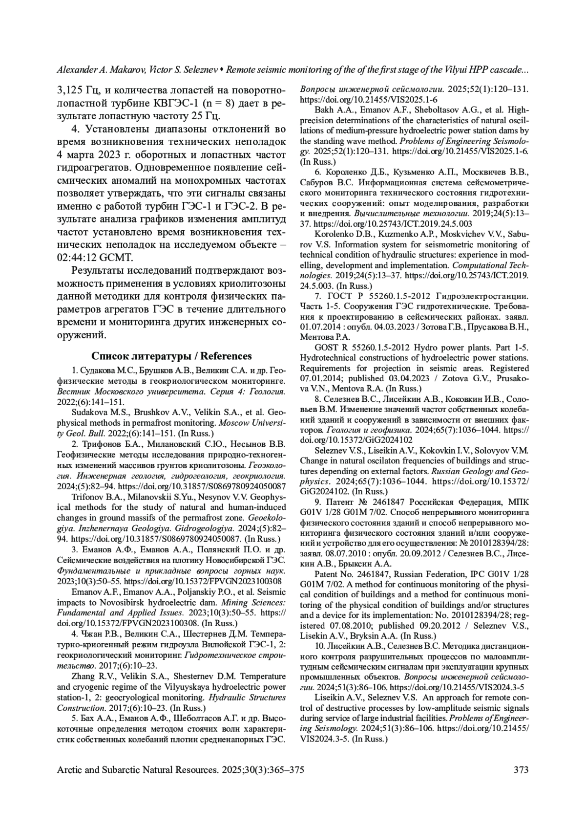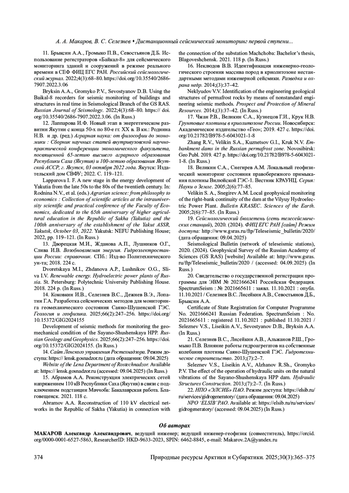14. Коковкин И.В., Селезнев В.С., Дежнев В.Э., Лопатин Г.А. Разработка сейсмических методов для мониторинга геомеханического состояния Саяно-Шушенской ГЭС. Геология и геофизика. 2025;66(2):247-256. DOI: 10.15372/GIG2024155