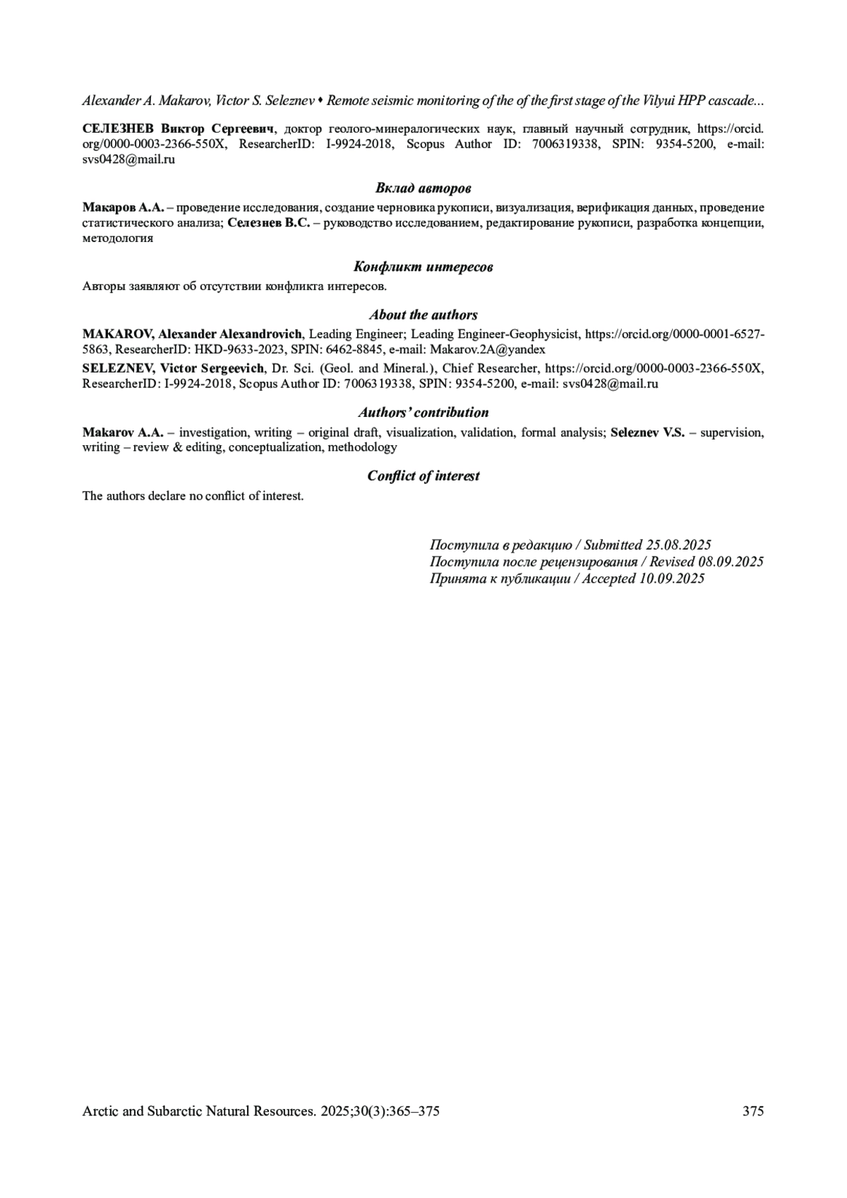 1. Судакова М.С., Брушков А.В., Великин С.А. и др. Геофизические методы в геокриологическом мониторинге. Вестник Московского университета. Серия 4: Геология. 2022;(6):141-151.