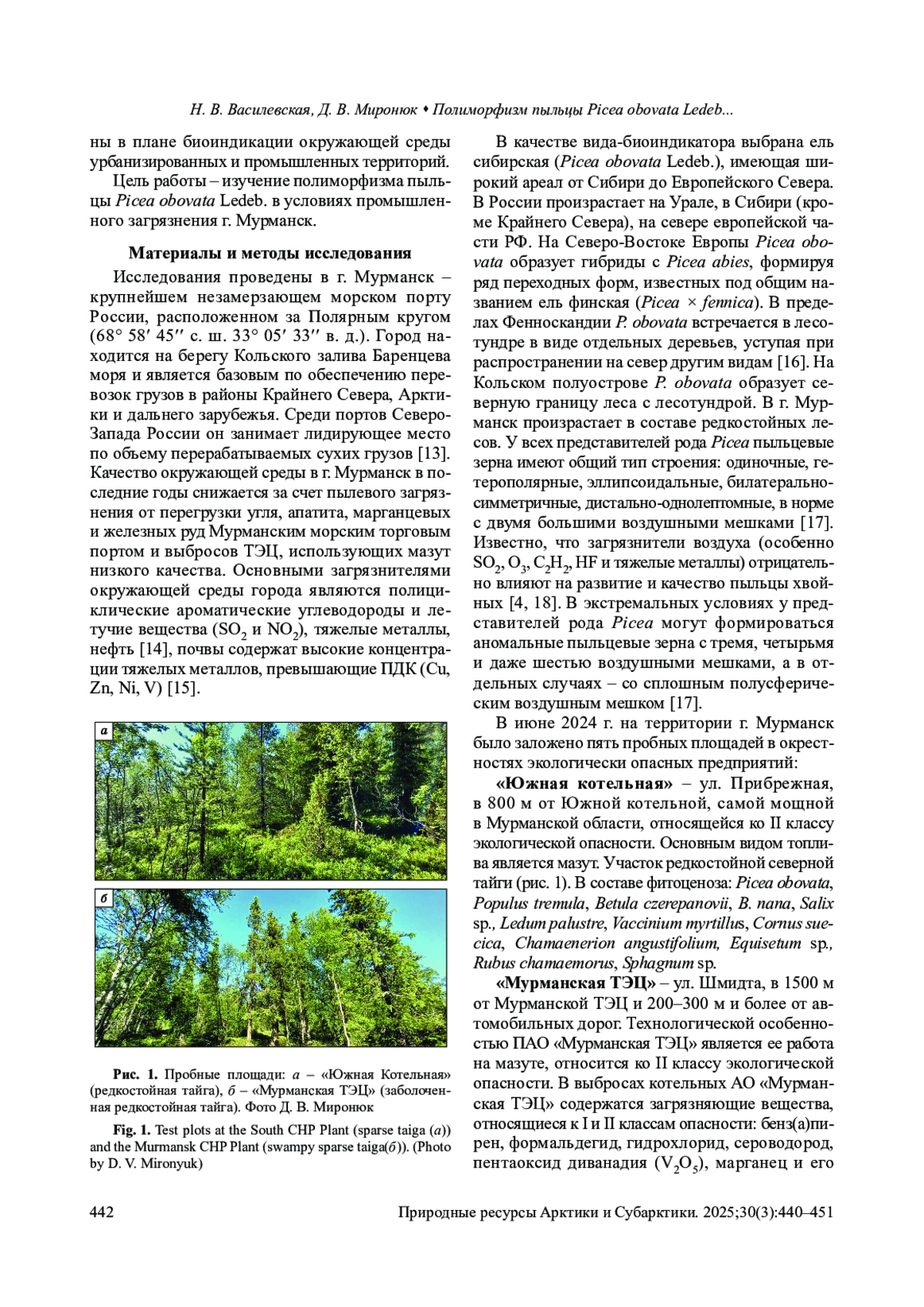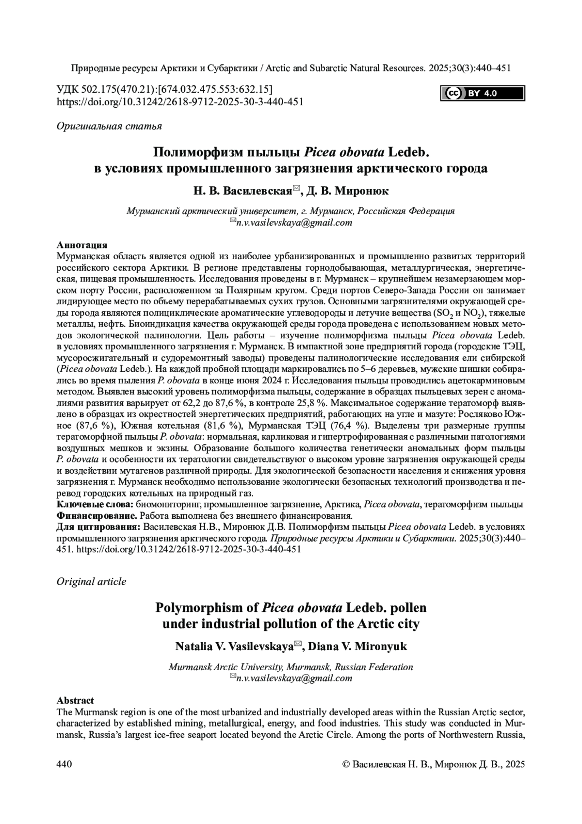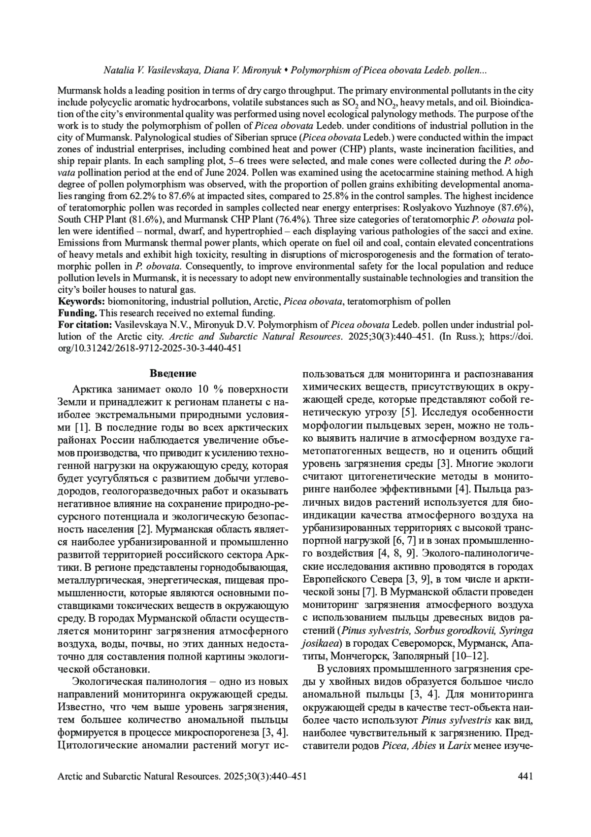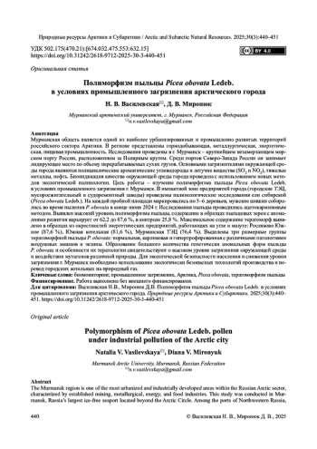 Мурманская область является одной из наиболее урбанизированных и промышленно развитых территорий российского сектора Арктики. В регионе представлены горнодобывающая, металлургическая, энергетическая, пищевая промышленность. Исследования проведены в г. Мурманск – крупнейшем незамерзающем морском порту России, расположенном за Полярным кругом. Среди портов Северо-Запада России он занимает лидирующее место по объему перерабатываемых сухих грузов. Основными загрязнителями окружающей среды города являются полициклические ароматические углеводороды и летучие вещества (SO2 и NO2), тяжелые металлы, нефть. Биоиндикация качества окружающей среды города проведена с использованием новых методов экологической палинологии. Цель работы – изучение полиморфизма пыльцы Picea obovata Ledeb. в условиях промышленного загрязнения г. Мурманск. В импактной зоне предприятий города (городские ТЭЦ, мусоросжигательный и судоремонтный заводы) проведены палинологические исследования ели сибирской (Picea obovata Ledeb.). На каждой пробной площади маркировались по 5–6 деревьев, мужские шишки собирались во время пыления P. obovata в конце июня 2024 г. Исследования пыльцы проводились ацетокарминовым методом. Выявлен высокий уровень полиморфизма пыльцы, содержание в образцах пыльцевых зерен с аномалиями развития варьирует от 62,2 до 87,6 %, в контроле 25,8 %. Максимальное содержание тератоморф выявлено в образцах из окрестностей энергетических предприятий, работающих на угле и мазуте: Росляково Южное (87,6 %), Южная котельная (81,6 %), Мурманская ТЭЦ (76,4 %). Выделены три размерные группы тератоморфной пыльцы P. obovatа: нормальная, карликовая и гипертрофированная с различными патологиями воздушных мешков и экзины. Образование большого количества генетически аномальных форм пыльцы P. obovata и особенности их тератологии свидетельствуют о высоком уровне загрязнения окружающей среды и воздействии мутагенов различной природы. Для экологической безопасности населения и снижения уровня загрязнения г. Мурманск необходимо использование экологически безопасных технологий производства и перевод городских котельных на природный газ.