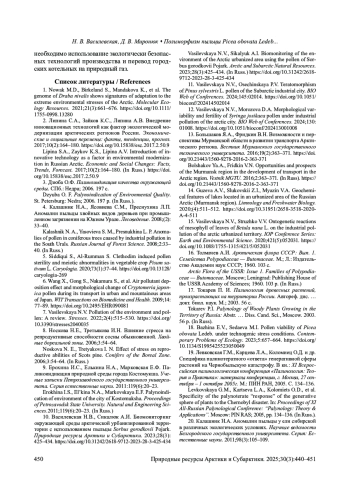 12. Vasilevskaya N.V., Morozova D.A. Morphological variability and fertility of Syringa josikaea pollen under industrial pollution of the arctic city. BIO Web of Conferences. 2024;130: 01008. DOI: 10.1051/bioconf/202413001008