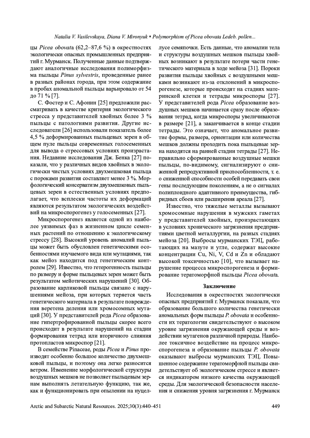 11. Vasilevskaya N.V., Osechinskaya P.V. Teratomorphism of Pinus sylvestris L. pollen of the Subarctic industrial city. BIO Web of Conferences. 2024;145:02014. DOI: 10.1051/bioconf/202414502014