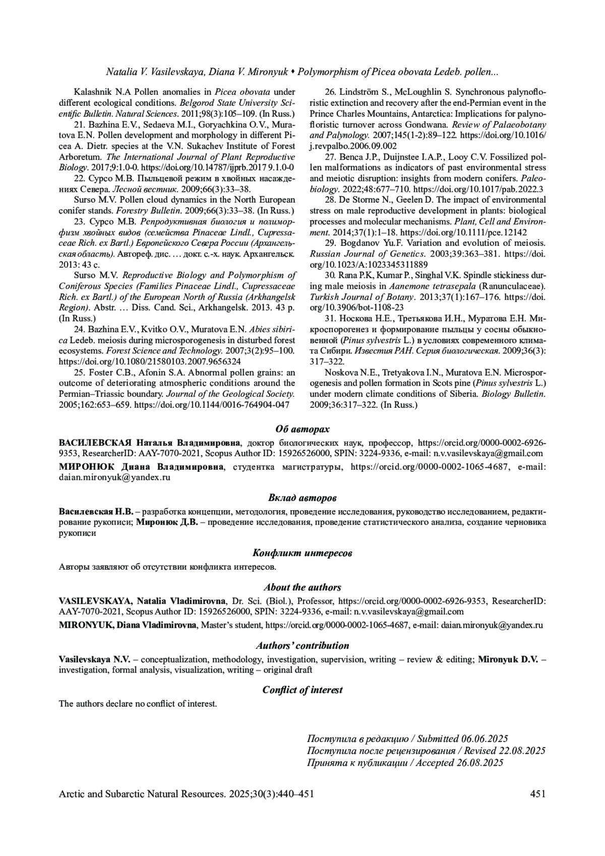 10. Василевская Н.В., Сикалюк А.И. Биомониторинг окружающей среды арктической урбанизированной территории с использованием пыльцы Sorbus gorodkovii Pojark. Природные ресурсы Арктики и Субарктики. 2023;28(3): 425-434. DOI: 10.31242/2618-9712-2023-28-3-425-434
