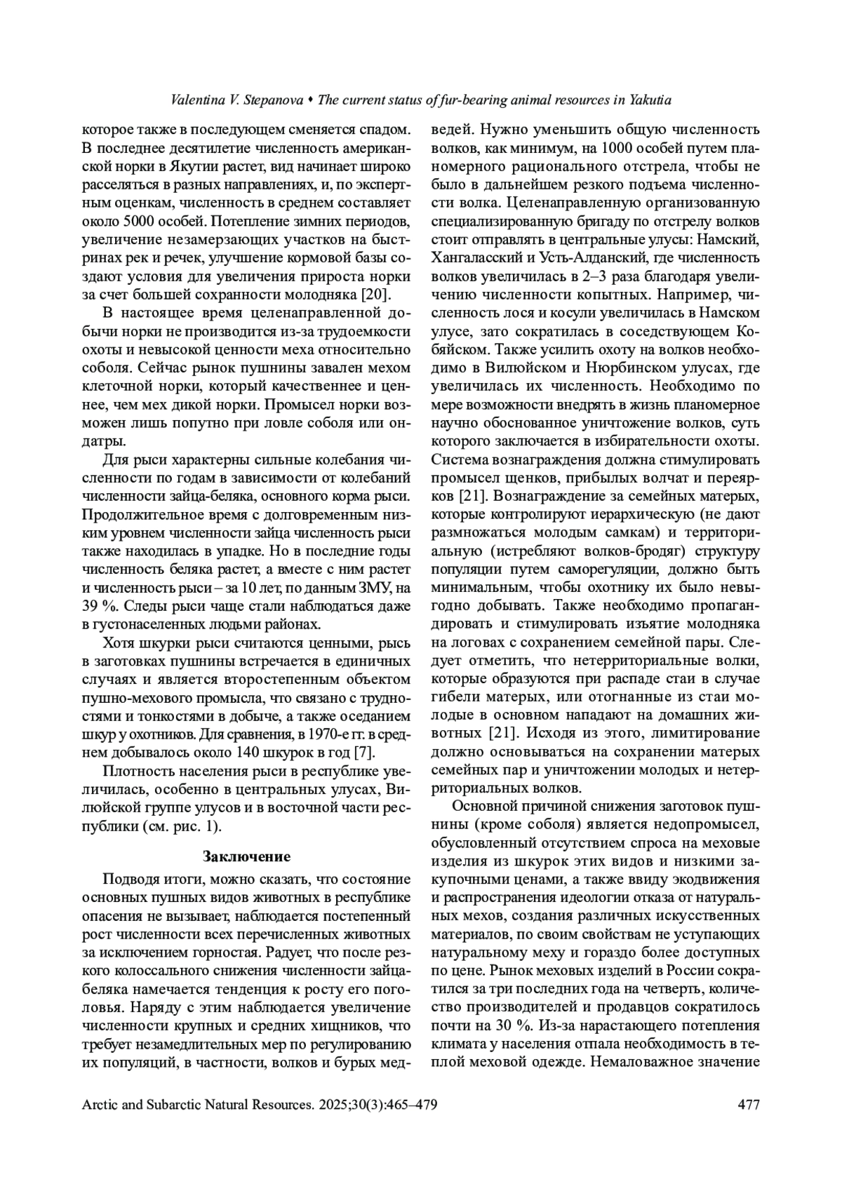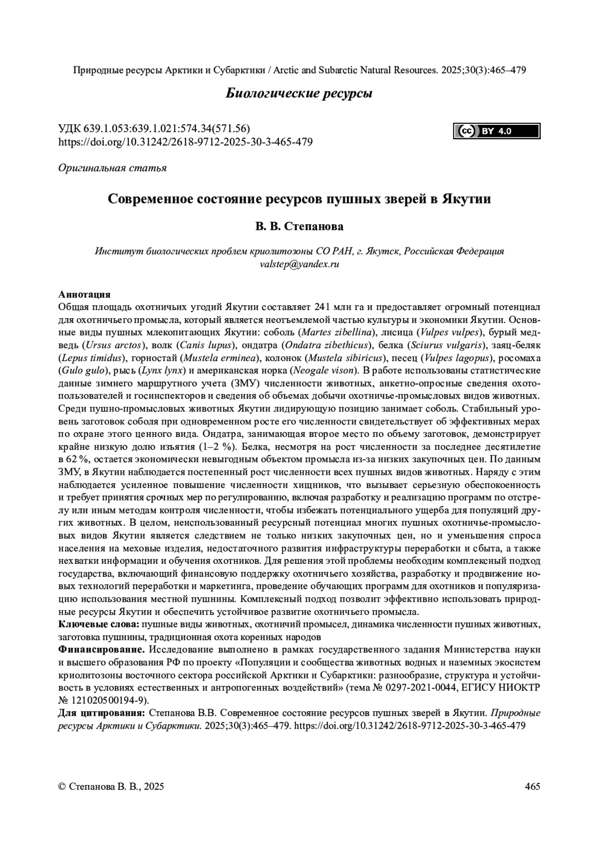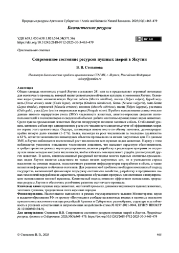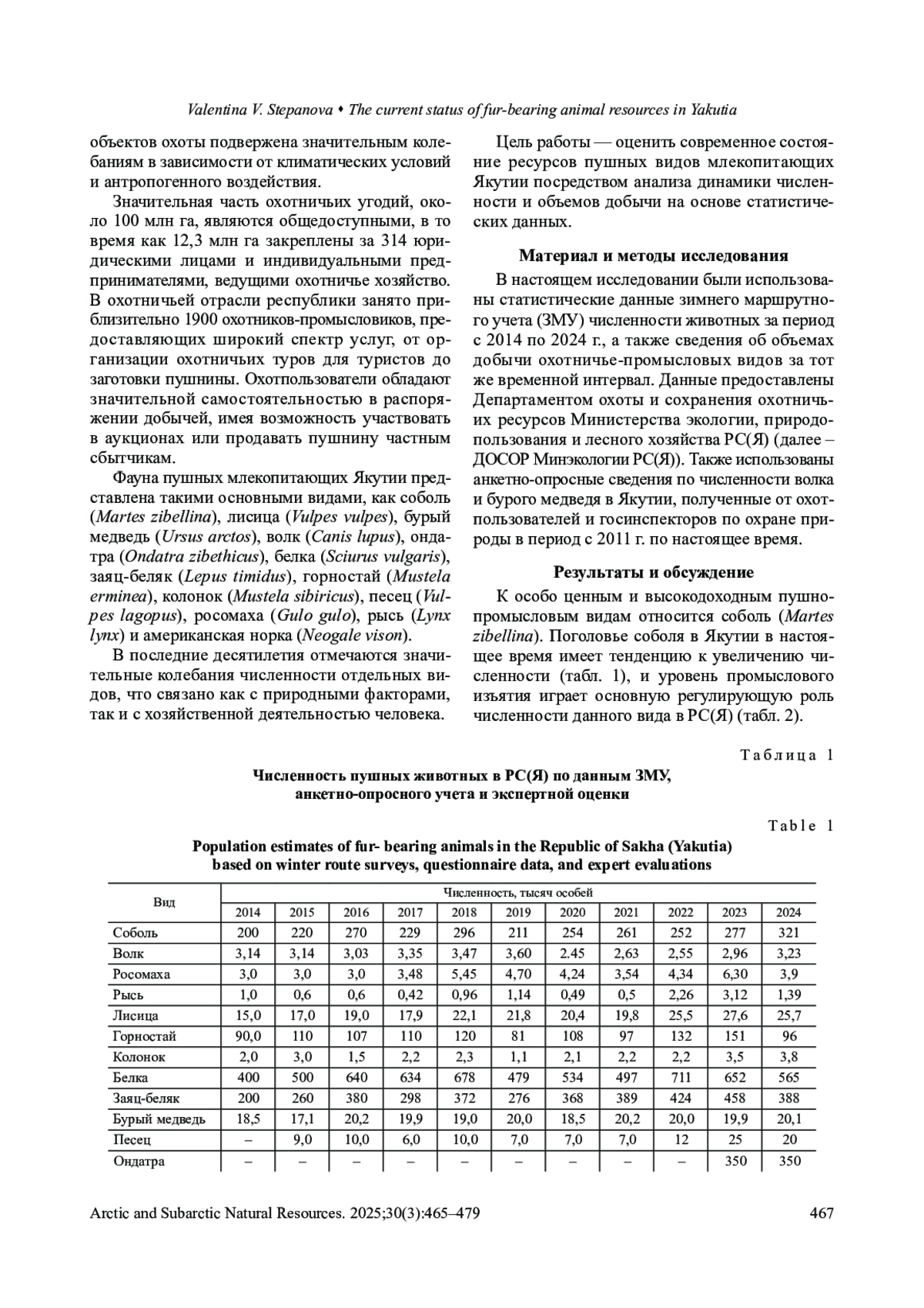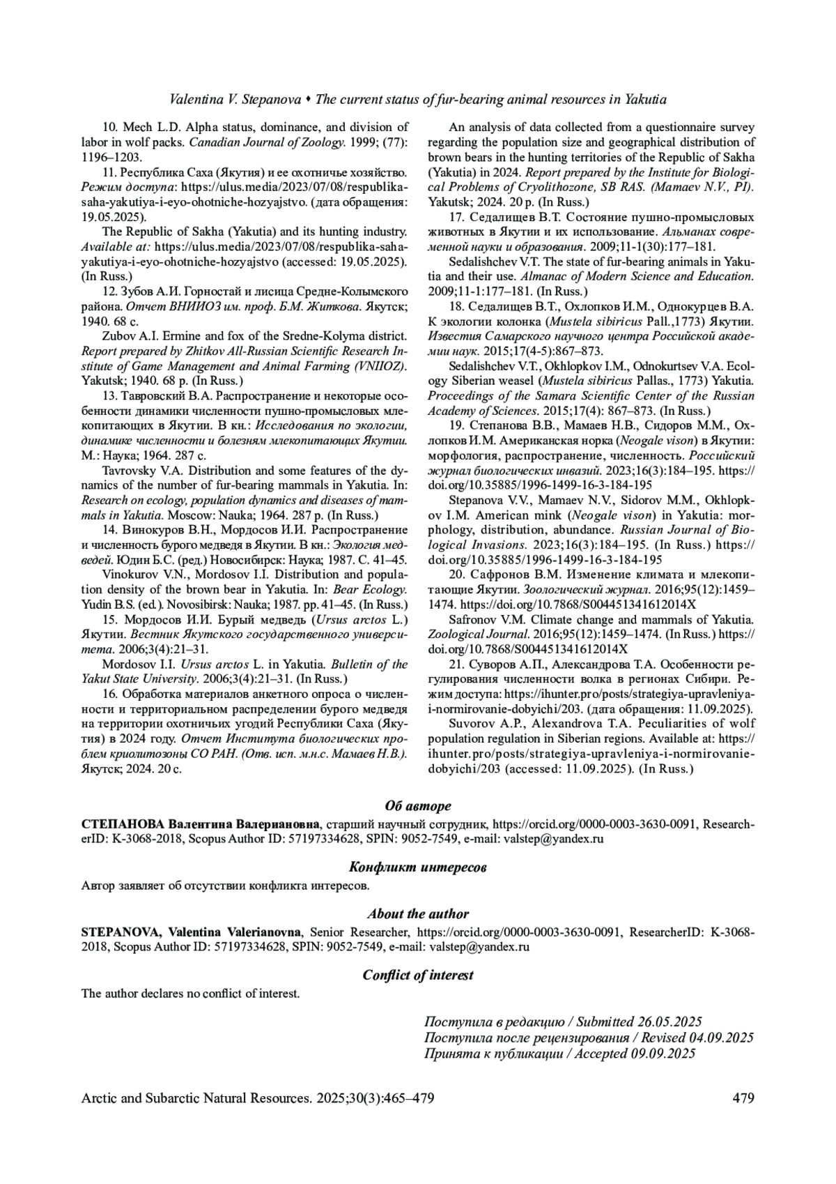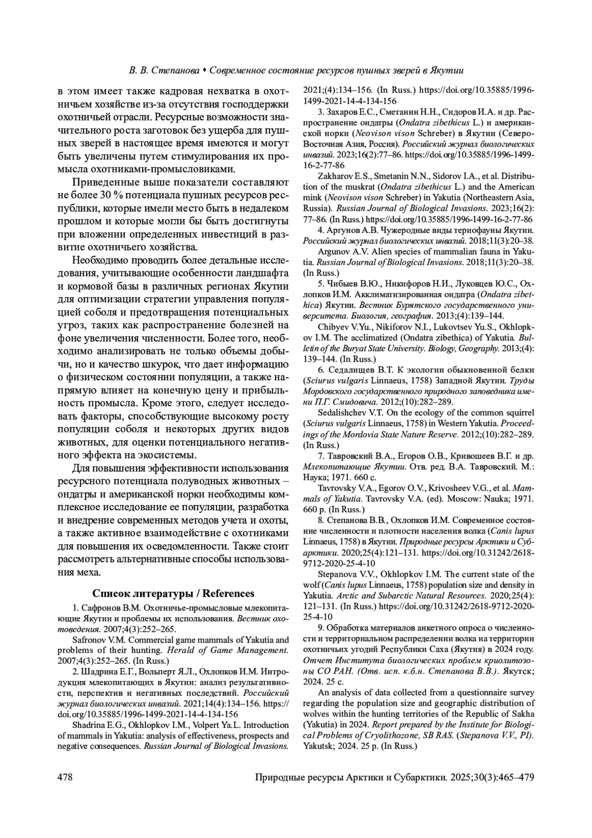 1. Сафронов В.М. Охотничье-промысловые млекопитающие Якутии и проблемы их использования. Вестник охотоведения. 2007;4(3):252-265.