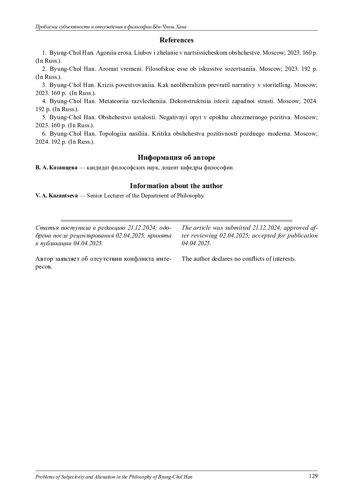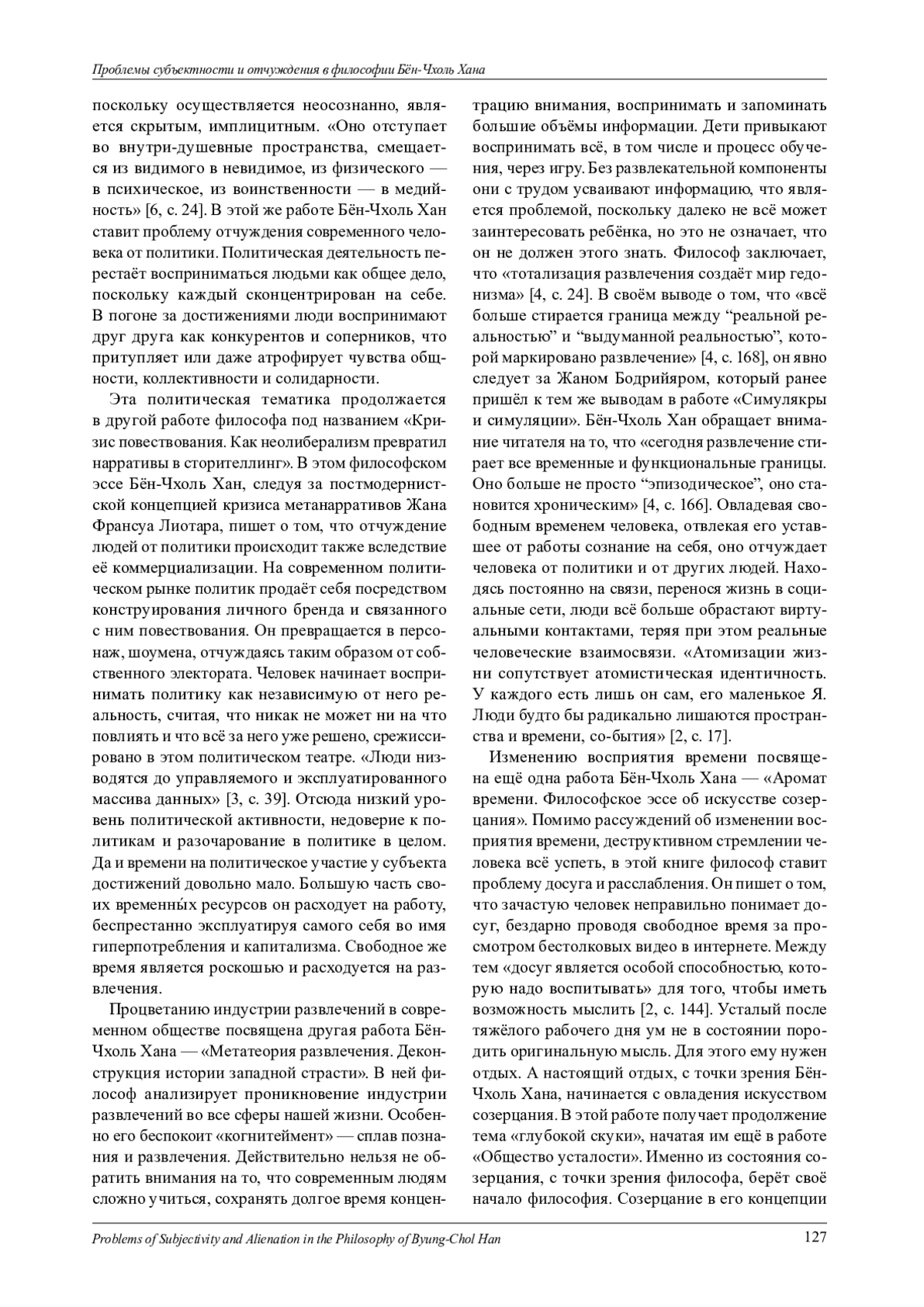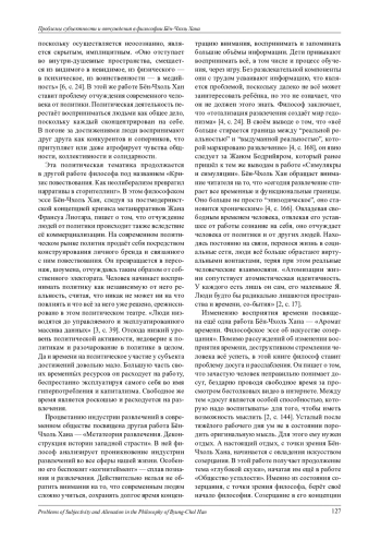 Рассматриваются проблемы субъектности и отчуждения в философии Бён-Чхоль Хана. Анализируются следующие его работы: «Общество усталости», «Агония эроса», «Топология насилия», «Кризис повествования», «Аромат времени» и «Метатеория развлечения». Описываются основные проблемы современного человека и общества, выделенные Бён-Чхоль Ханом в перечисленных произведениях. Обосновывается тезис о том, что проблемы субъектности и отчуждения являются основополагающими для его творчества.