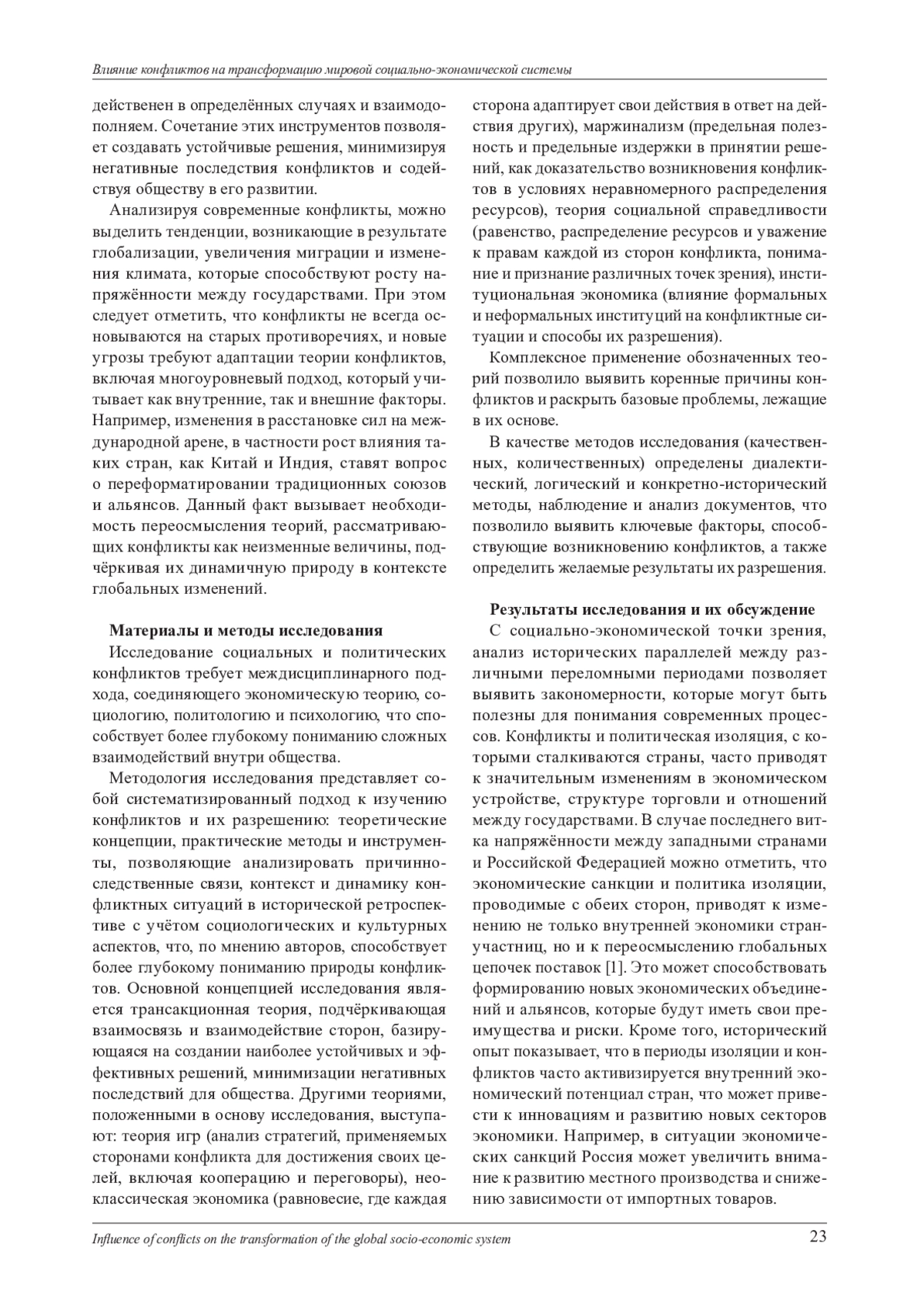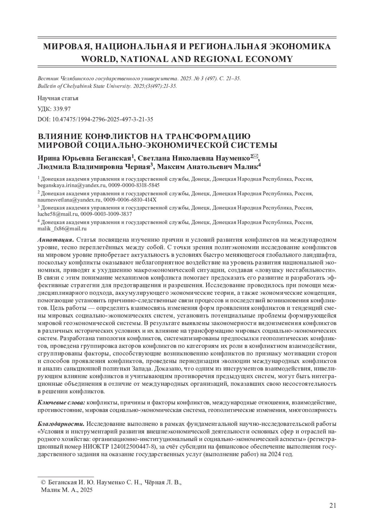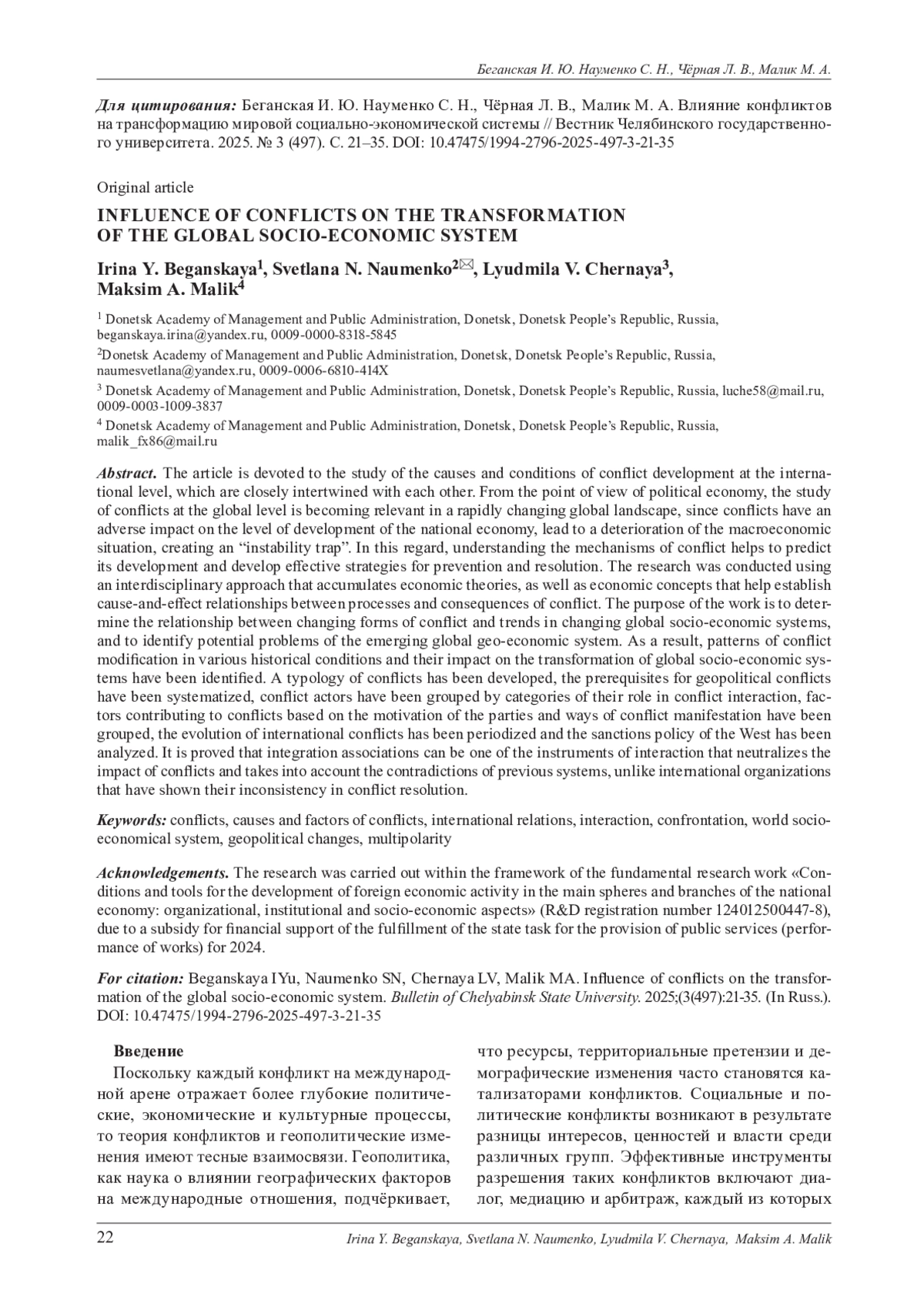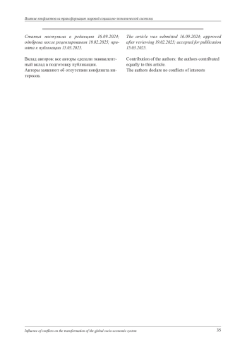 Статья посвящена изучению причин и условий развития конфликтов на международном уровне, тесно переплетённых между собой. С точки зрения политэкономии исследование конфликтов на мировом уровне приобретает актуальность в условиях быстро меняющегося глобального ландшафта, поскольку конфликты оказывают неблагоприятное воздействие на уровень развития национальной экономики, приводят к ухудшению макроэкономической ситуации, создавая «ловушку нестабильности». В связи с этим понимание механизмов конфликта помогает предсказать его развитие и разработать эффективные стратегии для предотвращения и разрешения. Исследование проводилось при помощи междисциплинарного подхода, аккумулирующего экономические теории, а также экономические концепции, помогающие установить причинно-следственные связи процессов и последствий возникновения конфликтов. Цель работы - определить взаимосвязь изменения форм проявления конфликтов и тенденций смены мировых социально-экономических систем, установить потенциальные проблемы формирующейся мировой геоэкономической системы. В результате выявлены закономерности видоизменения конфликтов в различных исторических условиях и их влияние на трансформацию мировых социально-экономических систем. Разработана типология конфликтов, систематизированы предпосылки геополитических конфликтов, проведена группировка акторов конфликтов по категориям их роли в конфликтном взаимодействии, сгруппированы факторы, способствующие возникновению конфликтов по признаку мотивации сторон и способов проявления конфликтов, проведены периодизация эволюции международных конфликтов и анализ санкционной политики Запада. Доказано, что одним из инструментов взаимодействия, нивелирующим влияние конфликтов и учитывающим противоречия предыдущих систем, могут быть интеграционные объединения в отличие от международных организаций, показавших свою несостоятельность в решении конфликтов.