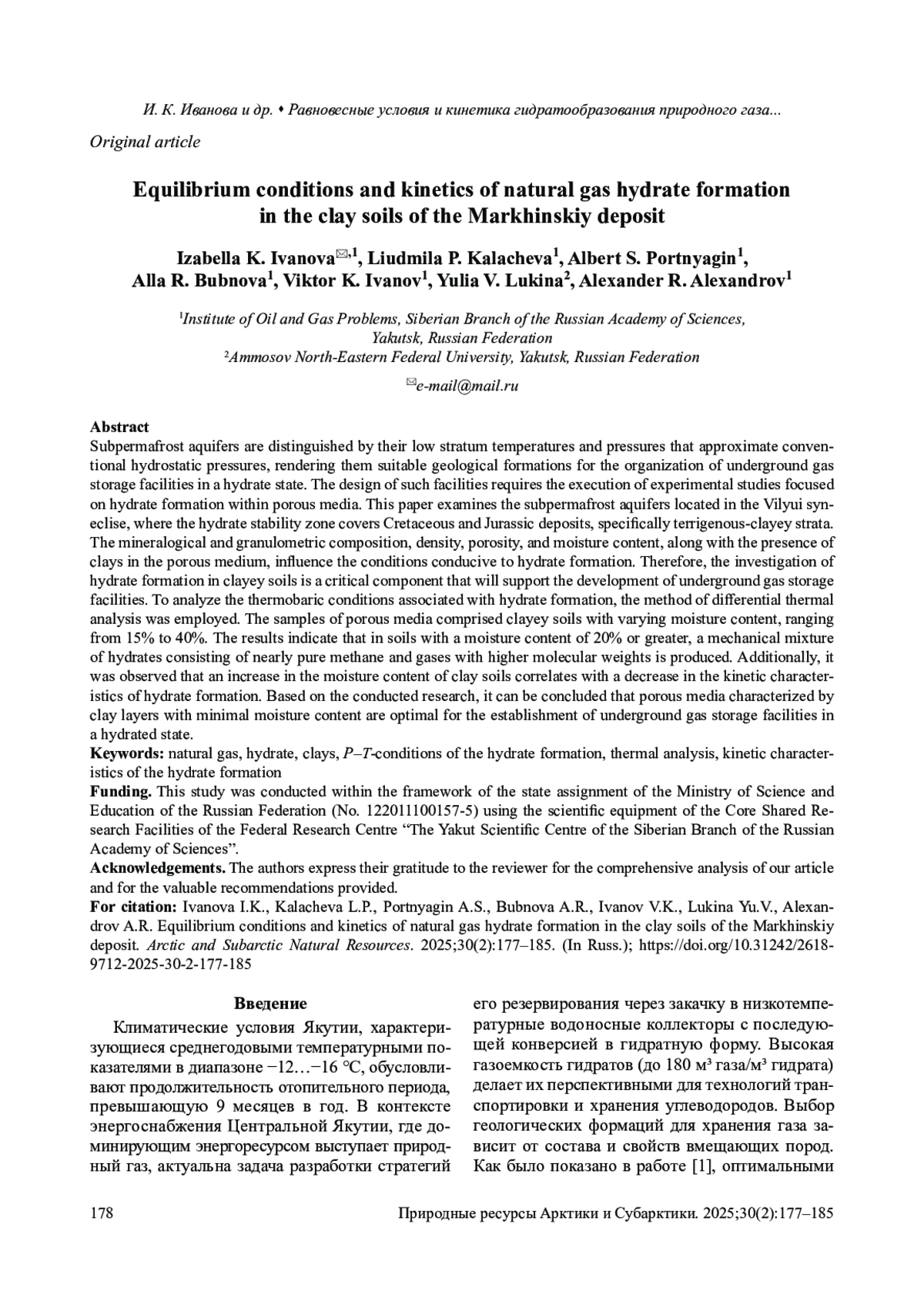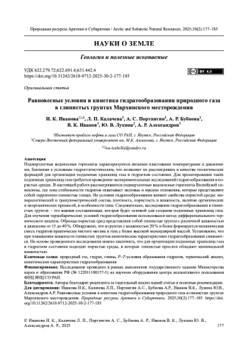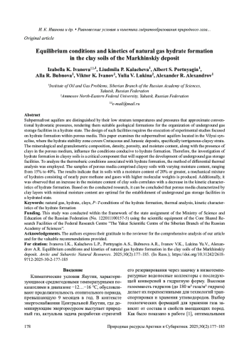 2. Kalacheva L.P., Ivanova I.K., Portnyagin A.S., et al. Determination of the lower boundaries of the natural gas hydrates stability zone in the subpermafrost horizons of the Yakut arch of the Vilyui syneclise, saturated with bicarbonate-sodium type waters. SOCAR Proceedings, Special. 2021;(2):1-11. DOI: 10.5510/OGP2021SI200549