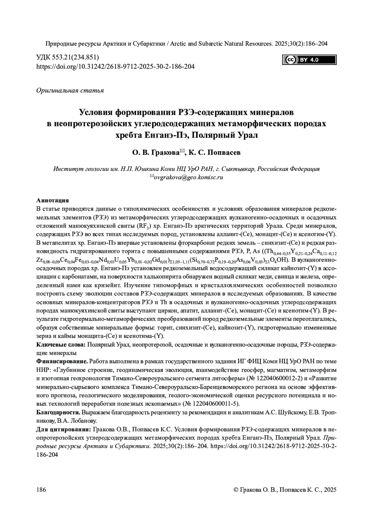 11. Гракова О.В., Попвасев К.С., Уляшева Н.С. Типохимизм и возможные источники исходных компонентов Ce-Cu-Ni-содержащего ферросапонита из метабазитов севера Урала. Природные ресурсы Арктики и Субарктики. 2024;29(3):372-383. DOI: 10.31242/2618-9712-2024-29-3-372-383