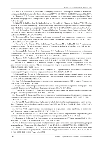 9. Cortez M. R., Johnston W. J., Dastidar G. A. Managing the content of LinkedIn posts: Influence on B2B customer engagement and sales? // Journal of Business Research. 2023. Vol. 155. P. 113388. DOI: 10.1016/j.jbusres.2022.113388 EDN: ZDFTKS