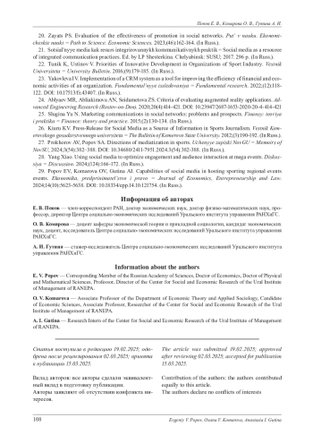 29. Попов Е. В., Комарова О. В., Гутина А. И. Возможности социальных медиа в проведении региональных спортивных мероприятий // Экономика, предпринимательство и право. 2024. Т. 14. № 10. С. 5623-5638. DOI: 10.18334/epp.14.10.121754 EDN: OQJZQV