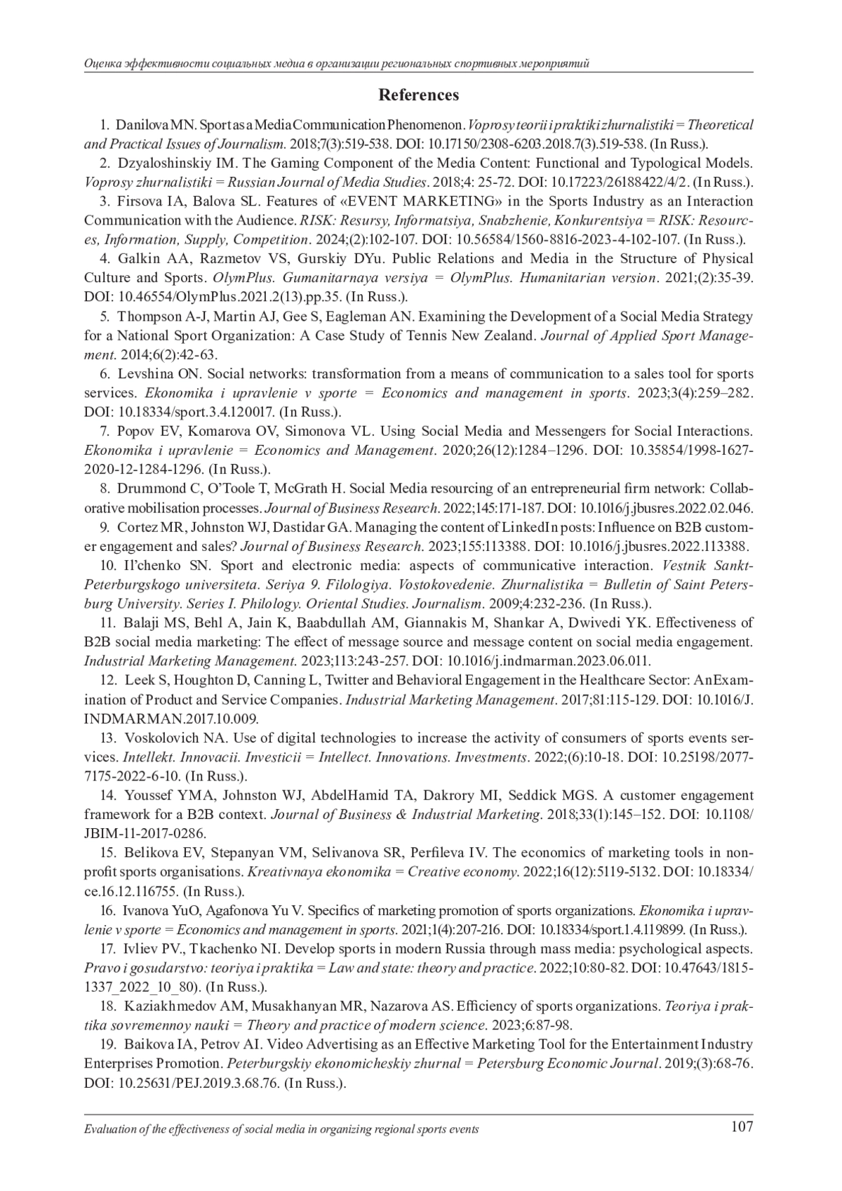 6. Левшина О. Н. Социальные сети: трансформация от средства общения к инструменту продаж спортивных услуг // Экономика и управление в спорте. 2023. Т. 3, № 4. С. 259-282. DOI: 10.18334/sport.3.4.120017 EDN: MQFIZQ